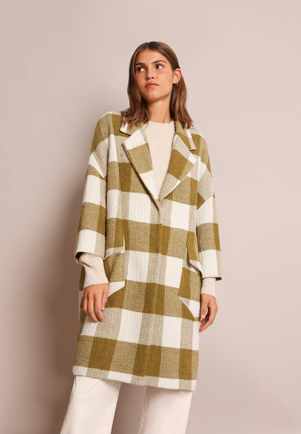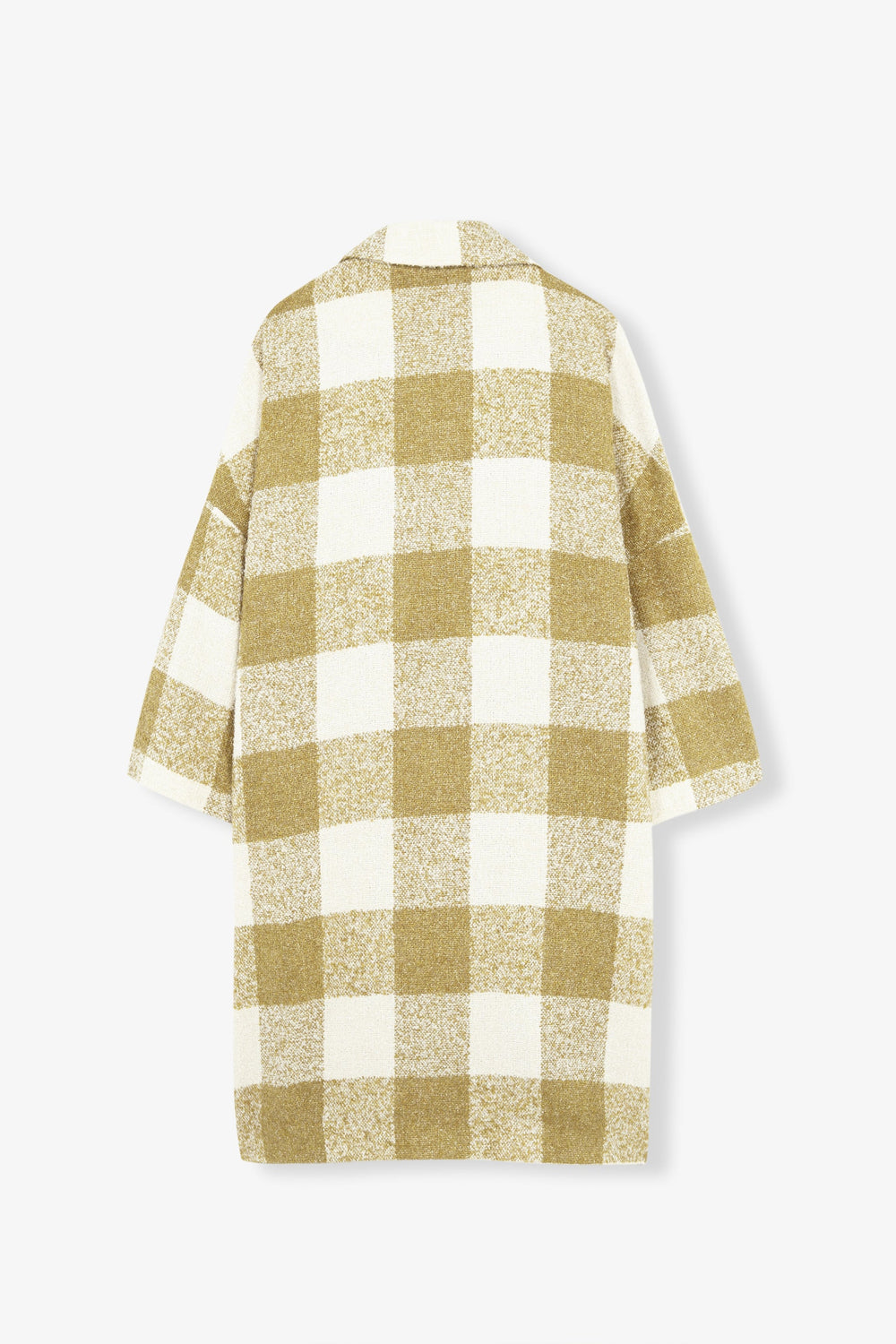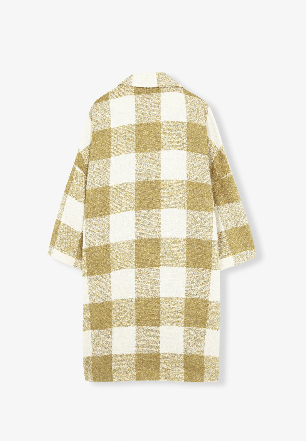 Check cloth coat made of a cotton and wool blend. Slightly oversize, collar with lapels and snap button fastening. Long sleeves and jetted pockets with flap.