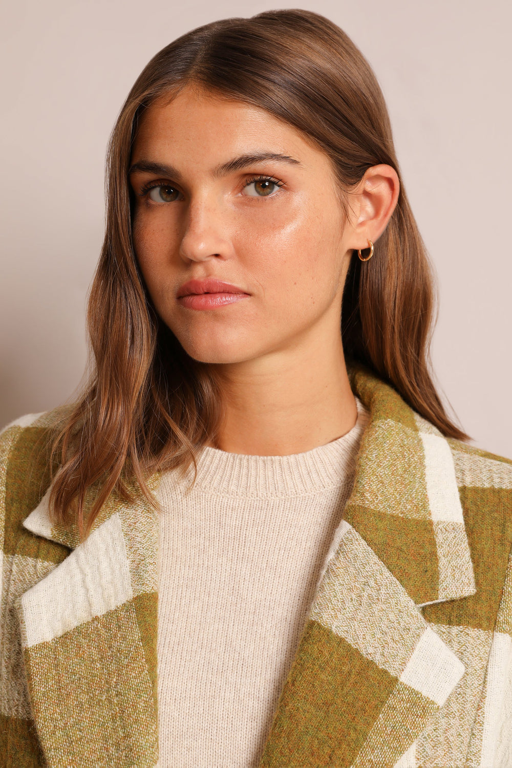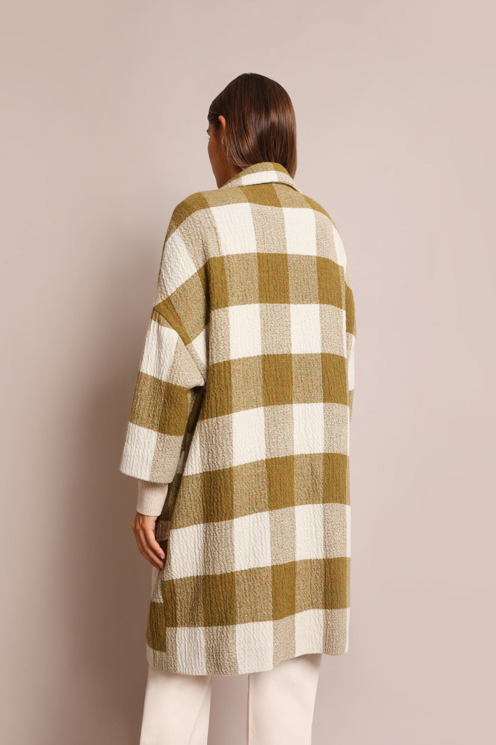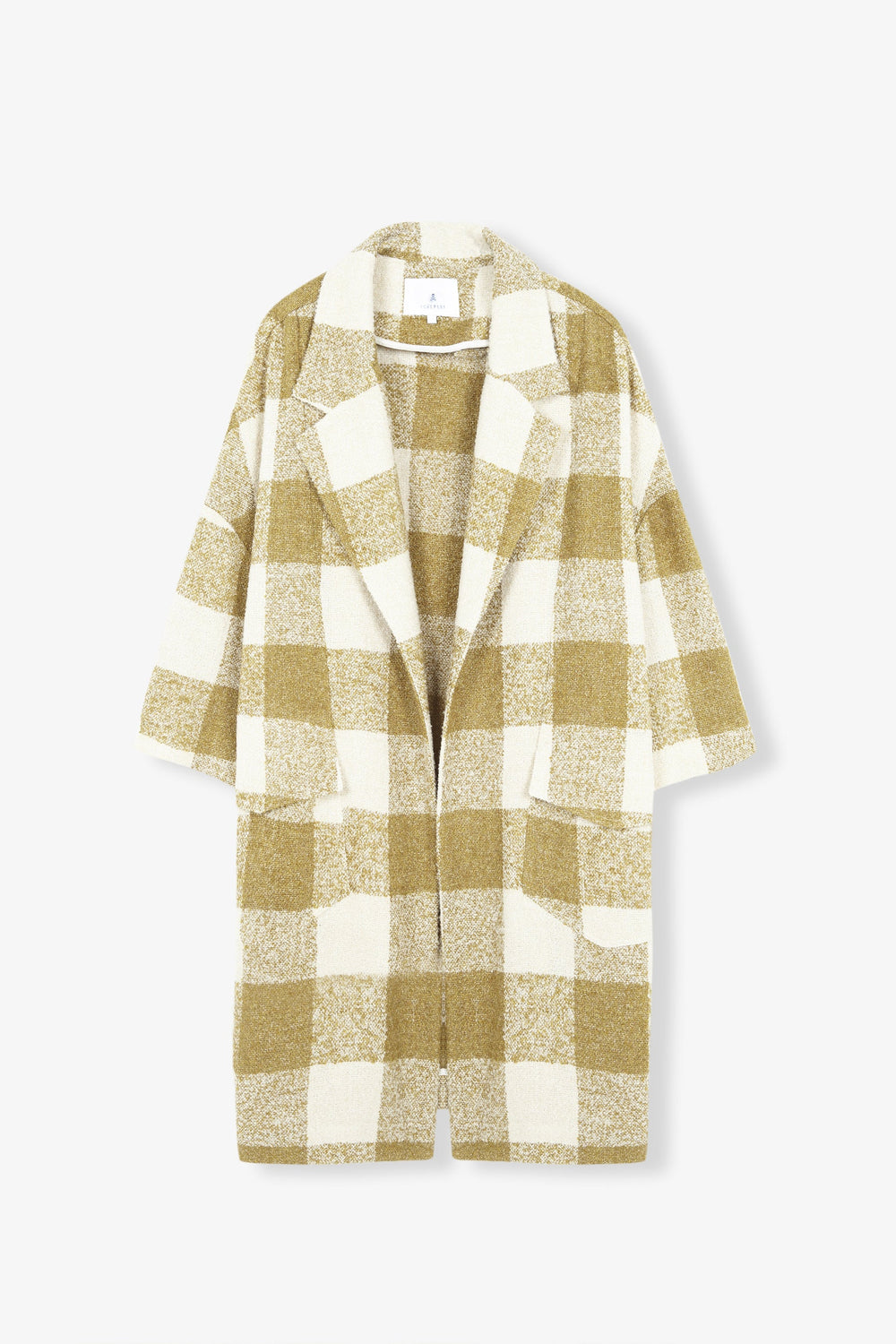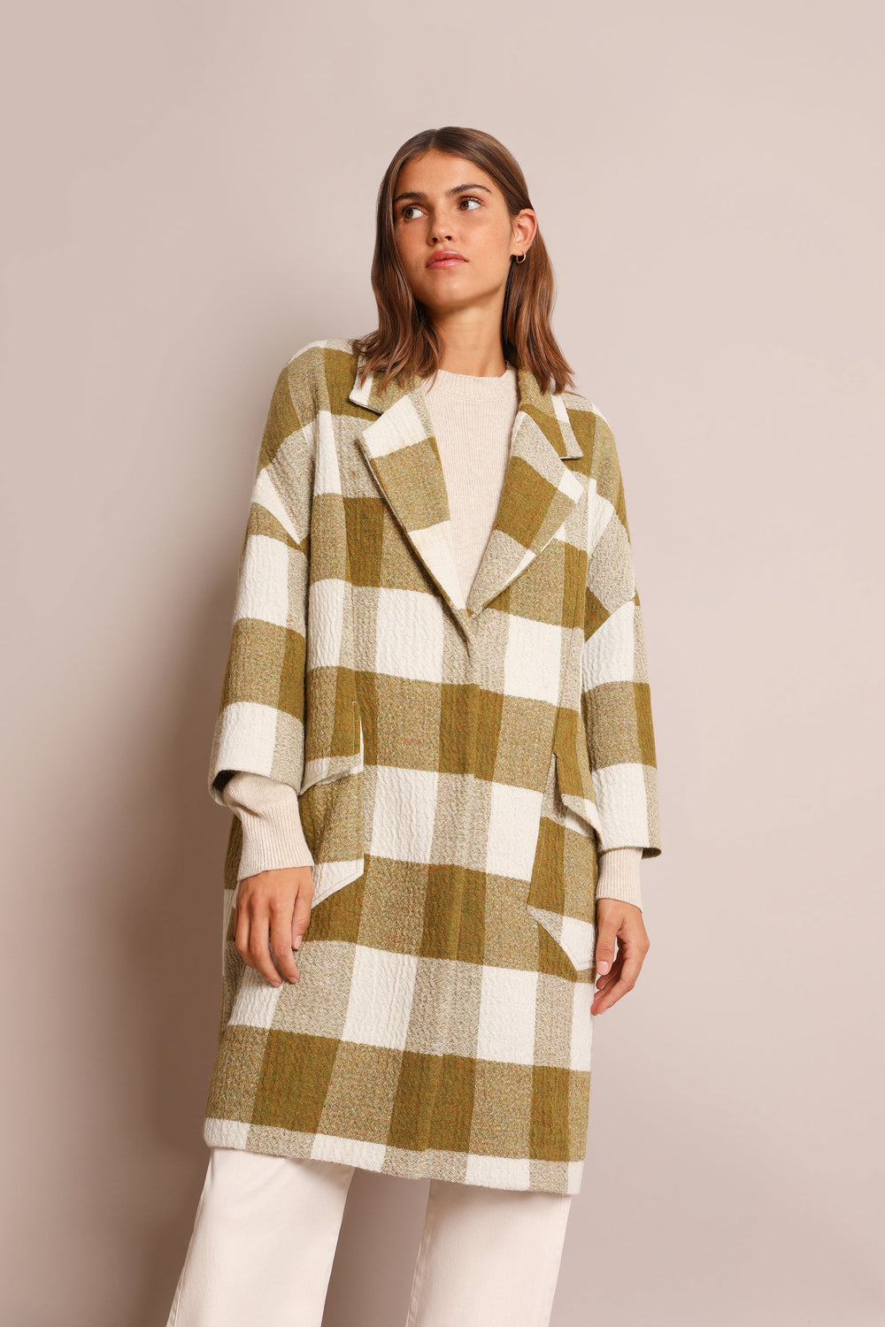 Check cloth coat made of a cotton and wool blend. Slightly oversize, collar with lapels and snap button fastening. Long sleeves and jetted pockets with flap.