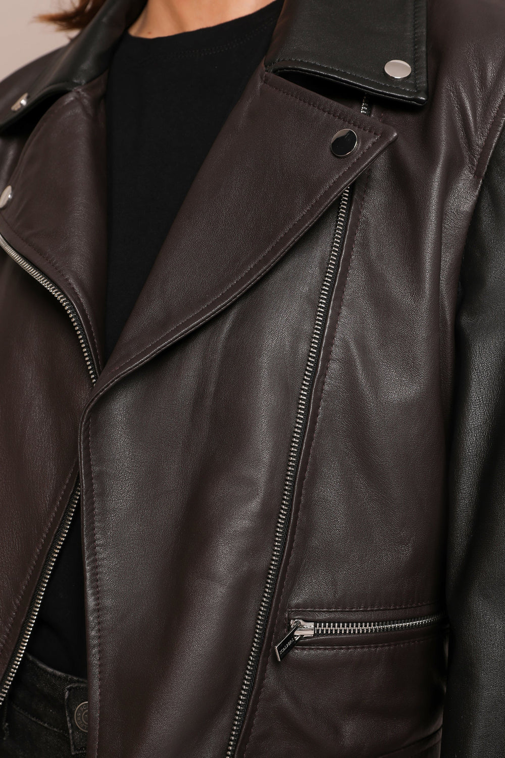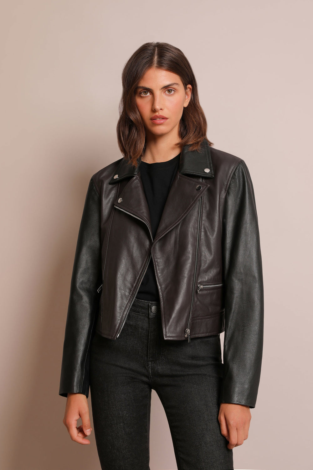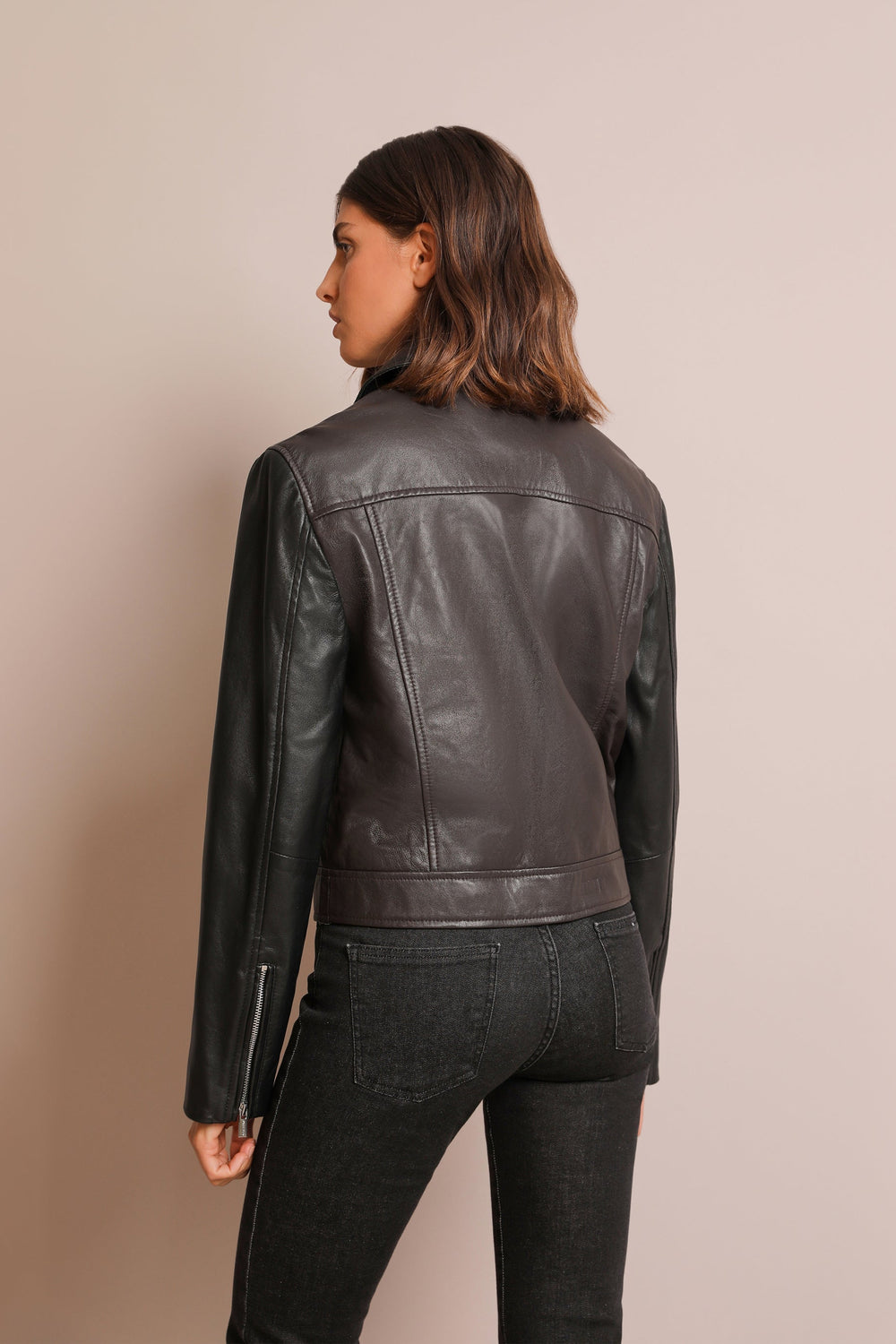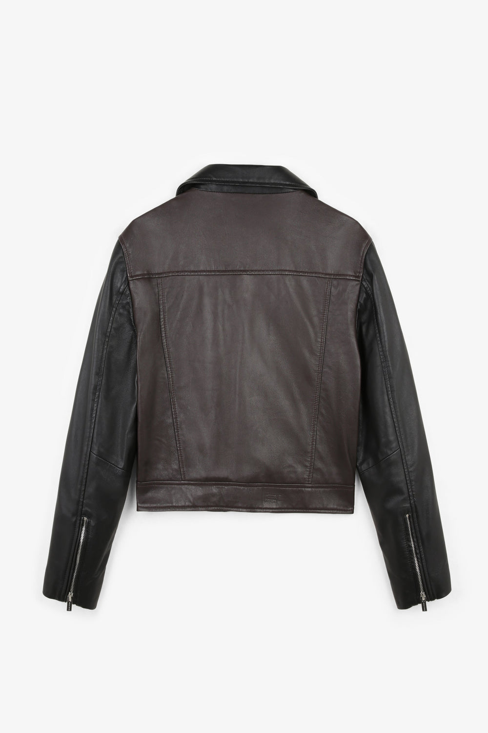 Two-tone biker jacket made of 100% leather. Regular fit, collar with lapels and snap buttons and zip fastening. Long sleeves with zip cuffs and front zipped pockets.