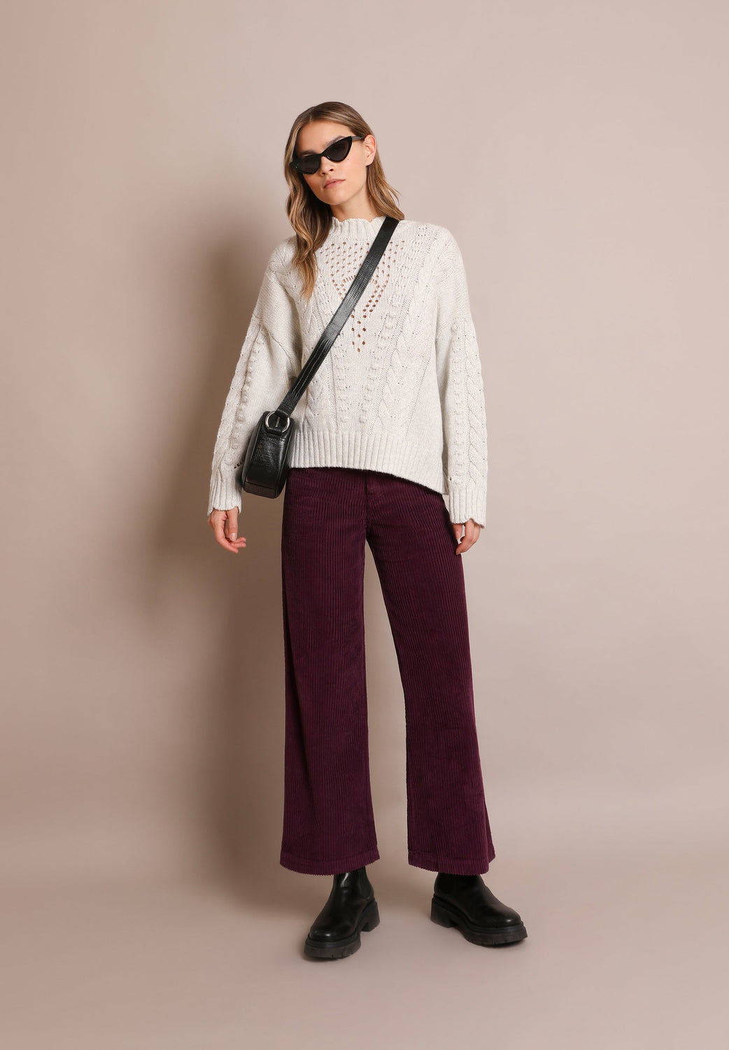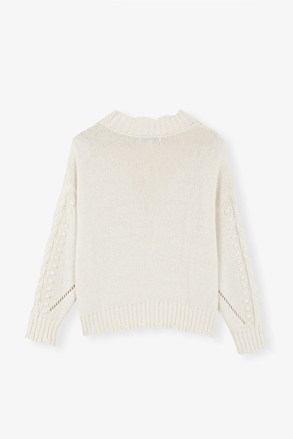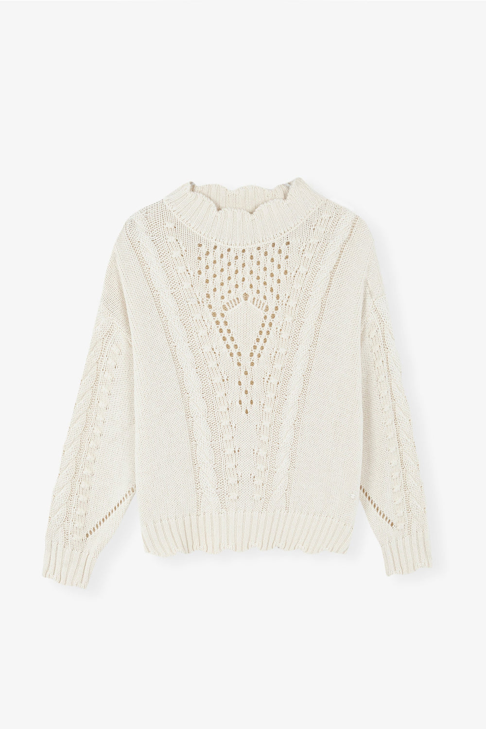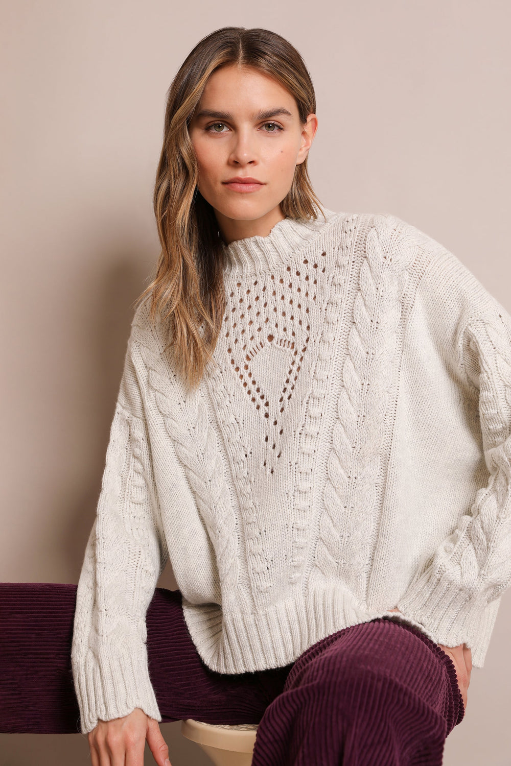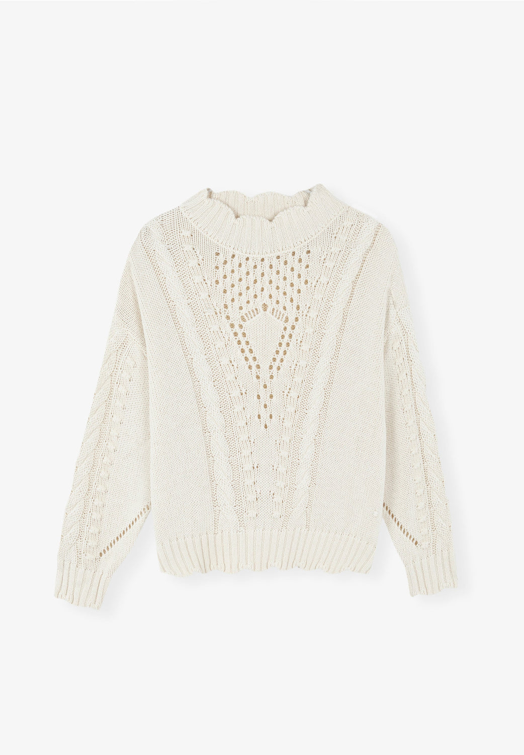 Knit sweater. Made of a cotton and wool fabric, oversize, high neck, long raglan sleeves and cable-knit detail
