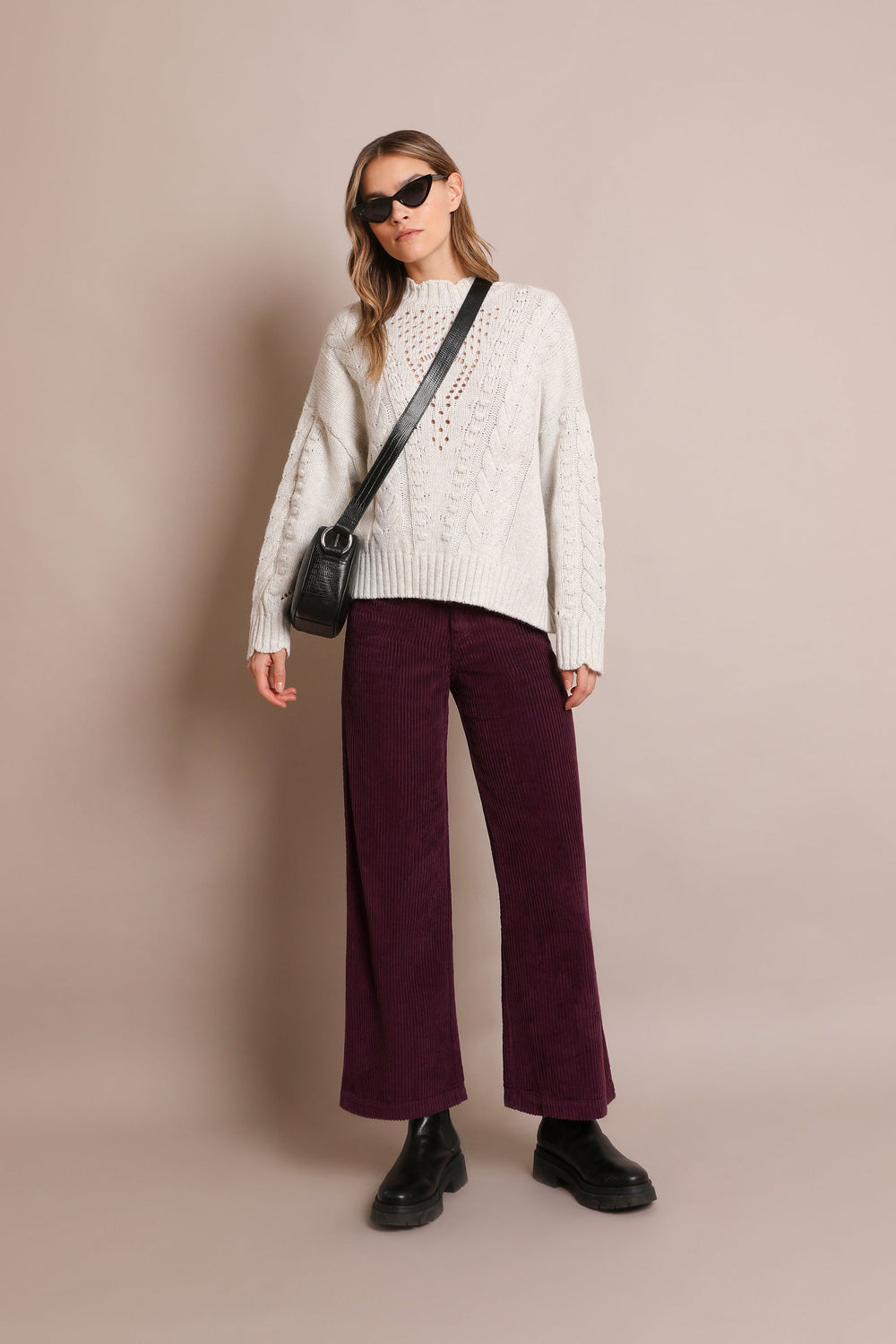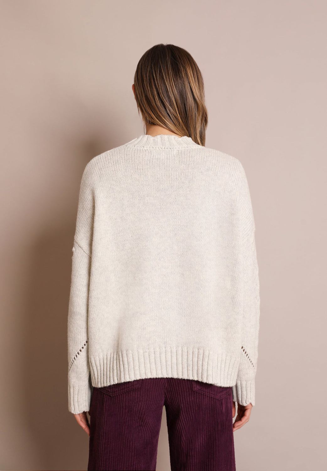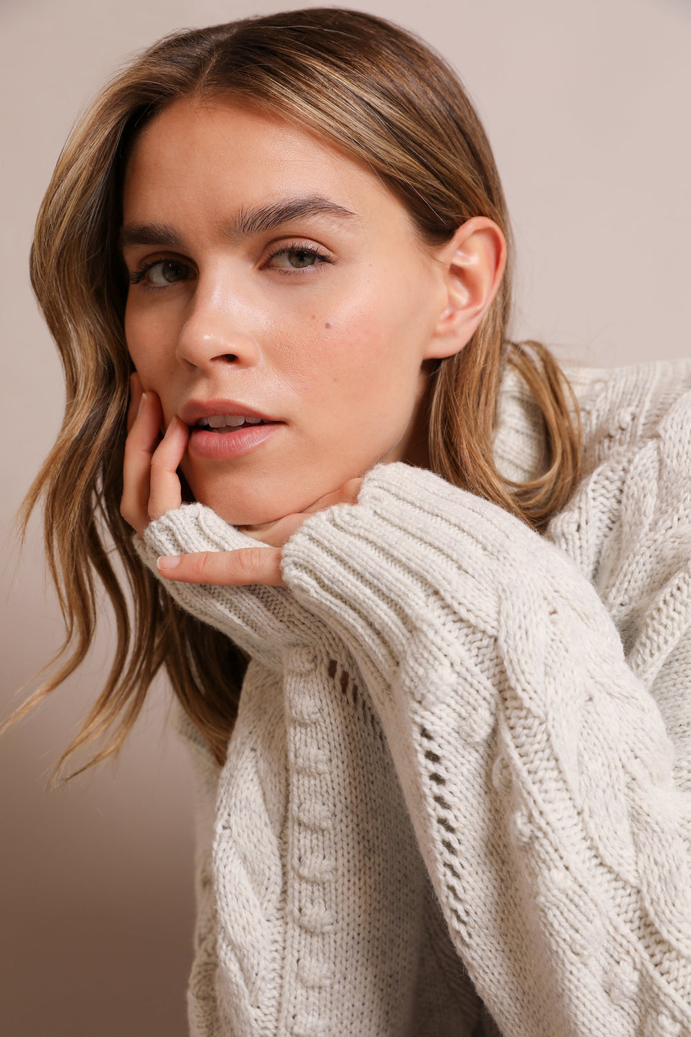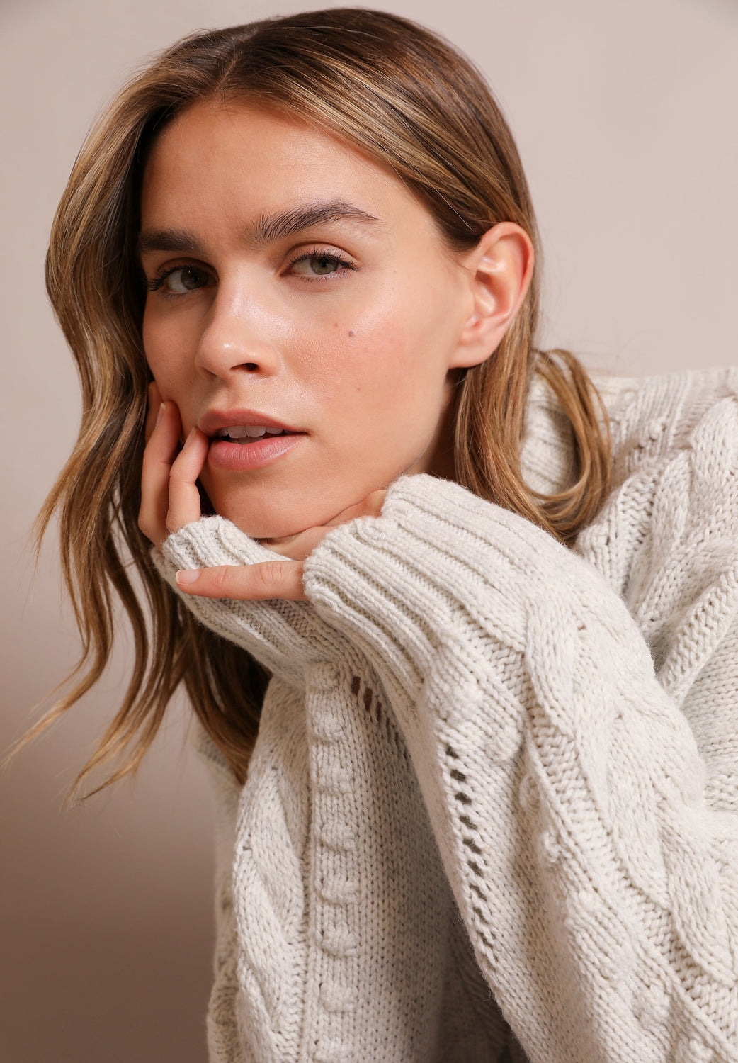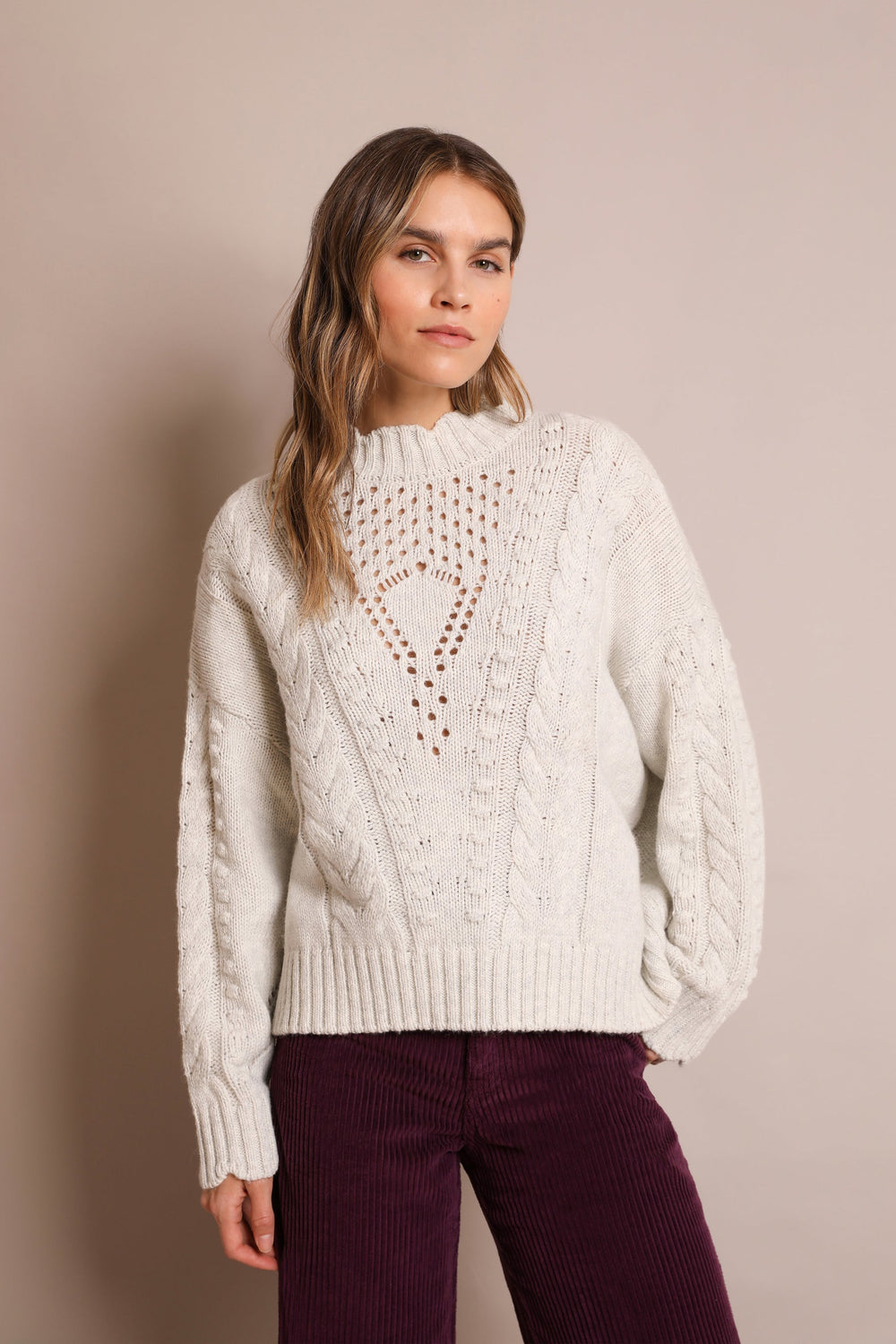 Knit sweater. Made of a cotton and wool fabric, oversize, high neck, long raglan sleeves and cable-knit detail