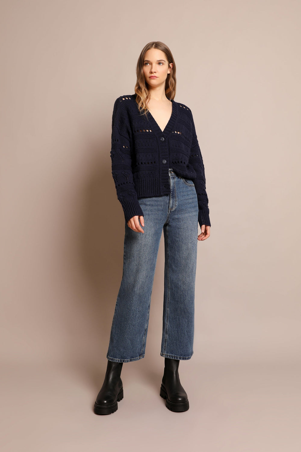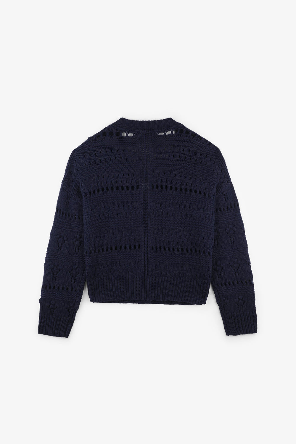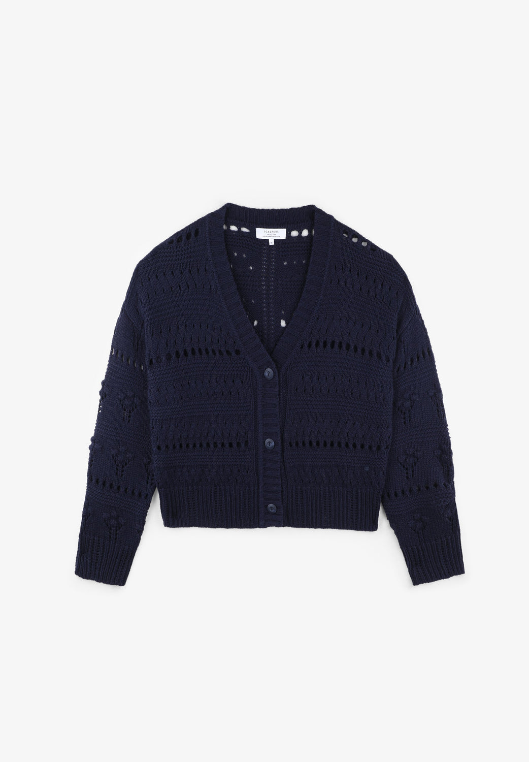 Openwork knit cardigan in a cotton and wool blend. Regular fit, V-neck and button fastening. Long sleeves with ribbed details.