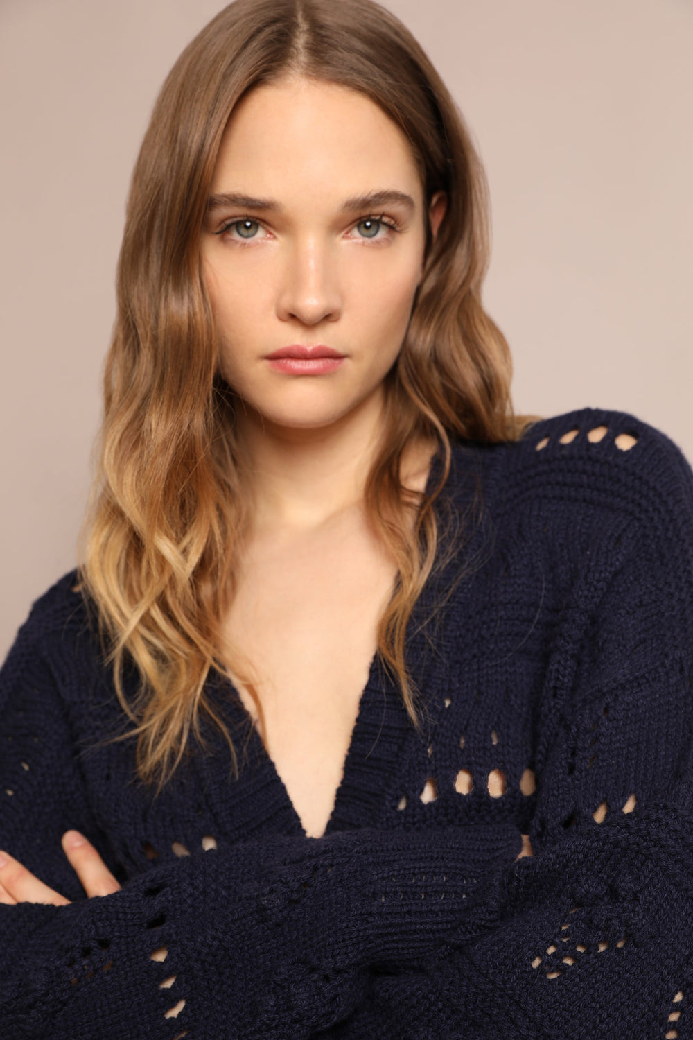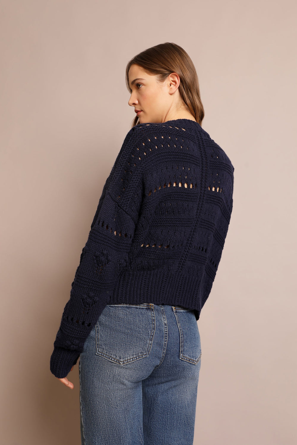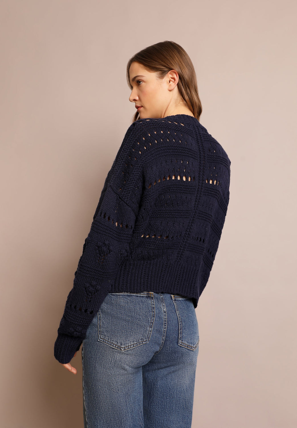 Openwork knit cardigan in a cotton and wool blend. Regular fit, V-neck and button fastening. Long sleeves with ribbed details.