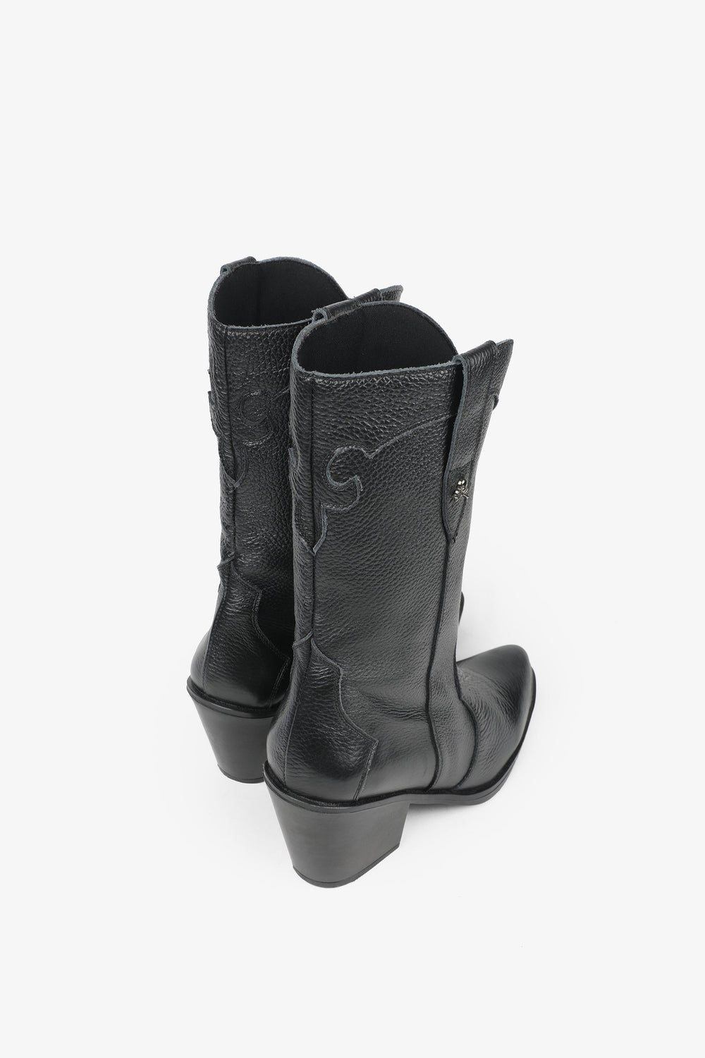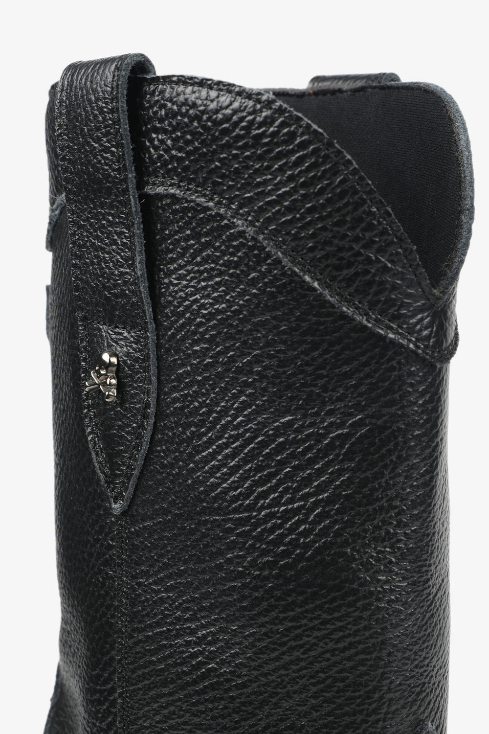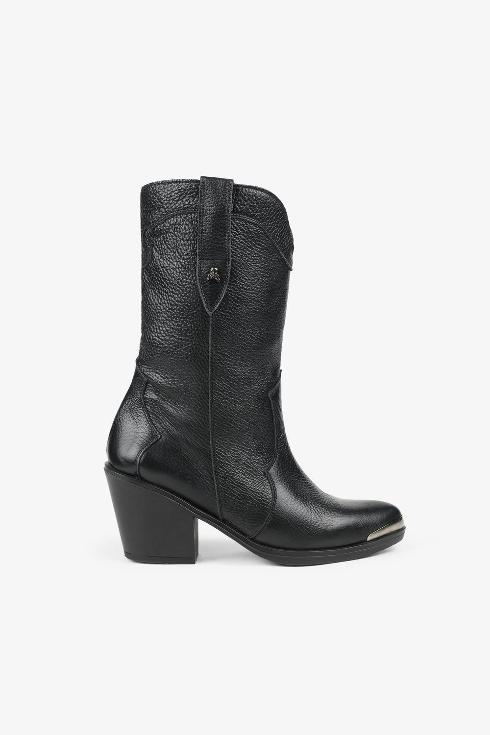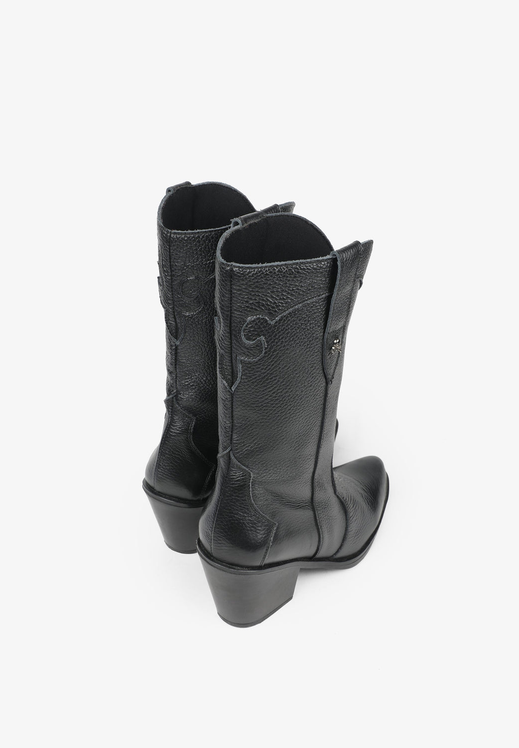 Leather boots. Made of 100% leather, mid-calf, cowboy style seams, rounded and pointed toe, metallic skull detail on the upper sides