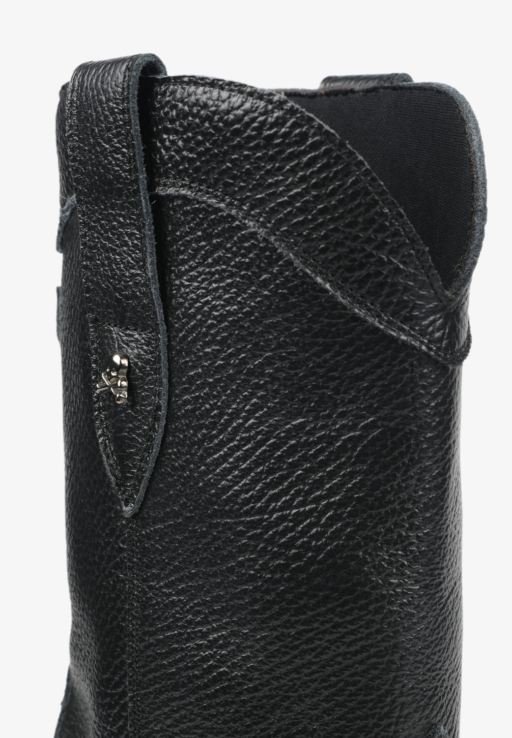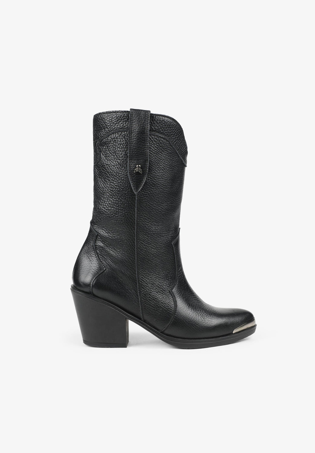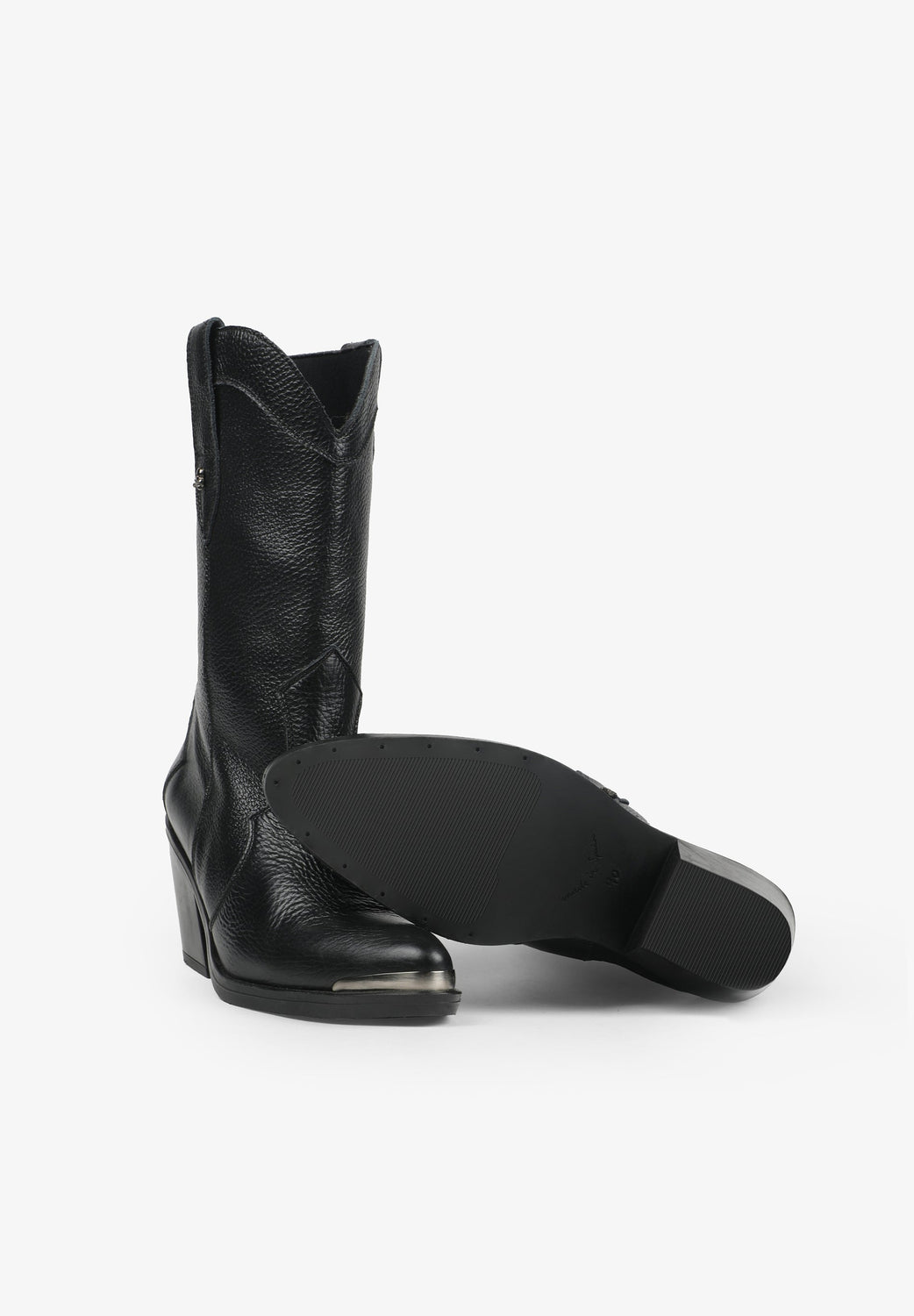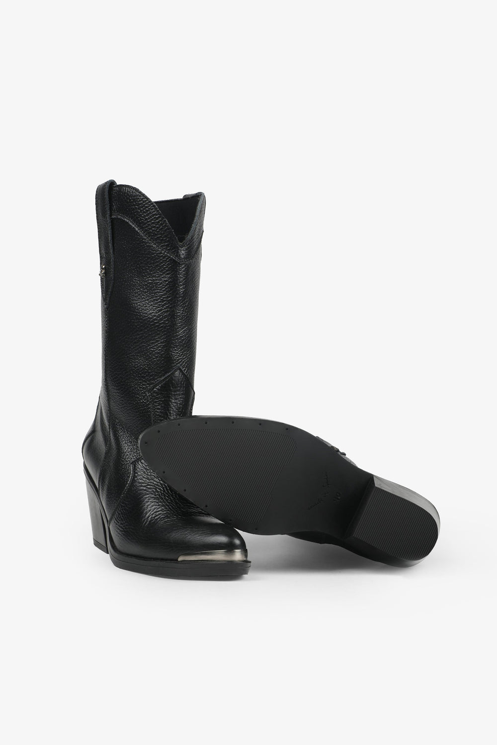 Leather boots. Made of 100% leather, mid-calf, cowboy style seams, rounded and pointed toe, metallic skull detail on the upper sides