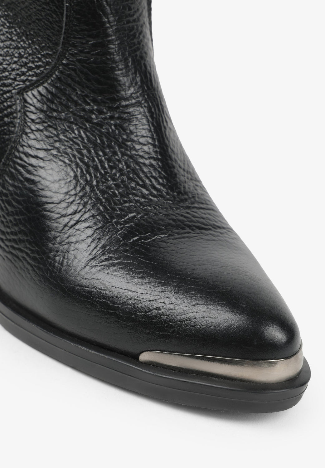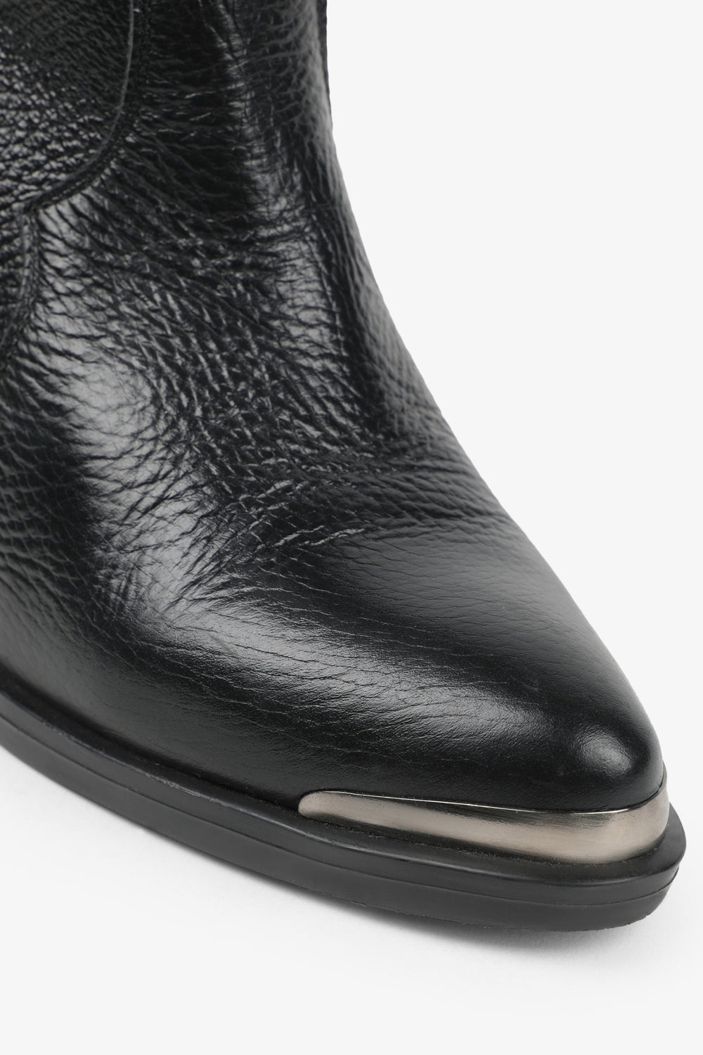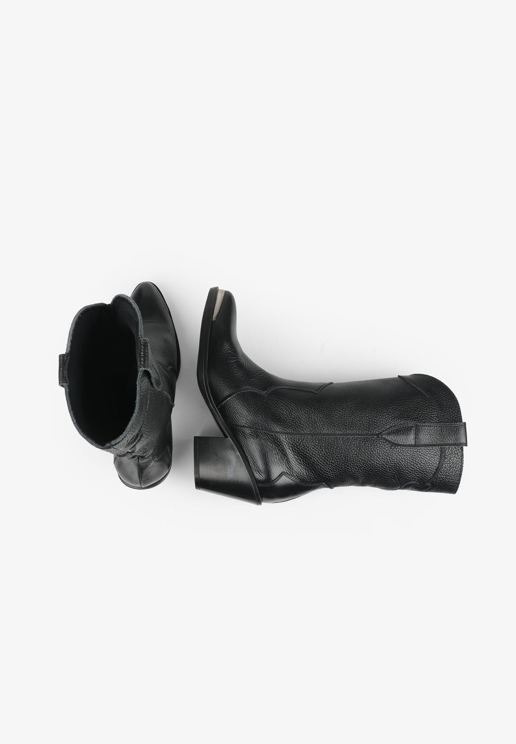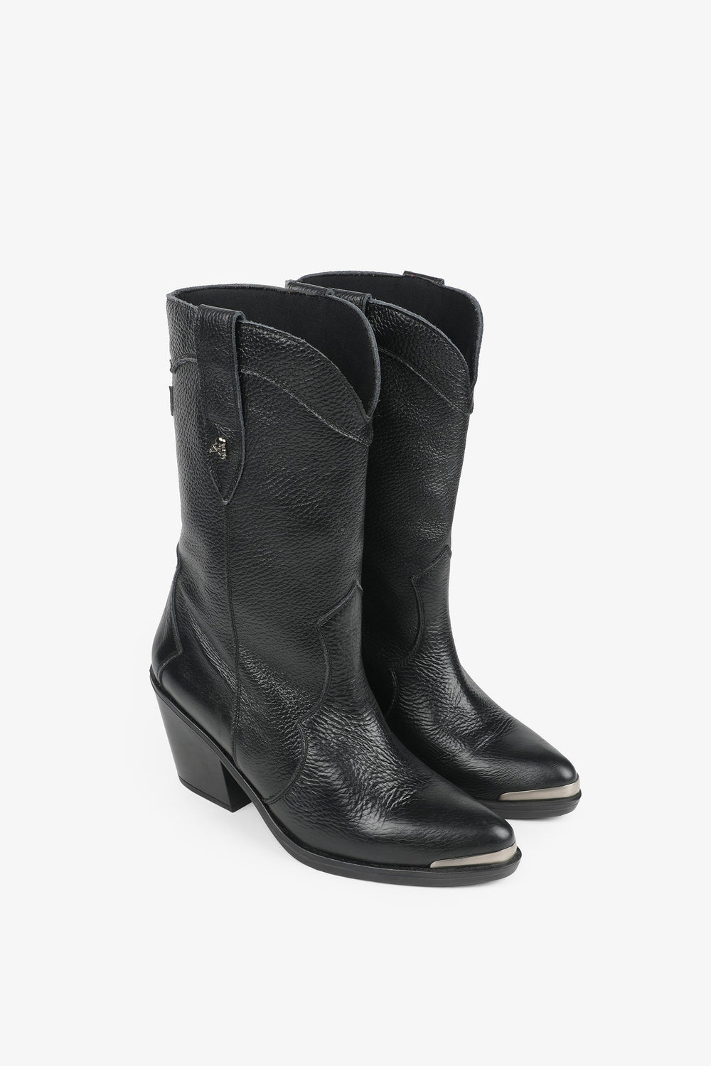 Leather boots. Made of 100% leather, mid-calf, cowboy style seams, rounded and pointed toe, metallic skull detail on the upper sides