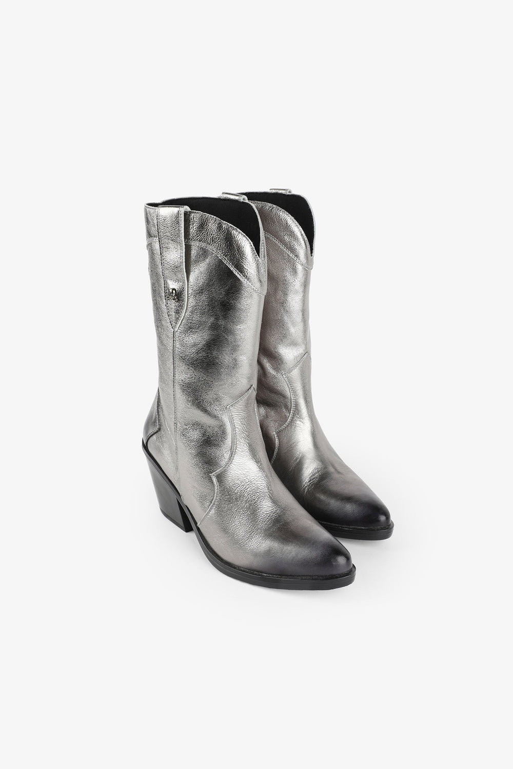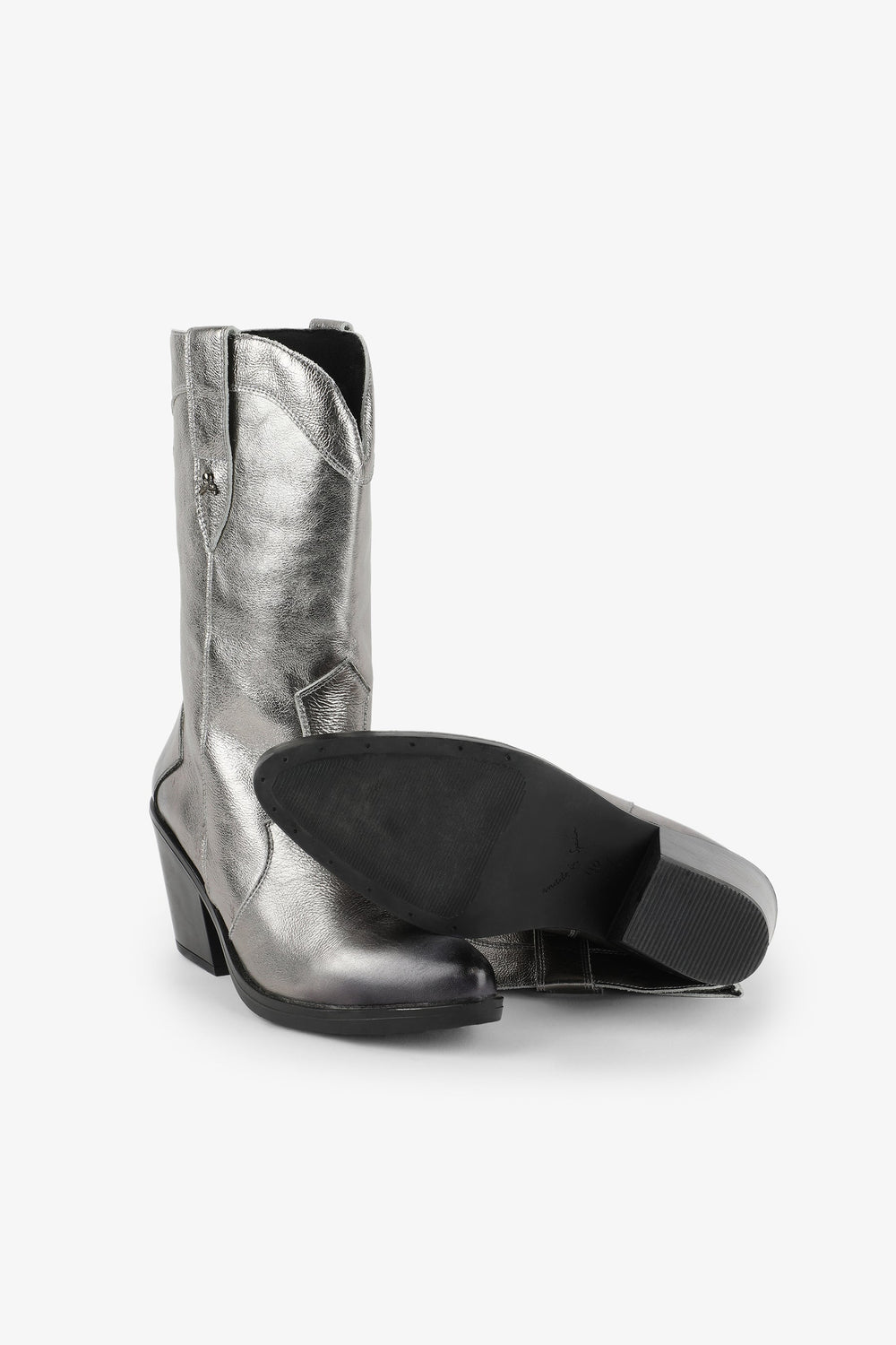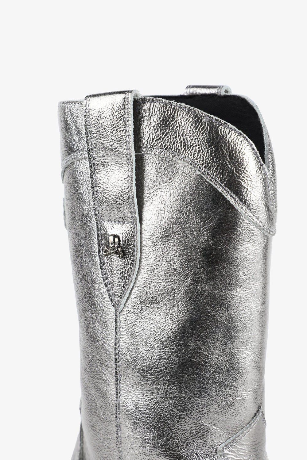 Leather boots. Made of 100% leather, mid-calf, cowboy style seams, rounded and pointed toe, metallic skull detail on the upper sides