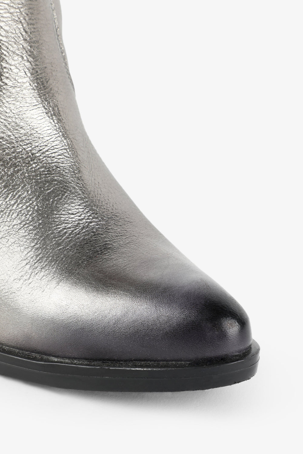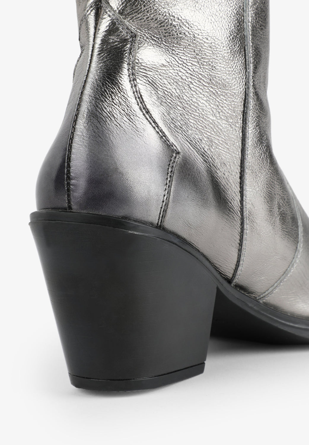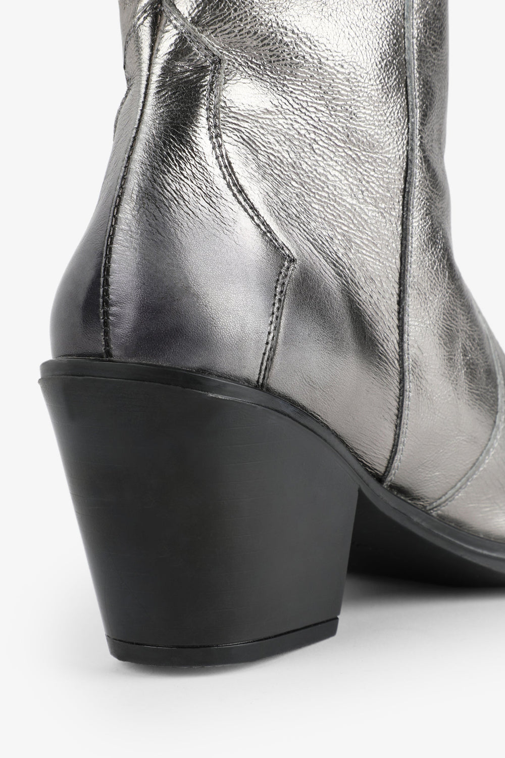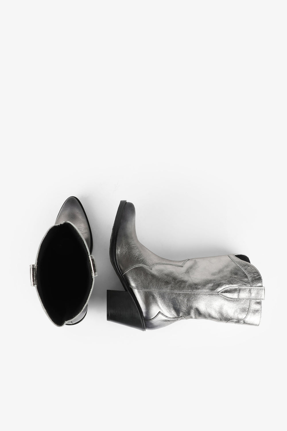 Leather boots. Made of 100% leather, mid-calf, cowboy style seams, rounded and pointed toe, metallic skull detail on the upper sides