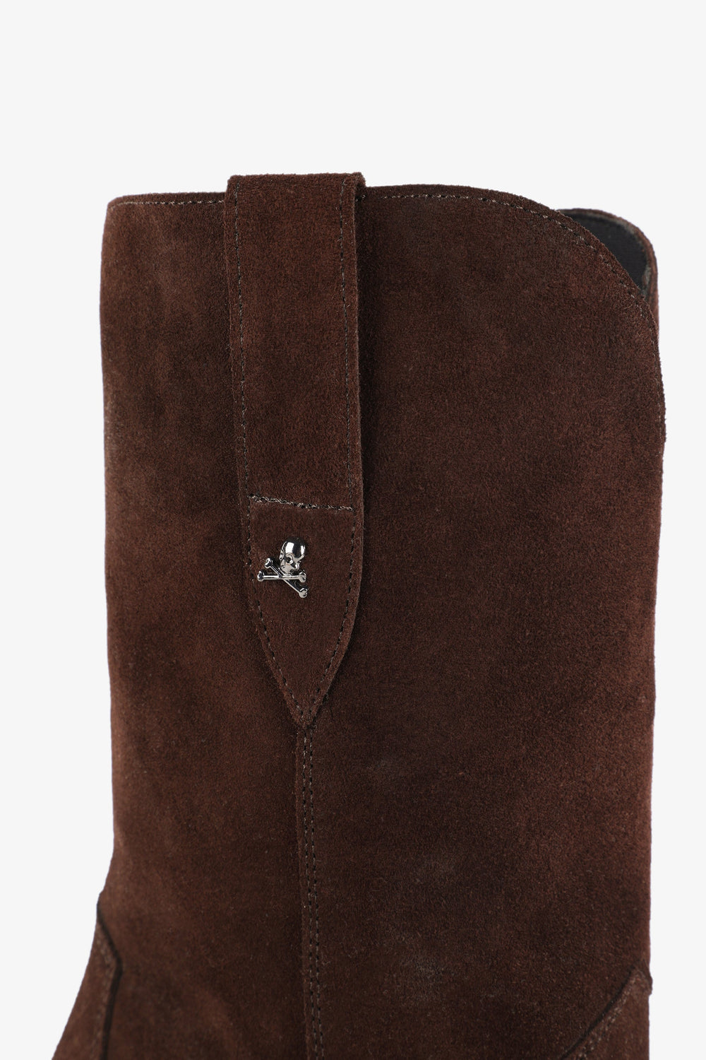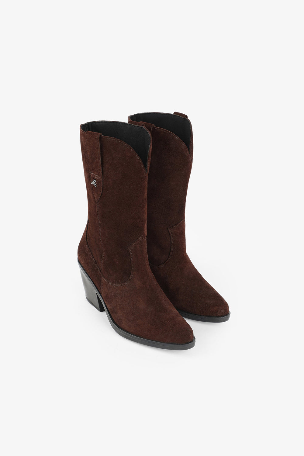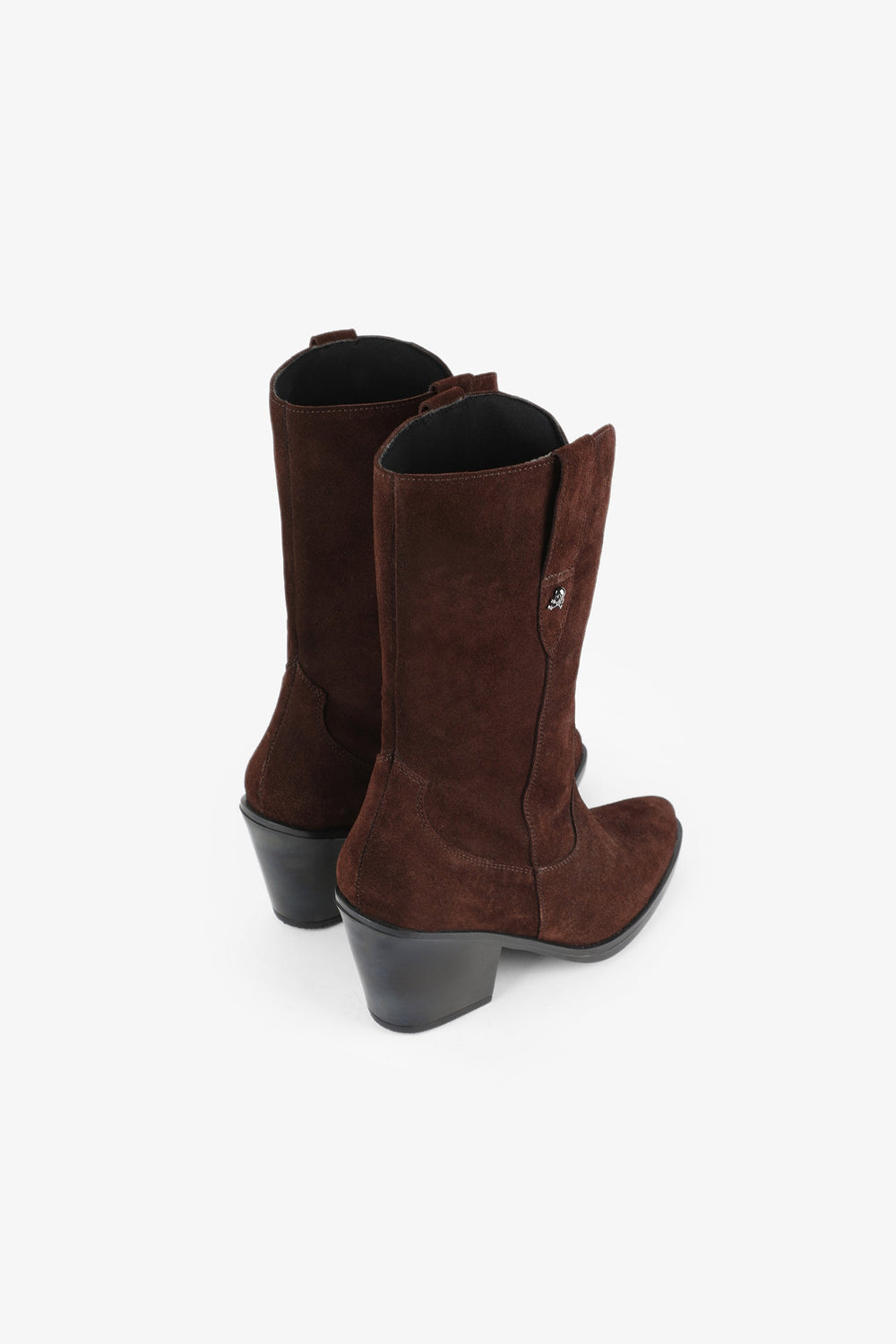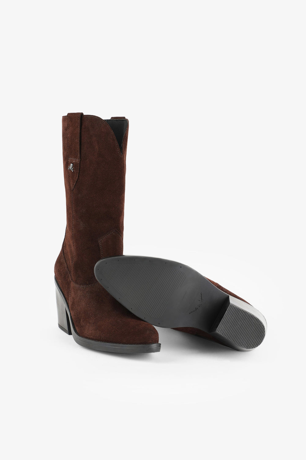 Split suede boots. Made of 100% leather, mid-calf, seams, rounded and pointed toe, metallic skull detail on the upper sides