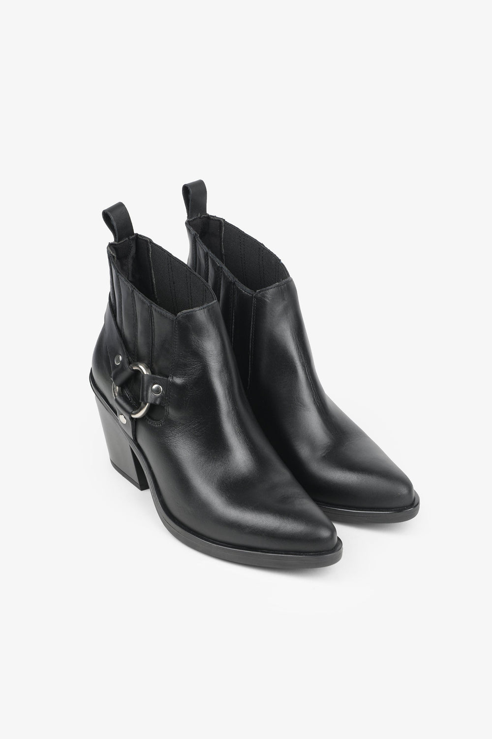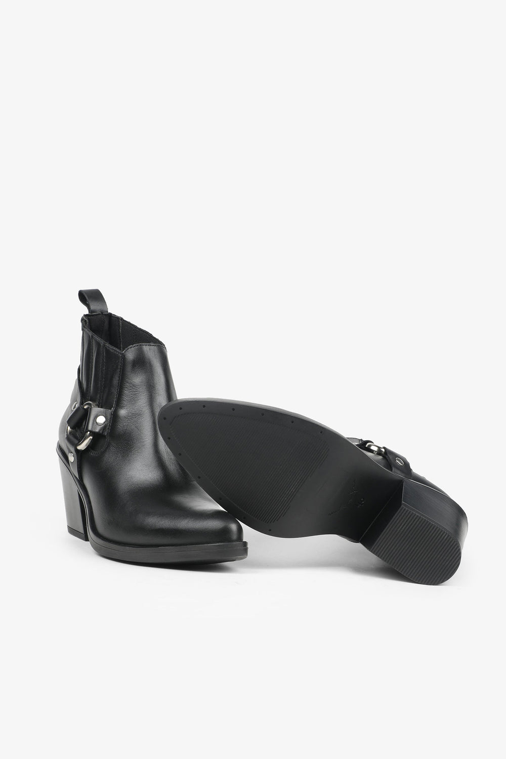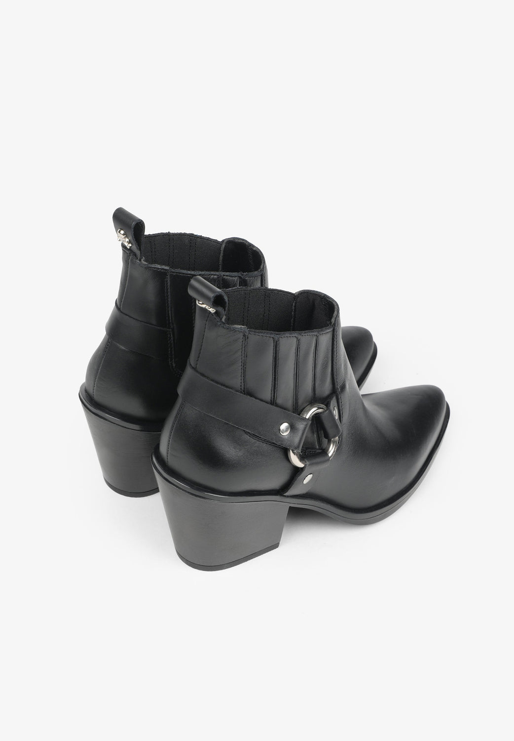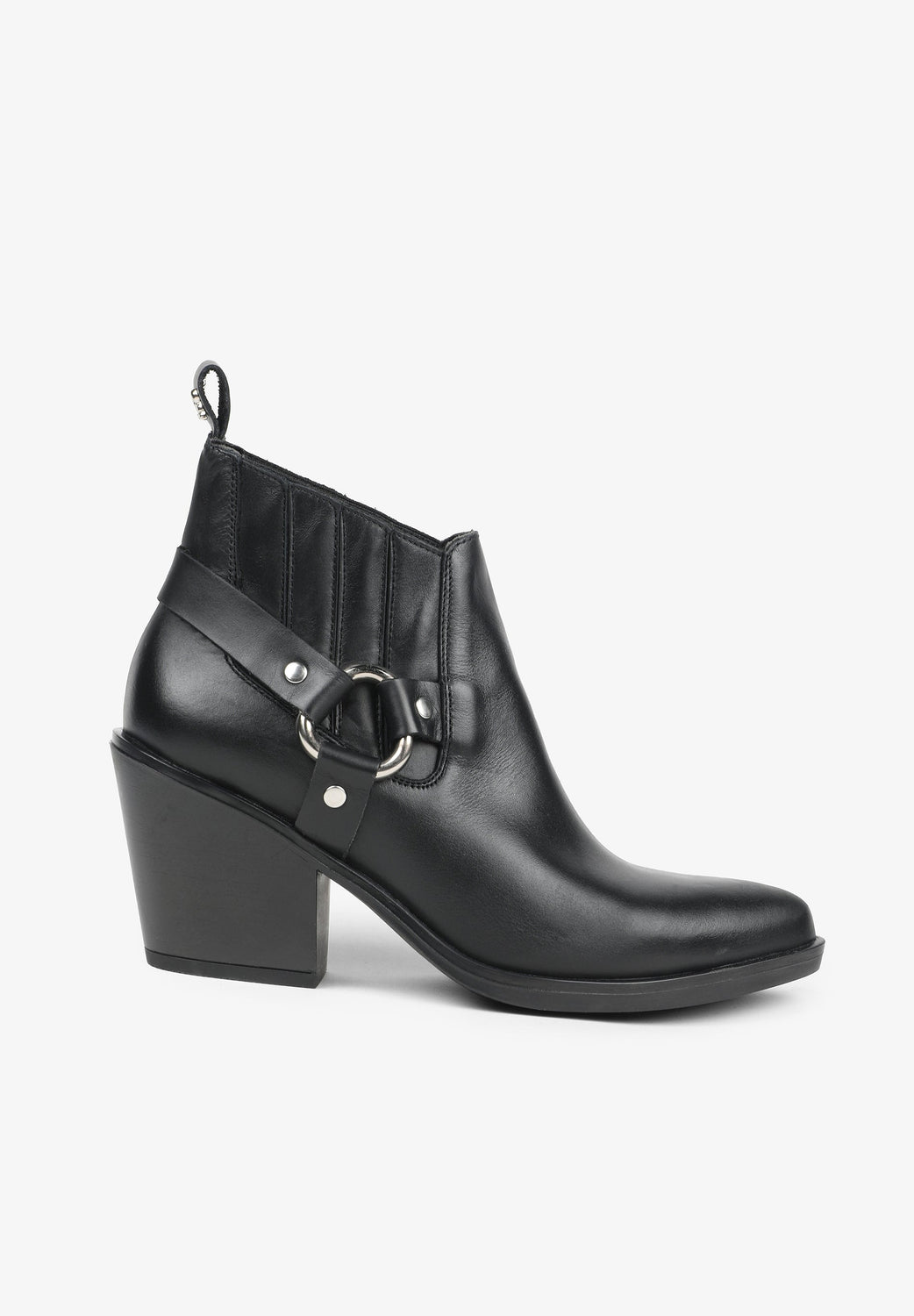 Ankle boots with D-ring. Made of 100% leather, elastic fastening, rounded toe and metallic D-ring on the side. Heel height: 8 cm / Leg height: 10.5 cm