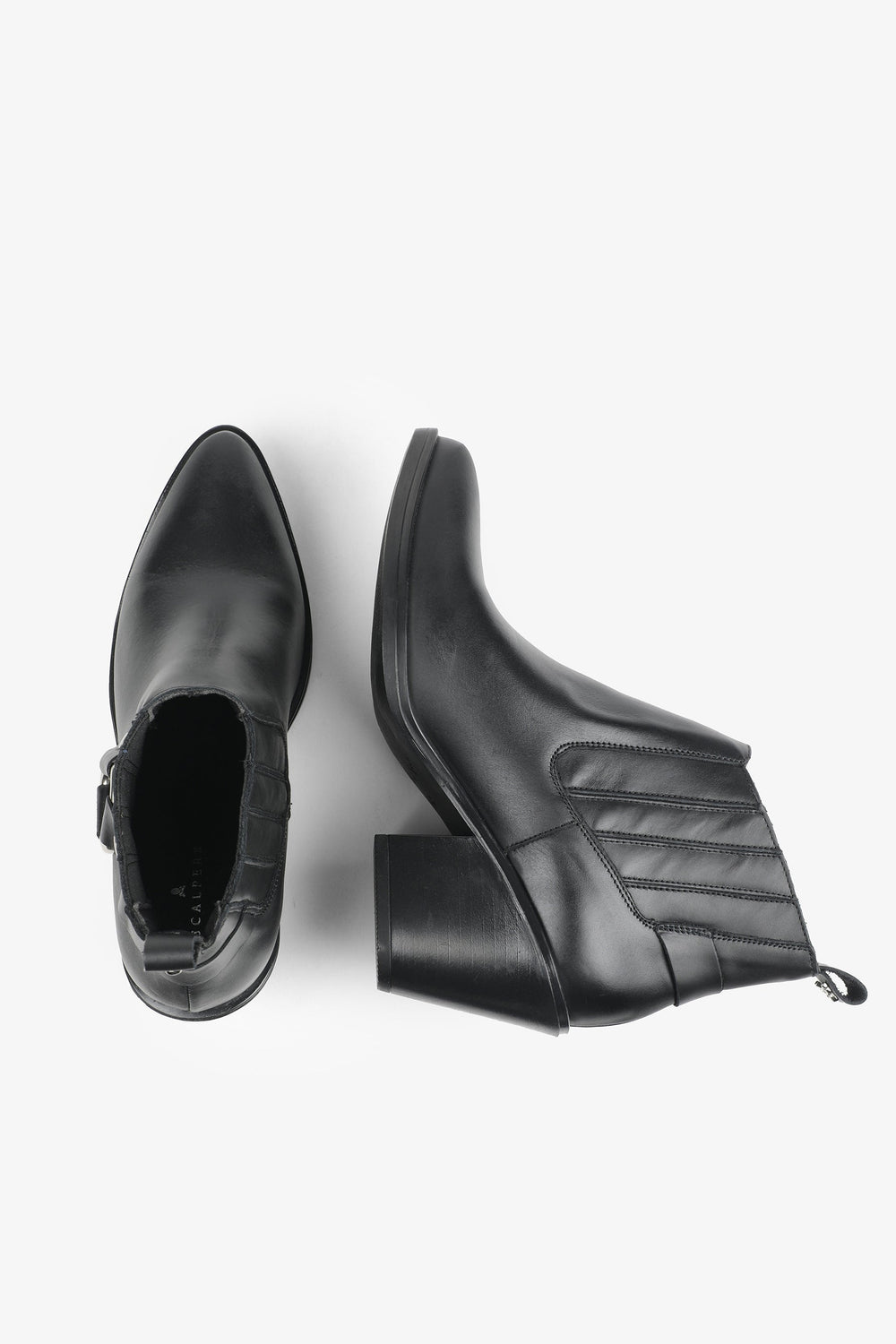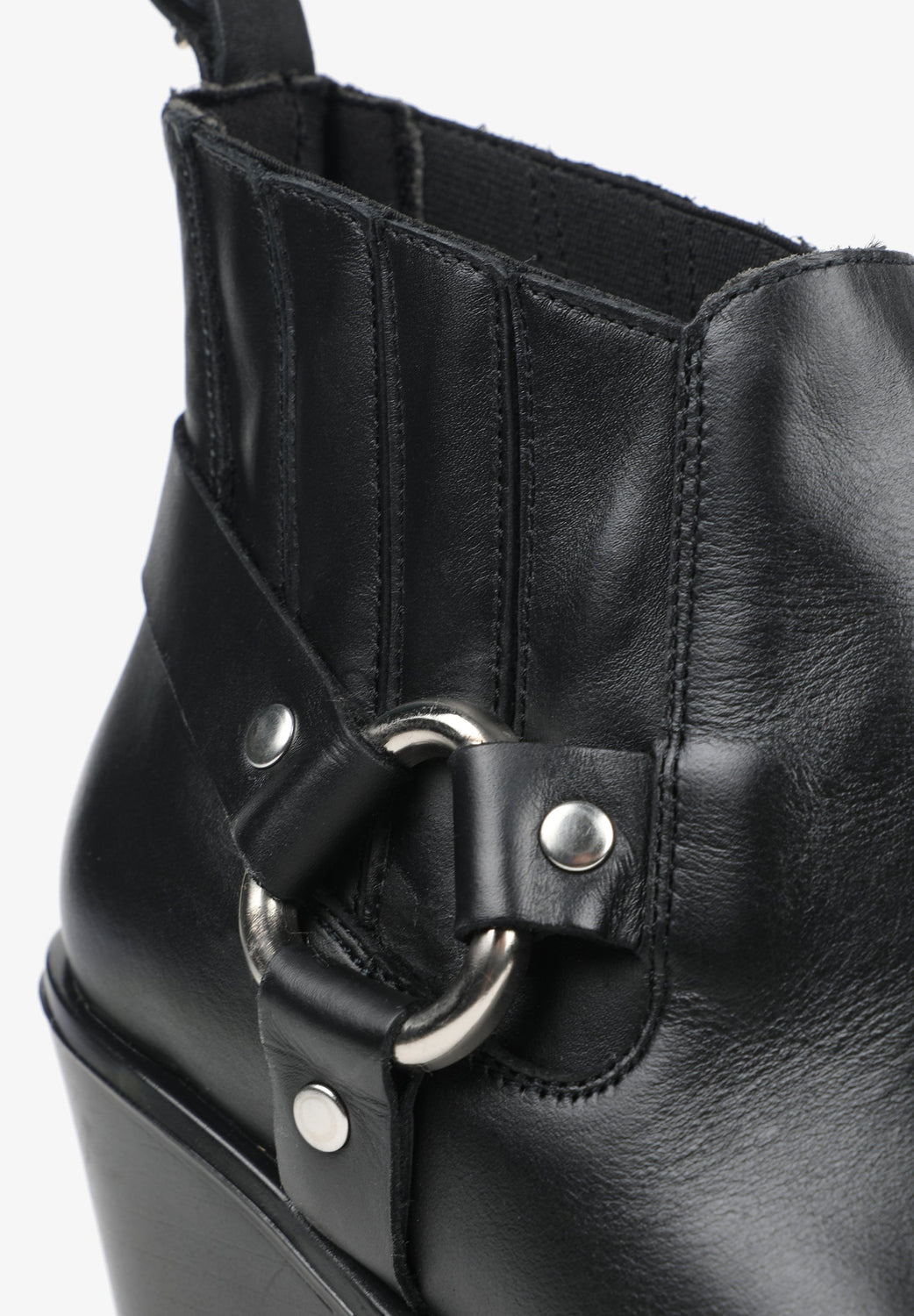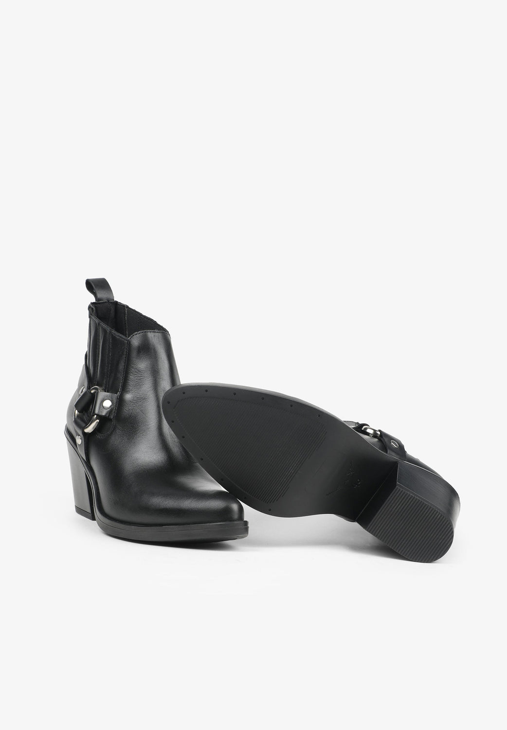 Ankle boots with D-ring. Made of 100% leather, elastic fastening, rounded toe and metallic D-ring on the side. Heel height: 8 cm / Leg height: 10.5 cm