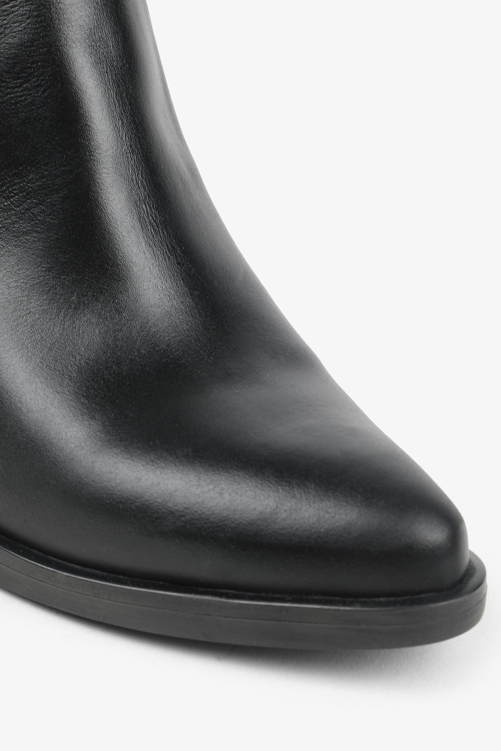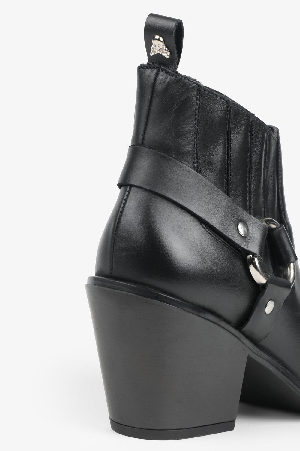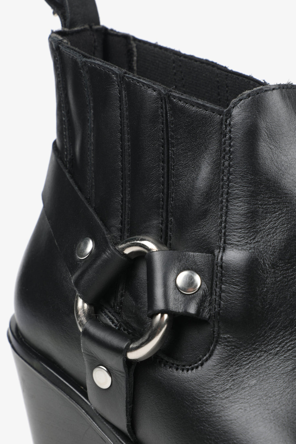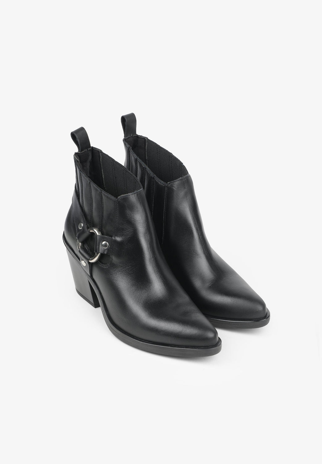 Ankle boots with D-ring. Made of 100% leather, elastic fastening, rounded toe and metallic D-ring on the side. Heel height: 8 cm / Leg height: 10.5 cm