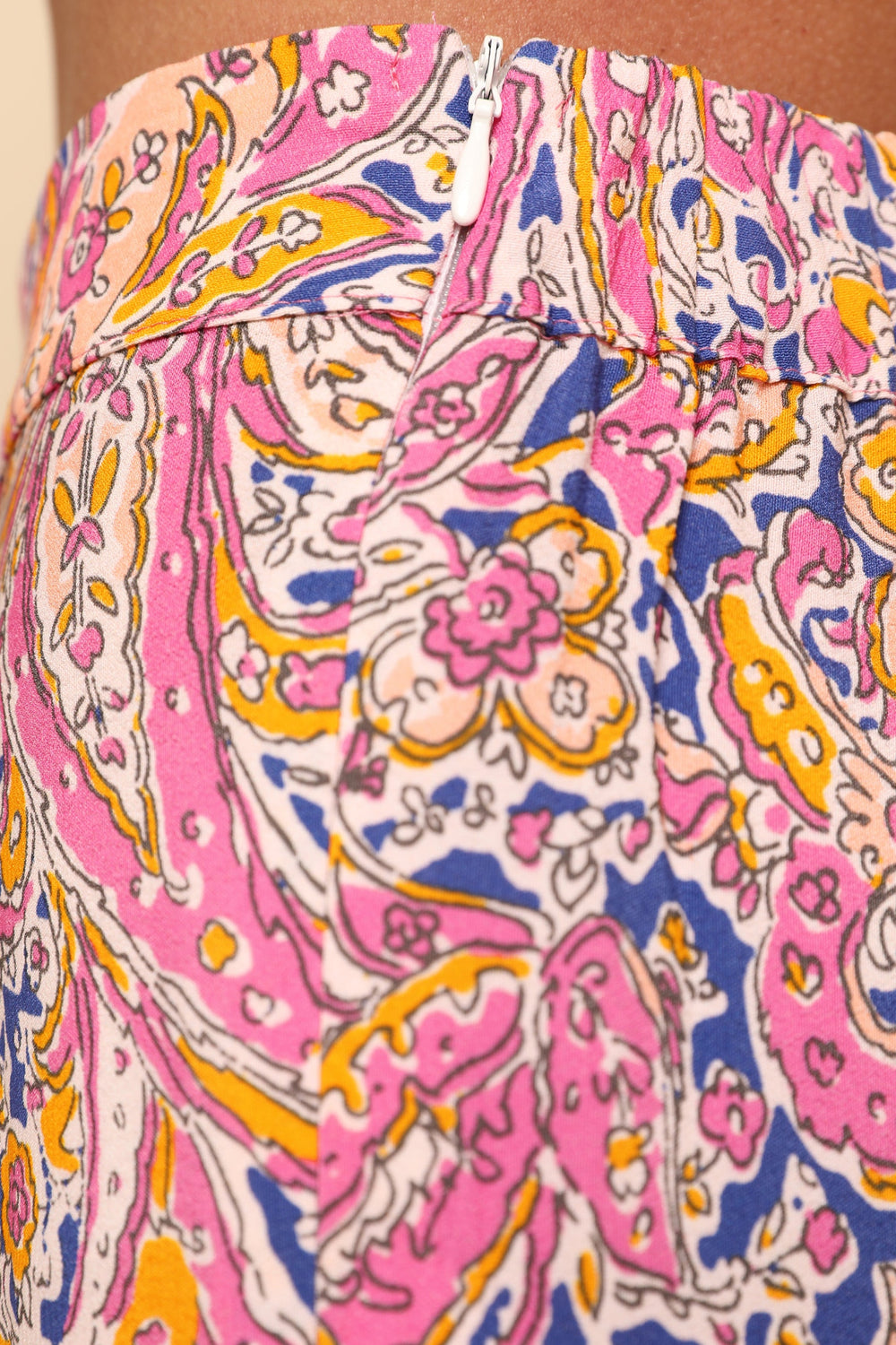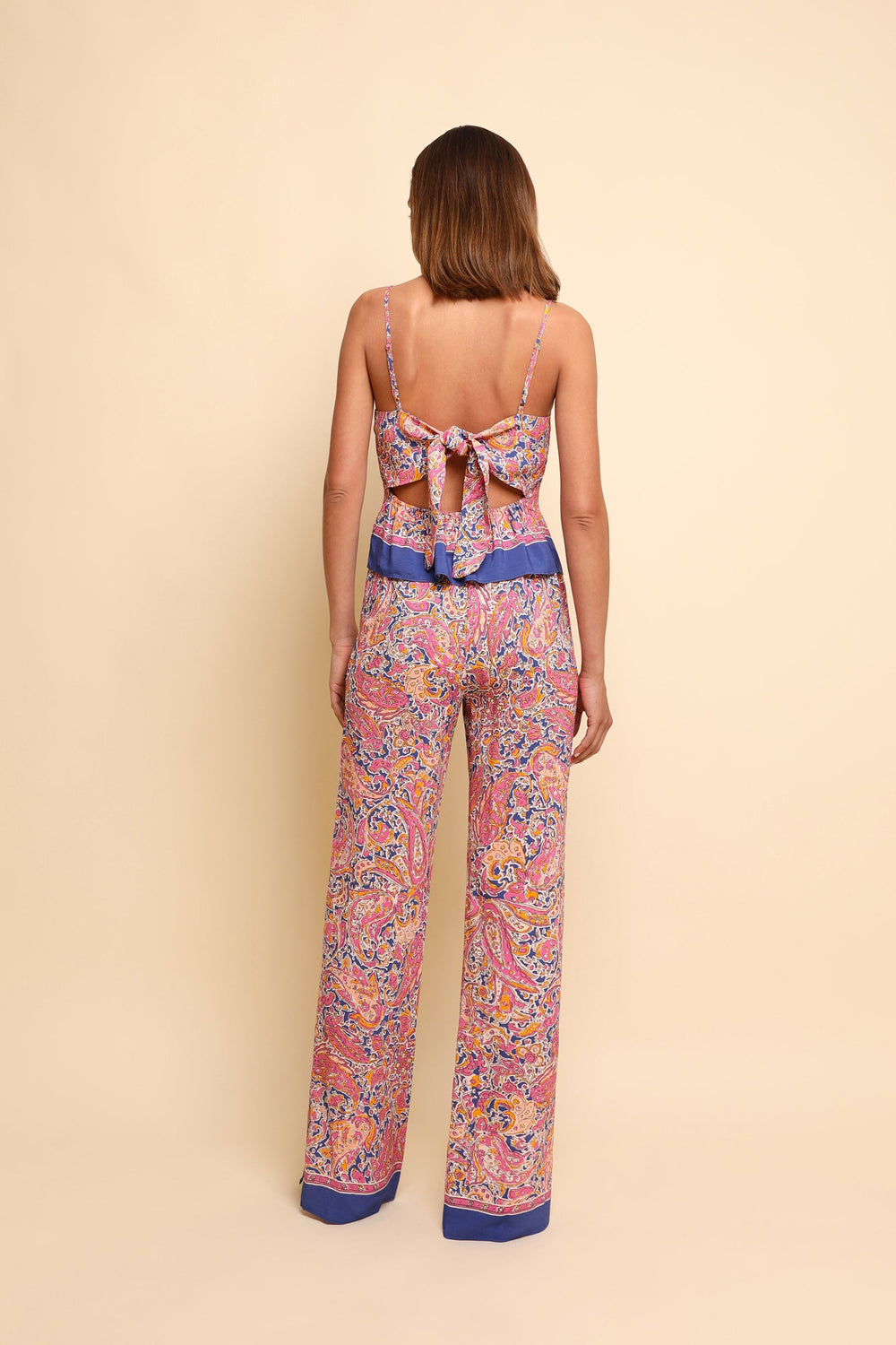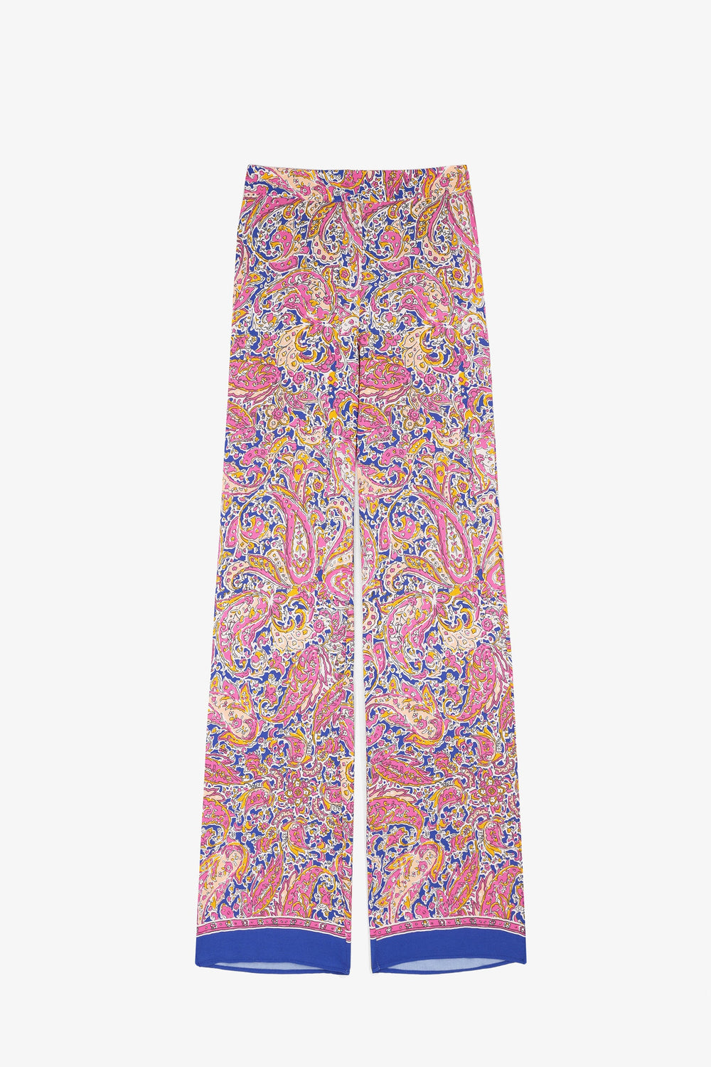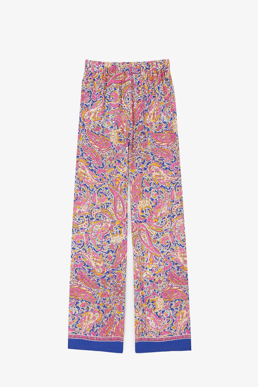 Printed flared trousers. Made of flowing fabric. Slim fit with high waist. Zip and snap button fastening. Side pockets.