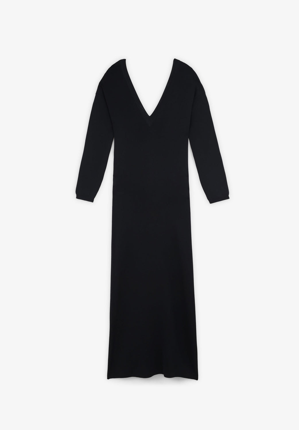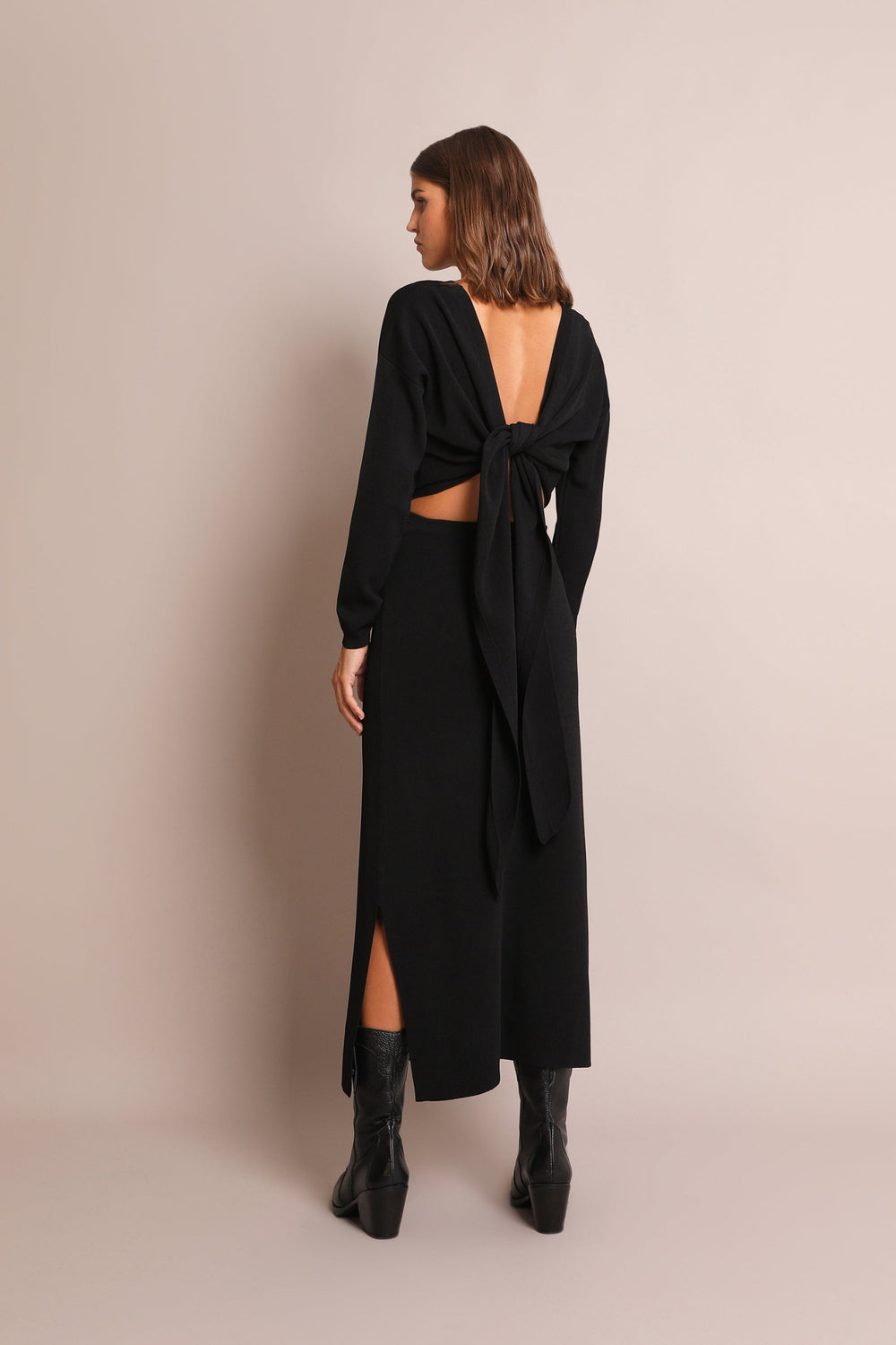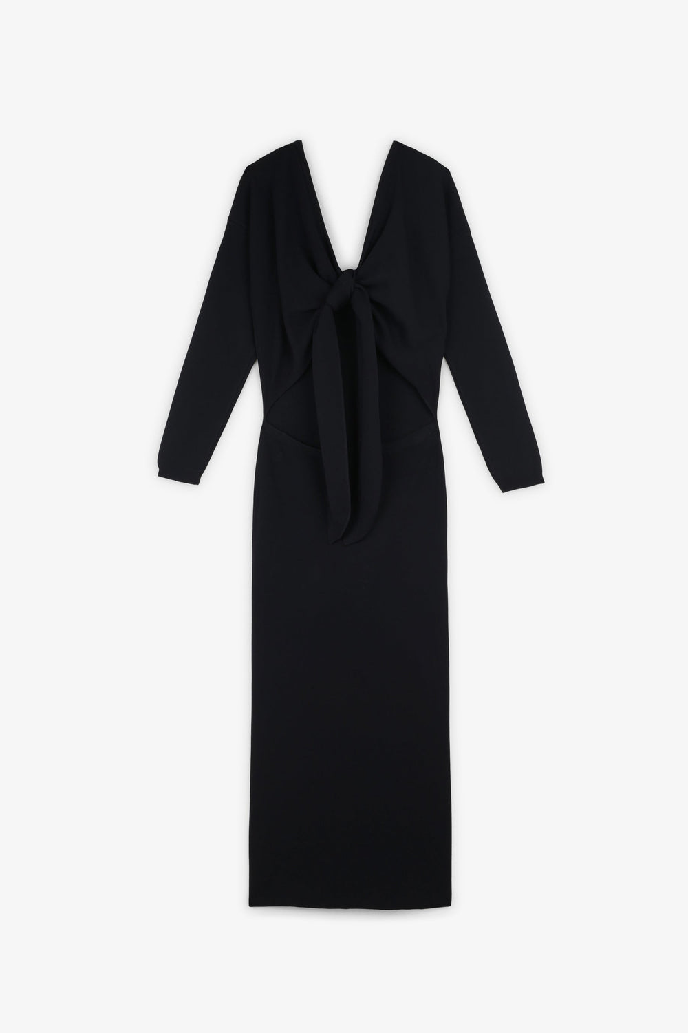 Knit multi-position dress. Slim fit, V-neck and long sleeves. Back bow.