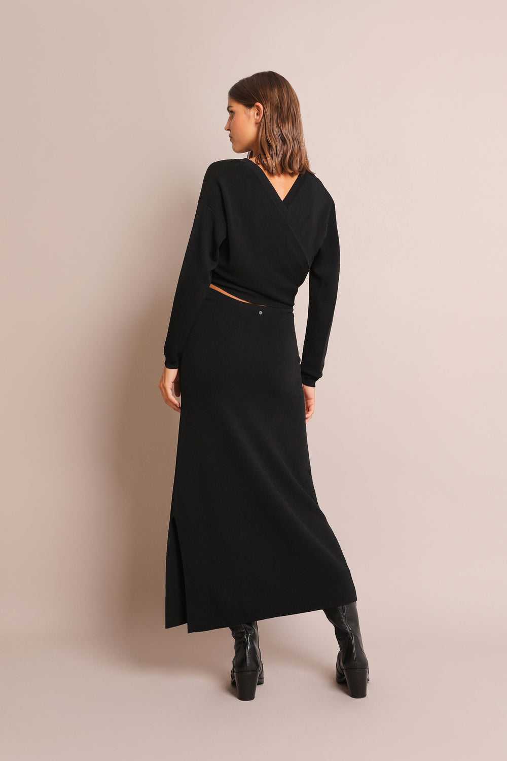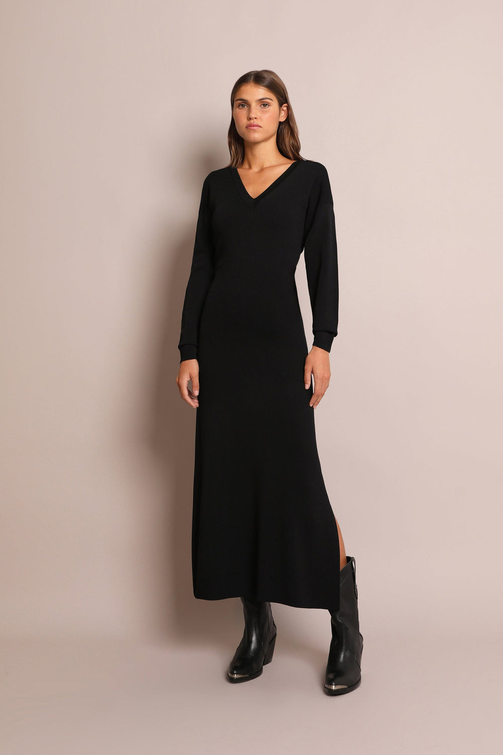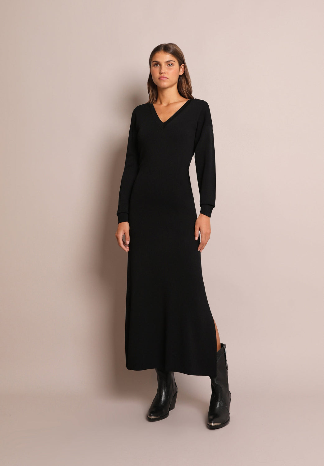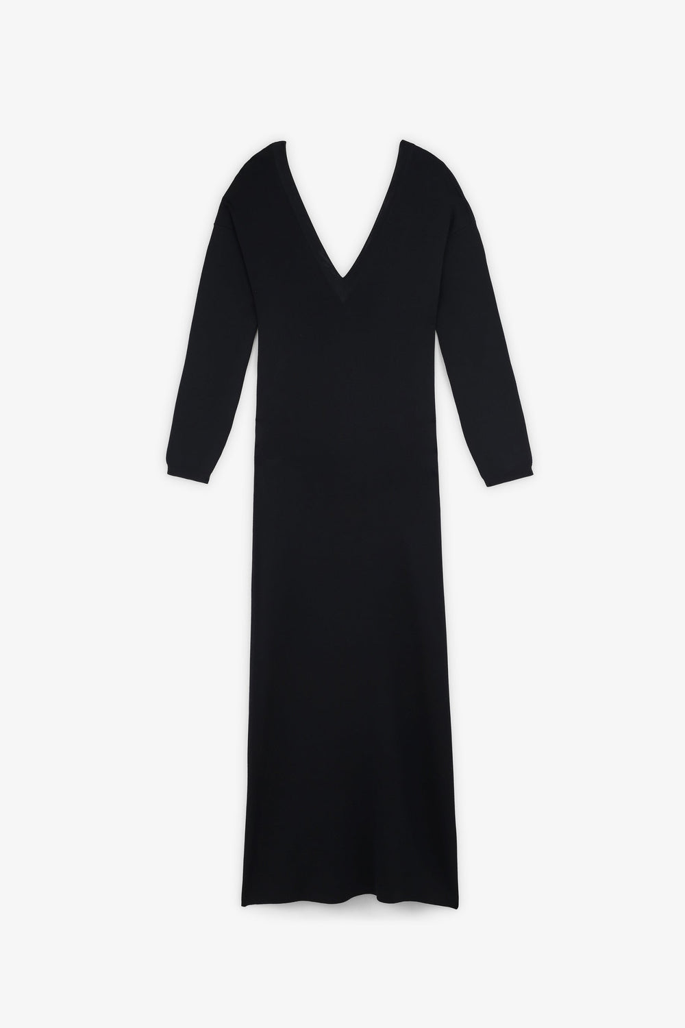 Knit multi-position dress. Slim fit, V-neck and long sleeves. Back bow.
