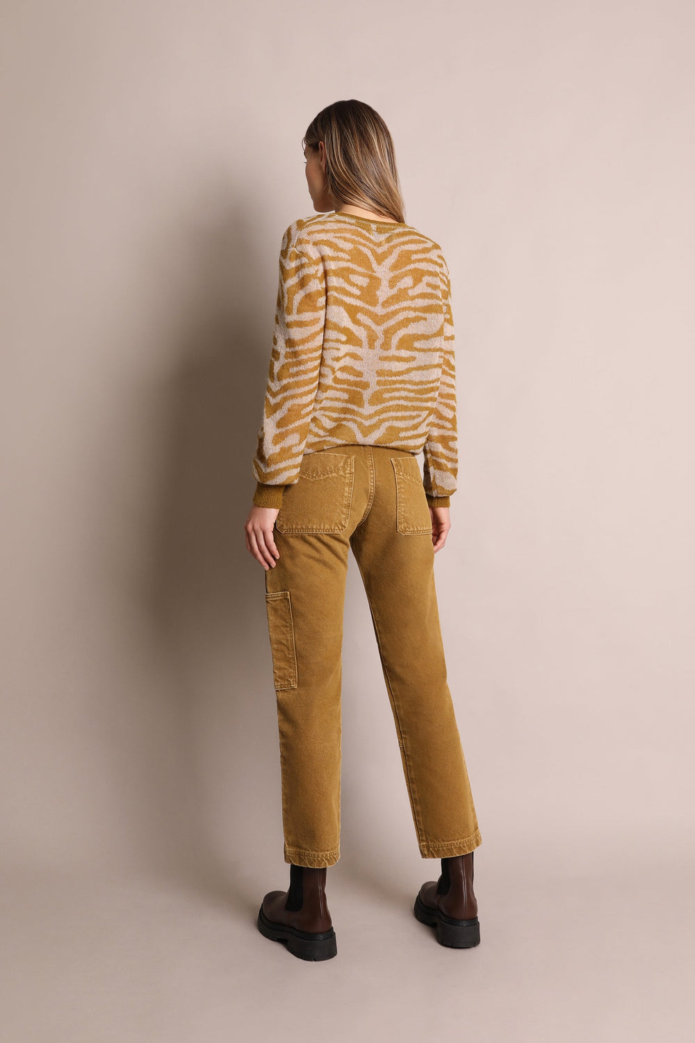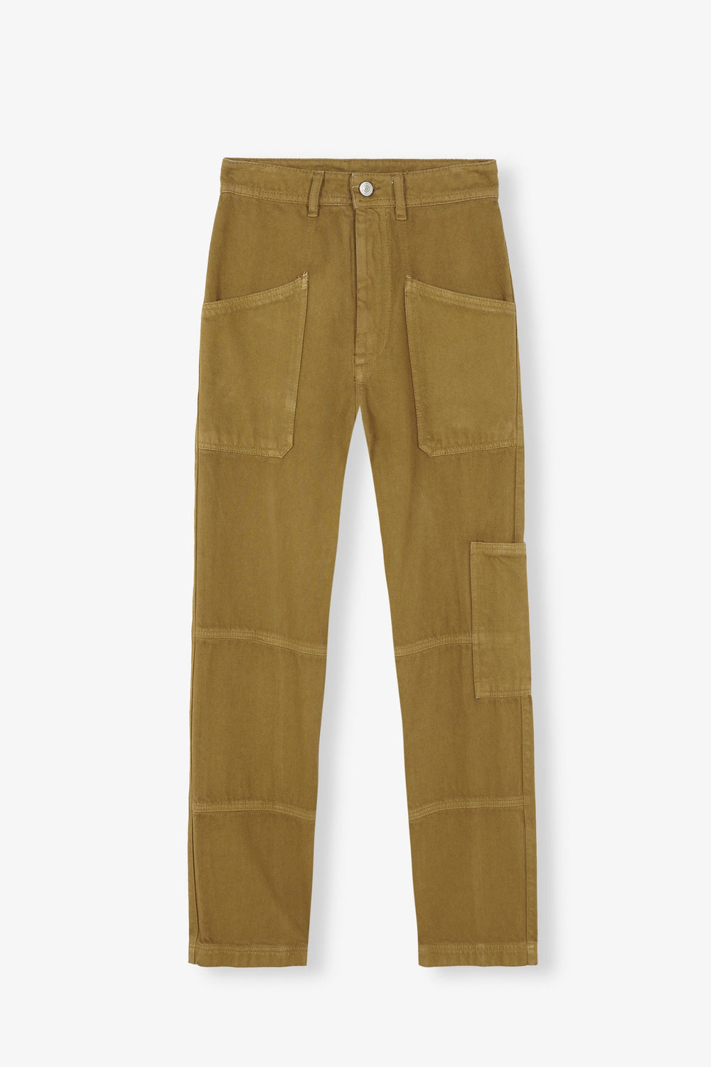 Denim cargo trousers. Made from 100% cotton, a zip fly and top button fastening, waistband with belt loops, knee high and knee low seams and multiple pockets.