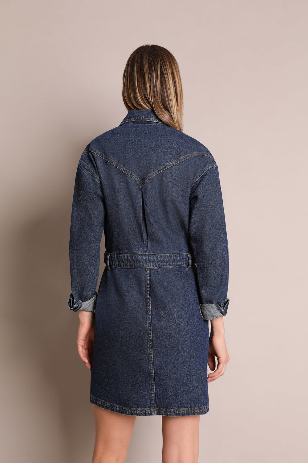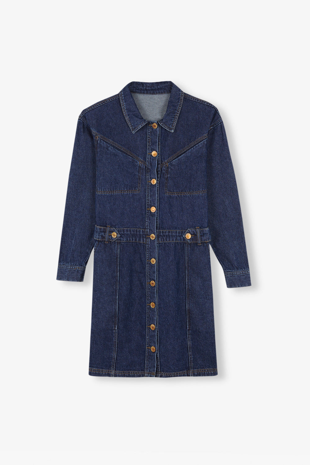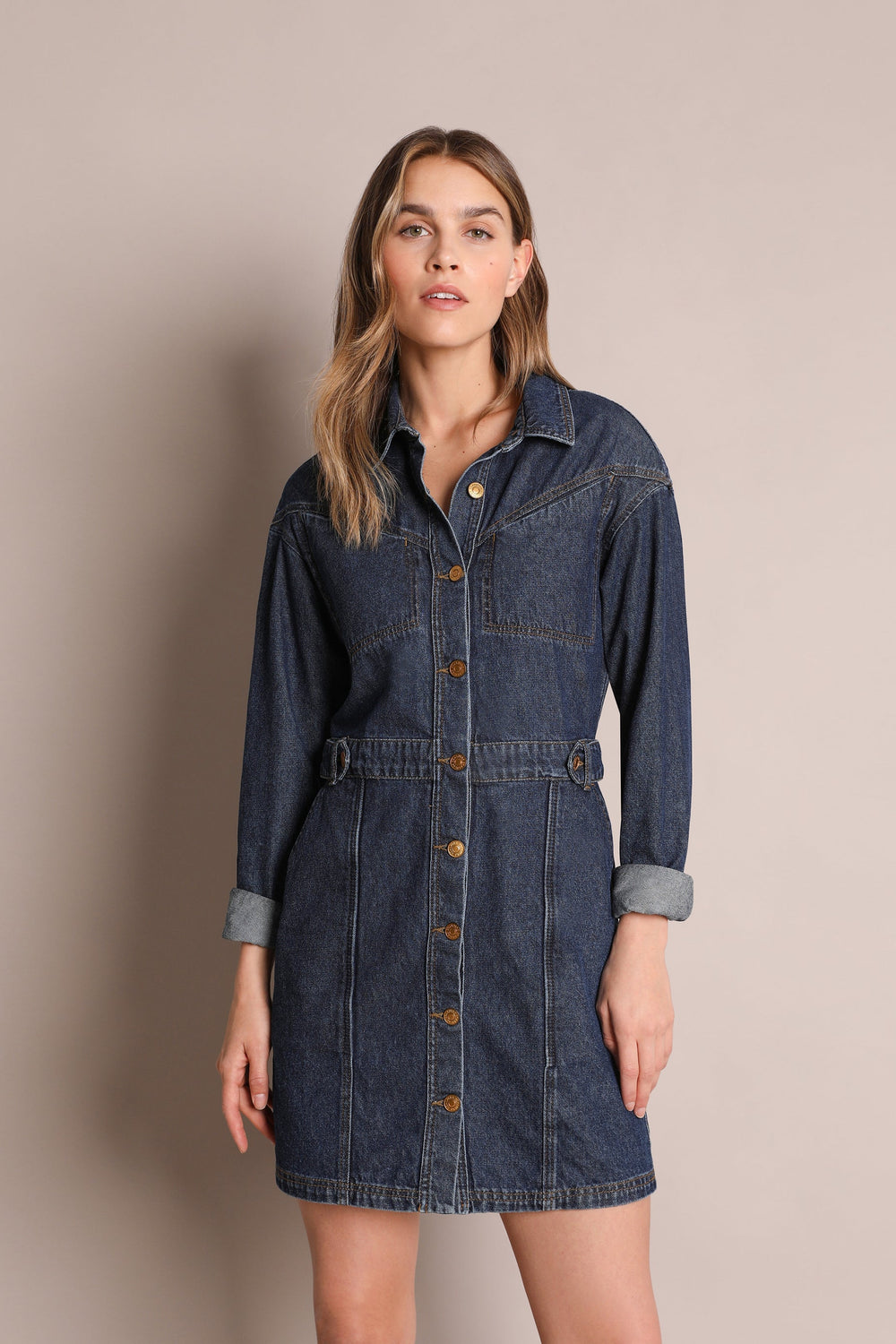 Denim mini dress made from 100% cotton. Regular fit with a cut-out waist, button fastening and classic collar. Long sleeves and jetted top pockets.