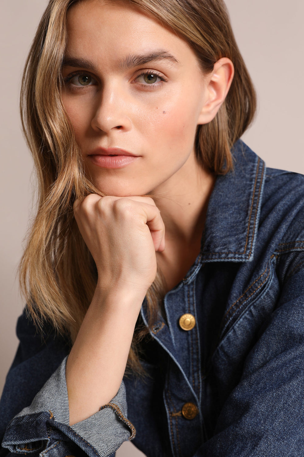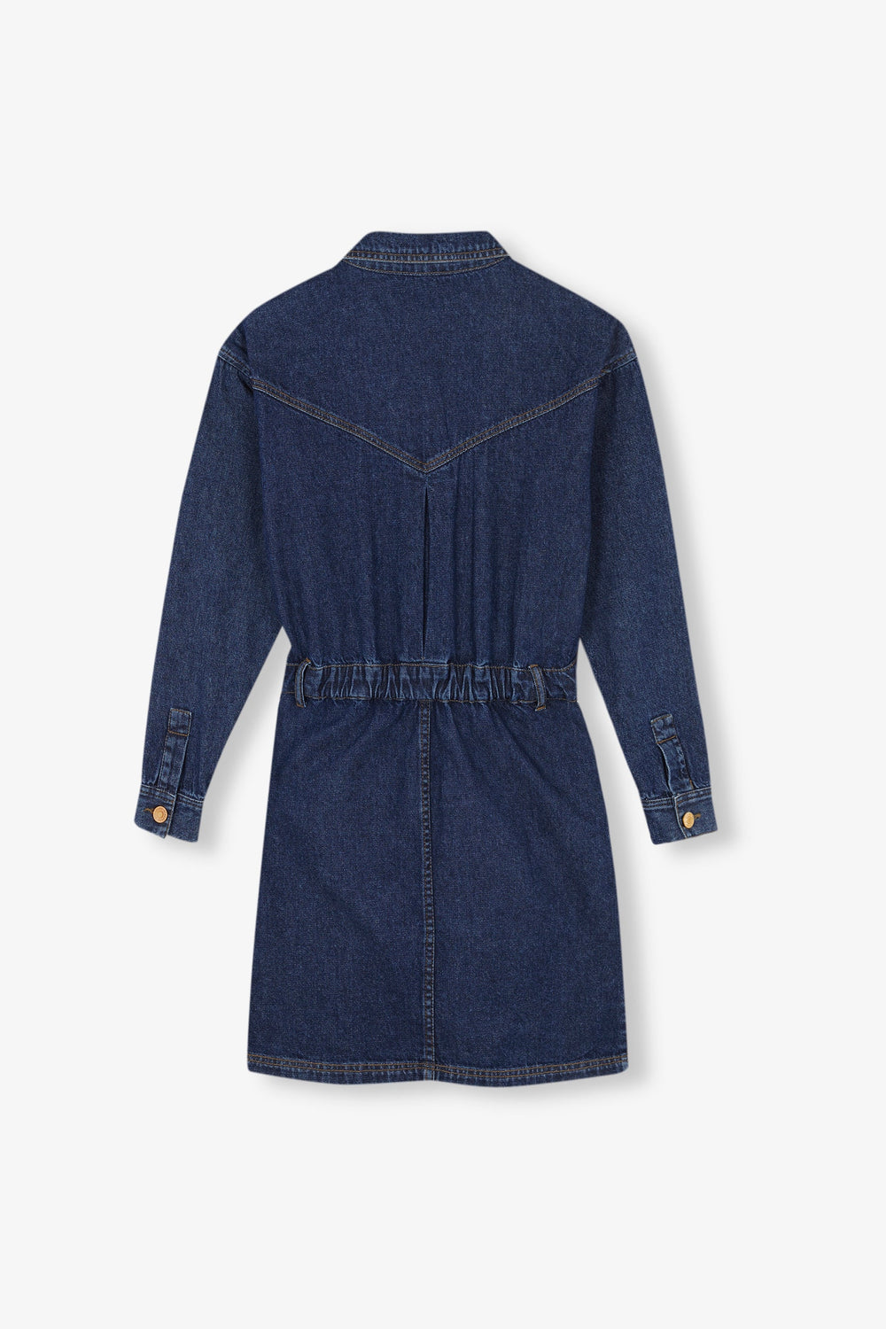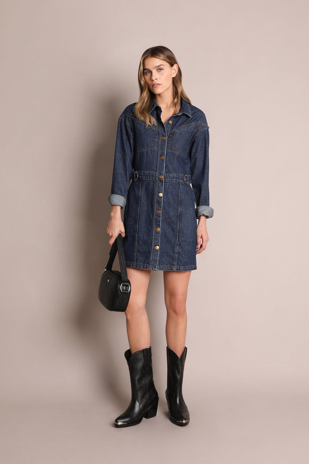 Denim mini dress made from 100% cotton. Regular fit with a cut-out waist, button fastening and classic collar. Long sleeves and jetted top pockets.