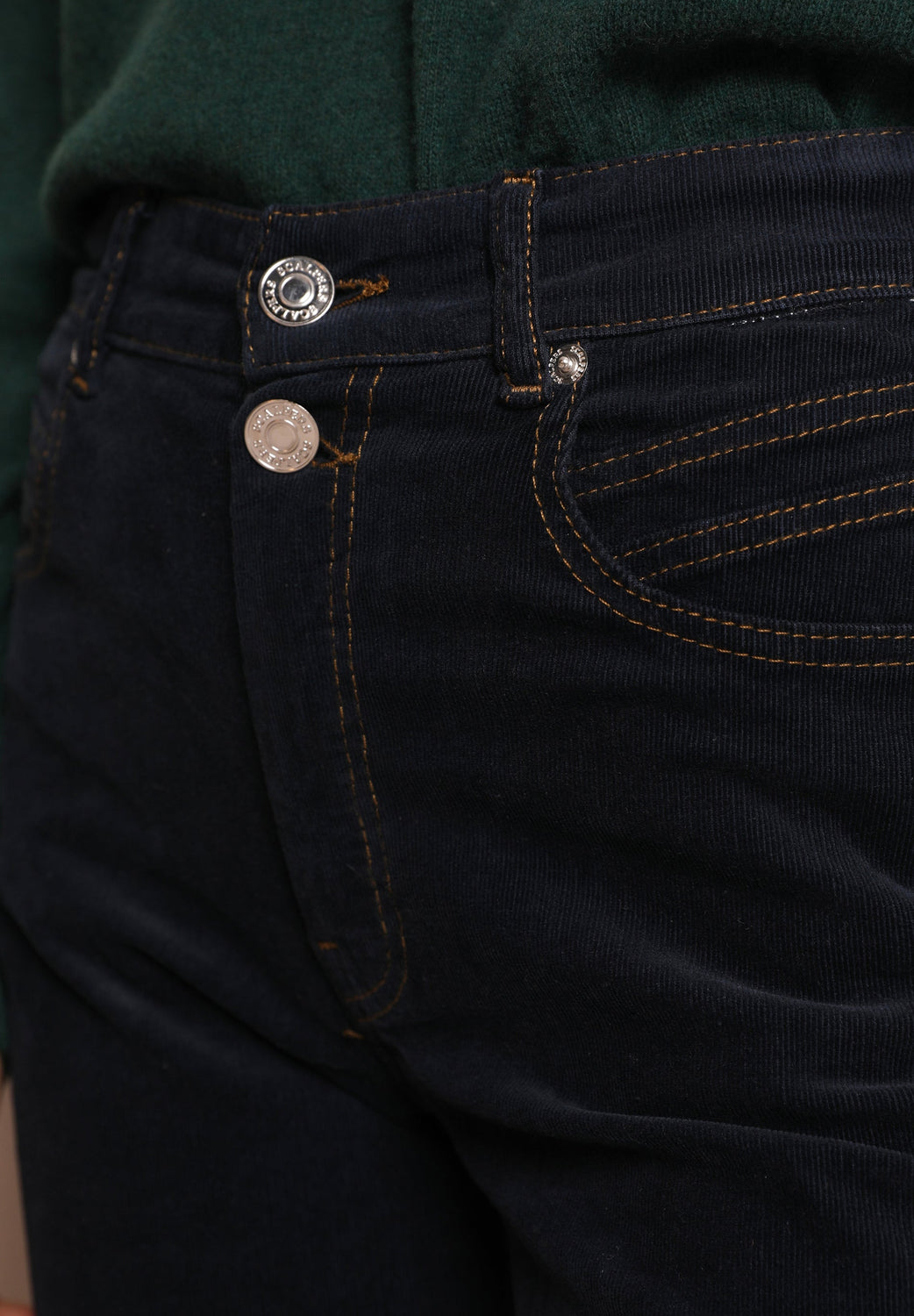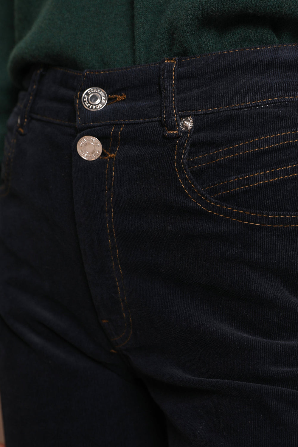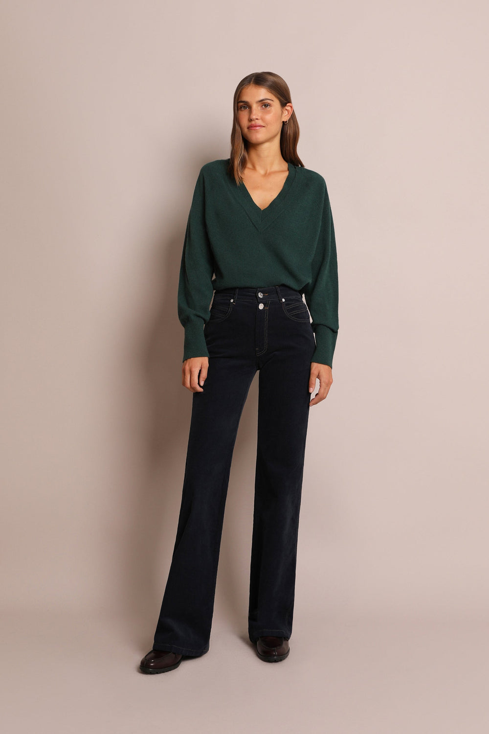 Flared trousers made of slightly stretch cotton fabric. Regular fit with high waist, zip and button fastening and side and back pockets.