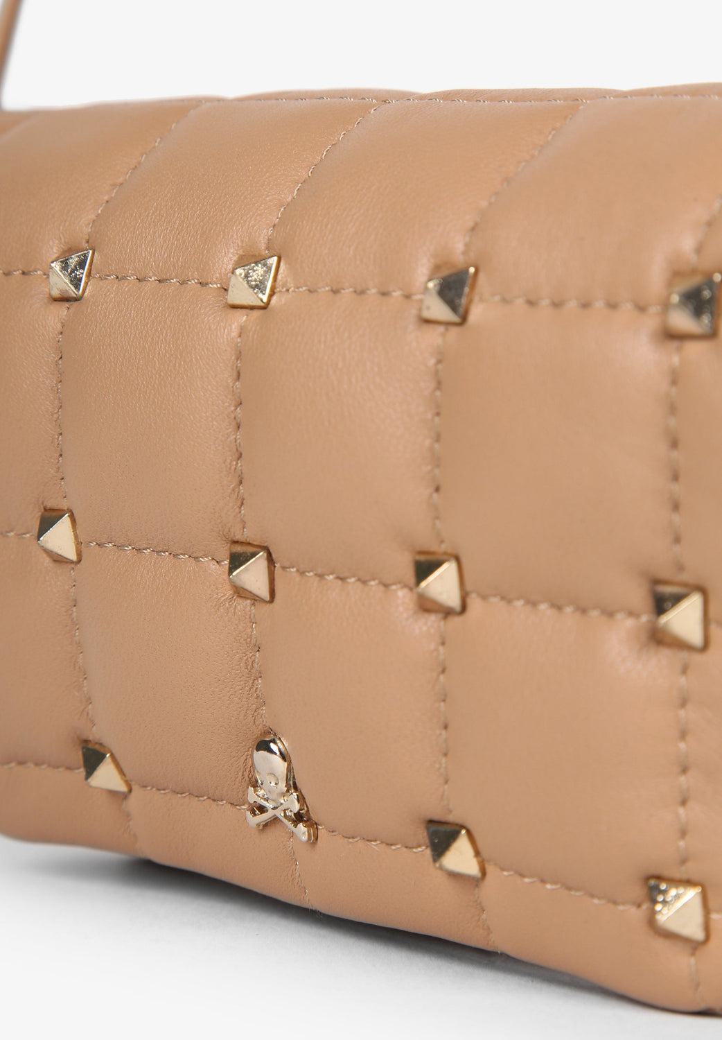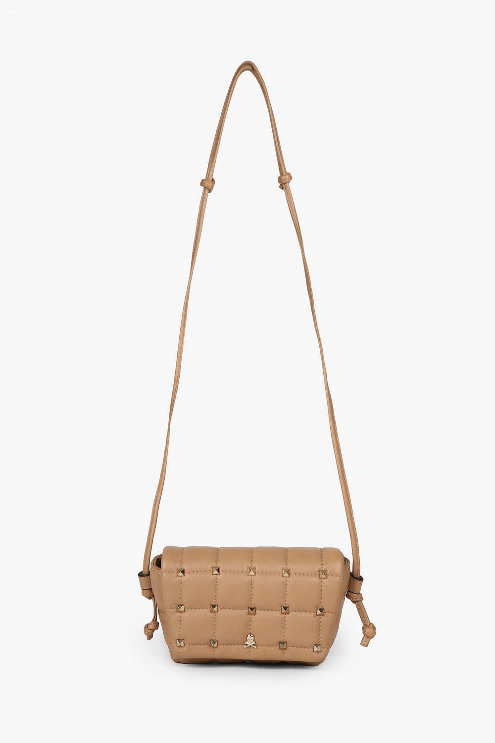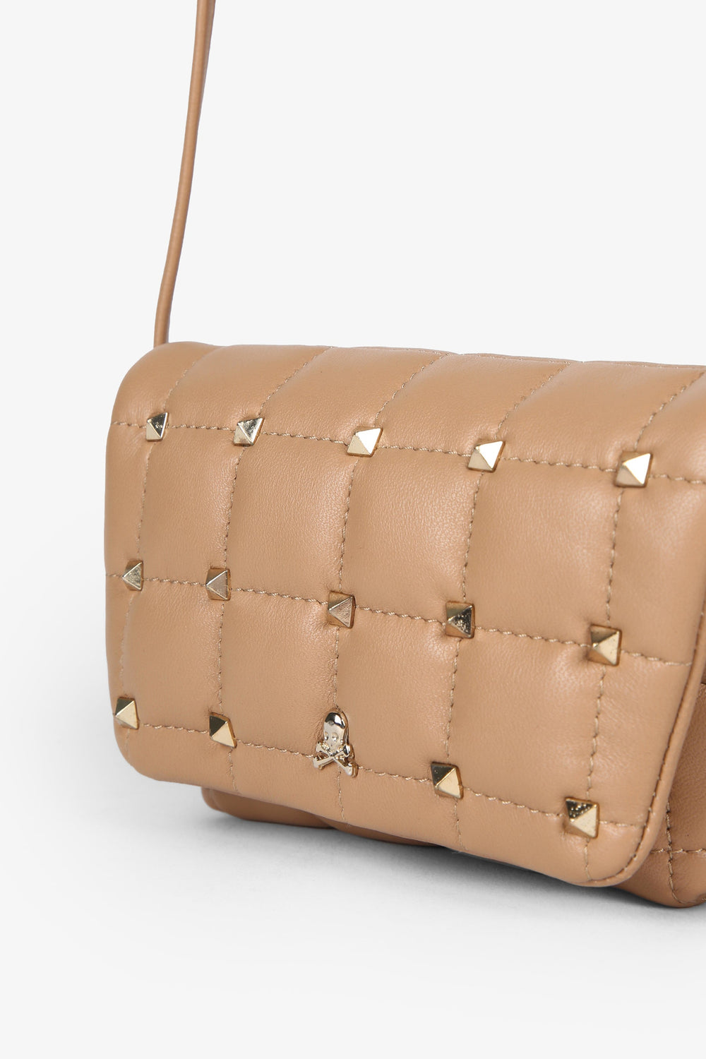 Mini quilted bag made of 100% leather with studs. Flap and snap button fastening, long adjustable strap with knots and skull detail. Height: 10 cm / Width: 16 cm / Depth: 6 cm / Adjustable strap: 110 cm.