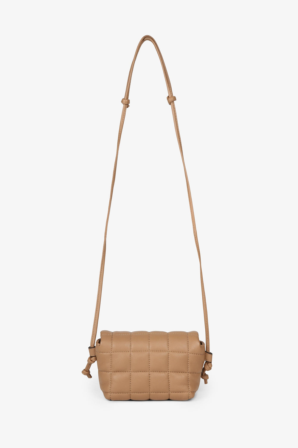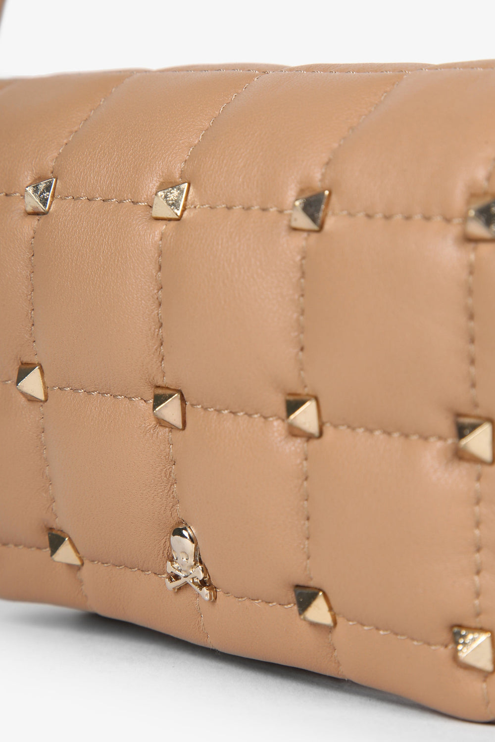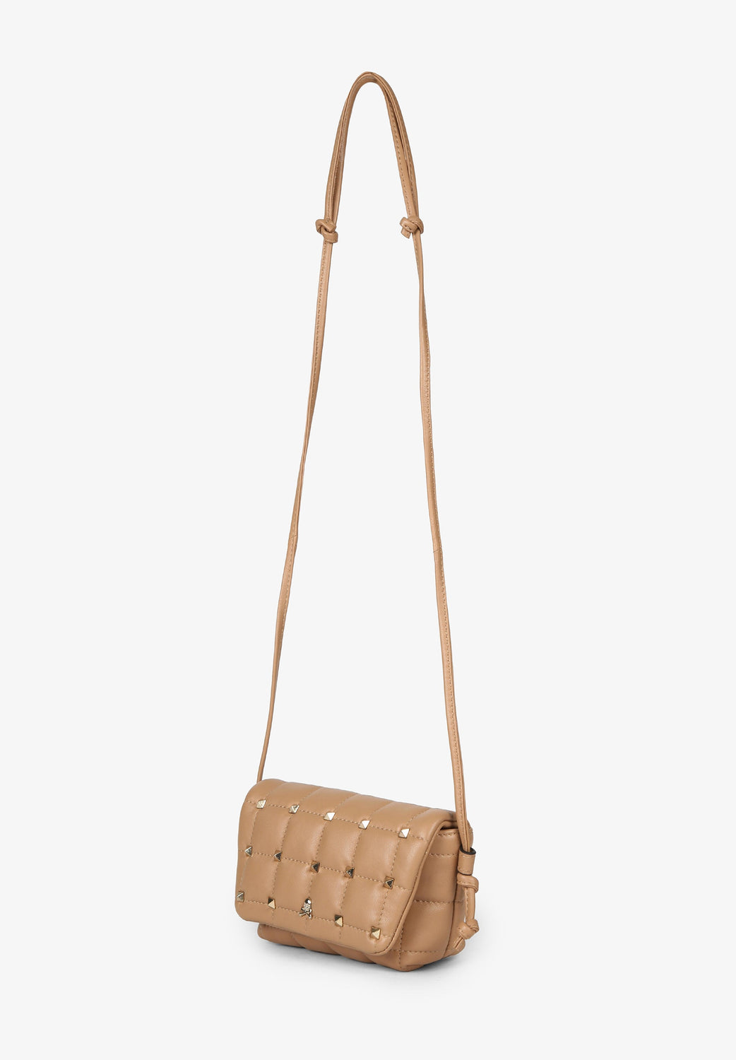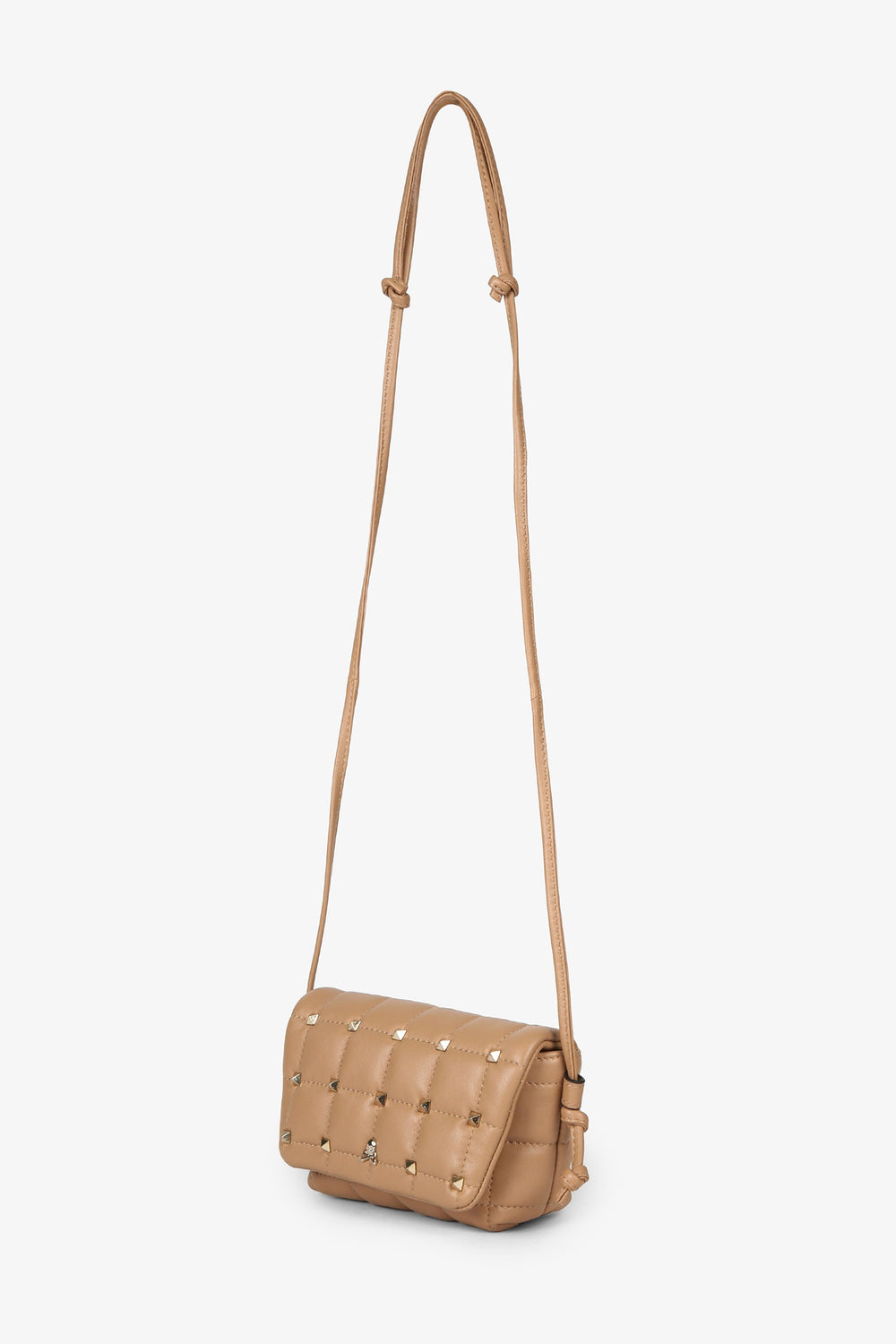 Mini quilted bag made of 100% leather with studs. Flap and snap button fastening, long adjustable strap with knots and skull detail. Height: 10 cm / Width: 16 cm / Depth: 6 cm / Adjustable strap: 110 cm.