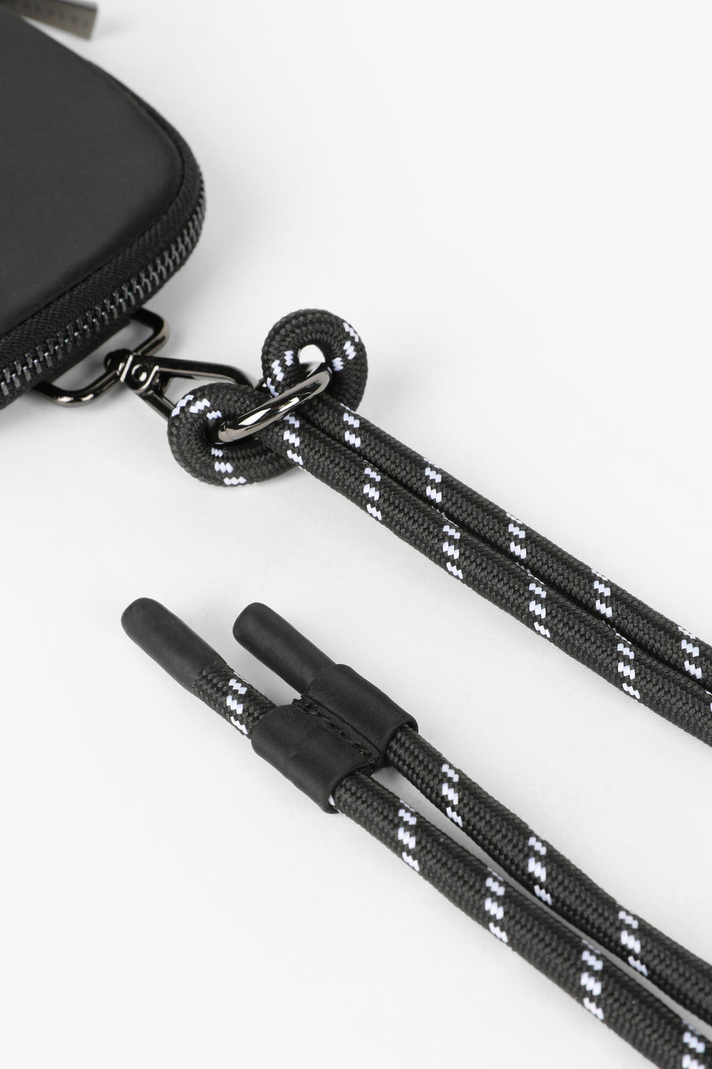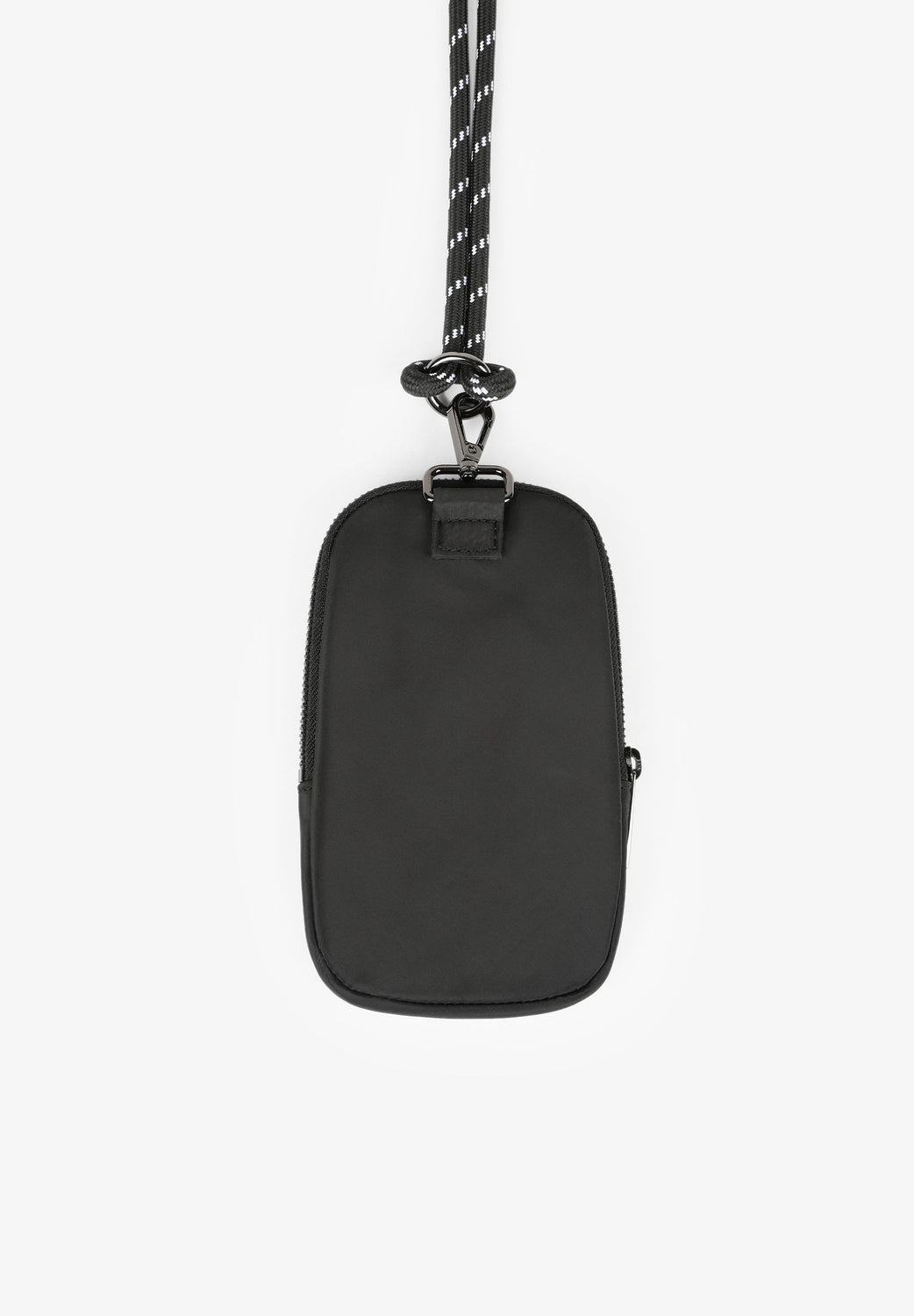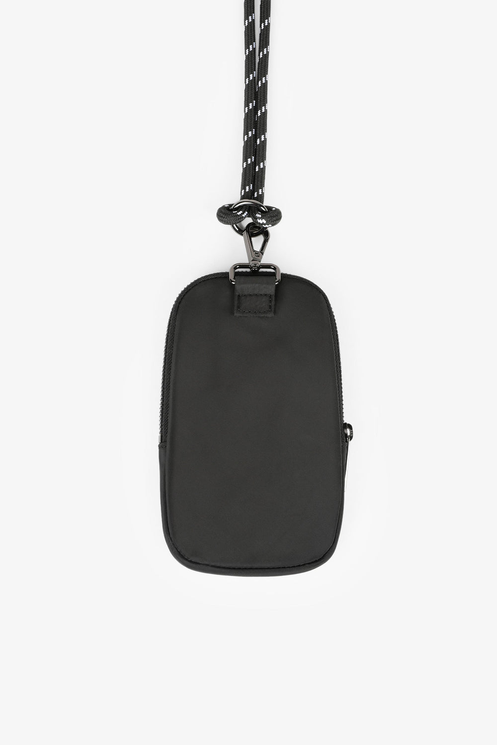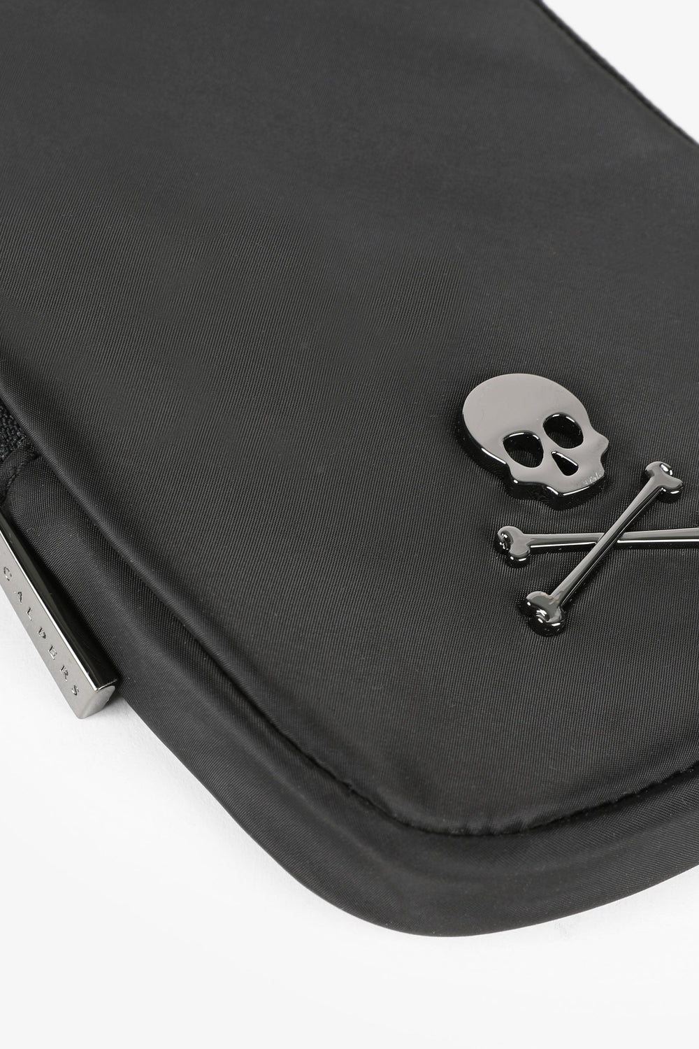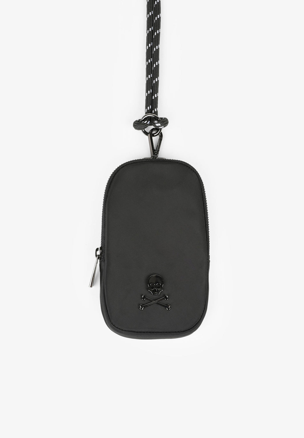 Mini mobile phone bag. Made from technical fabric, with a metallic effect, metal zip closure and metal skull on the front. Containing a carabiner with a cord. Height: 18.5 cm / Width: 12 cm / Depth: 2 cm