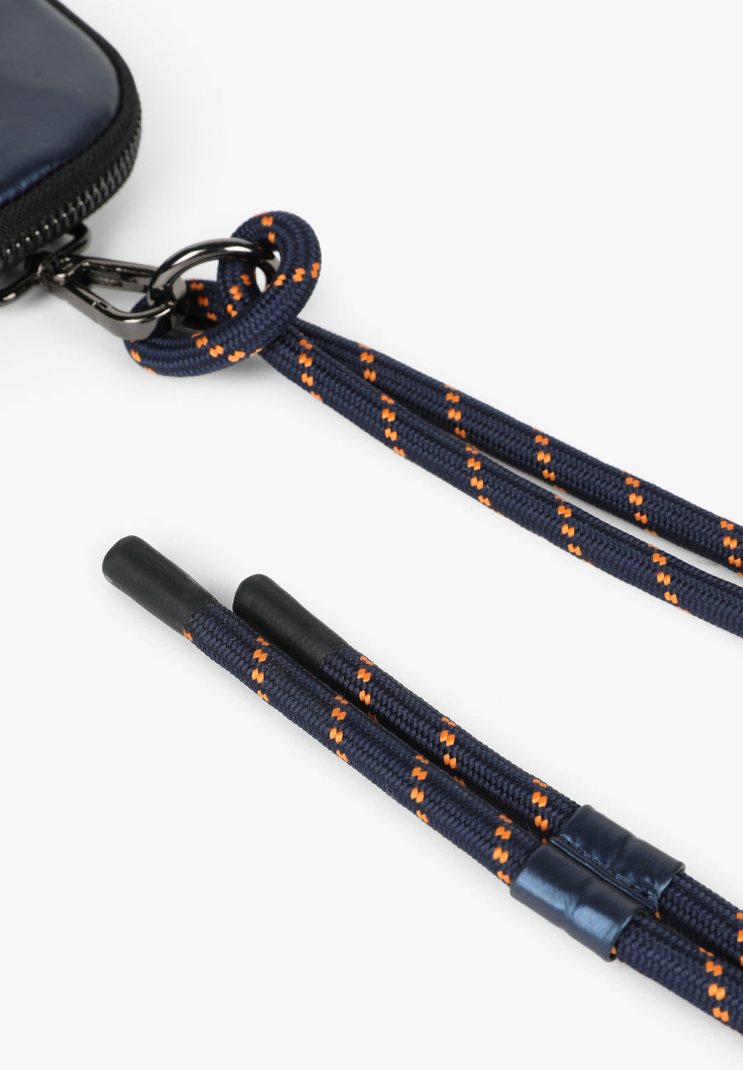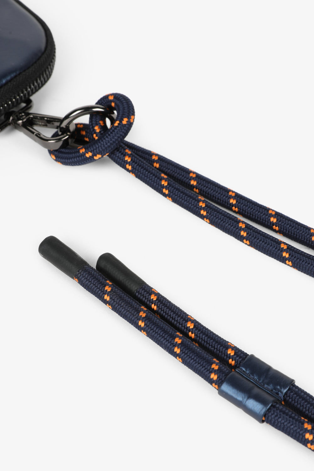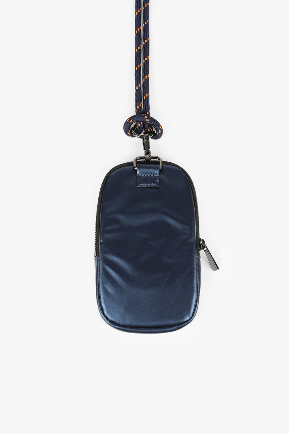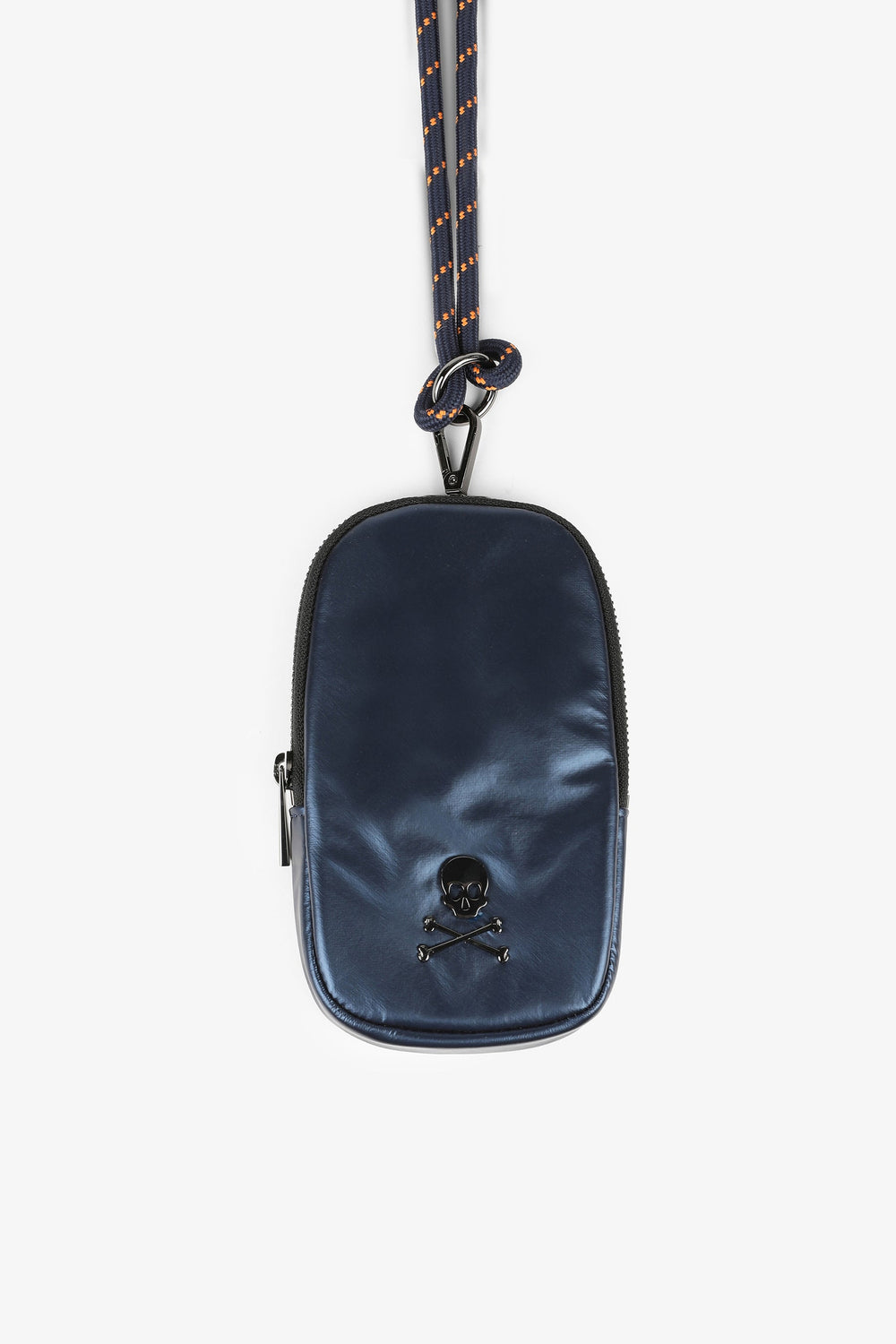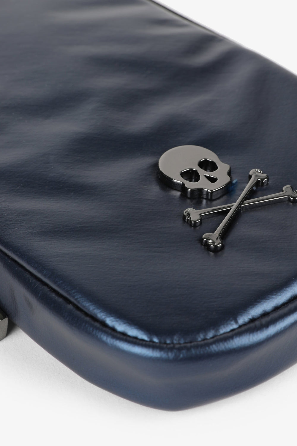 Mini mobile phone bag. Made from technical fabric, with a metallic effect, metal zip closure and metal skull on the front. Containing a carabiner with a cord. Height: 18.5 cm / Width: 12 cm / Depth: 2 cm