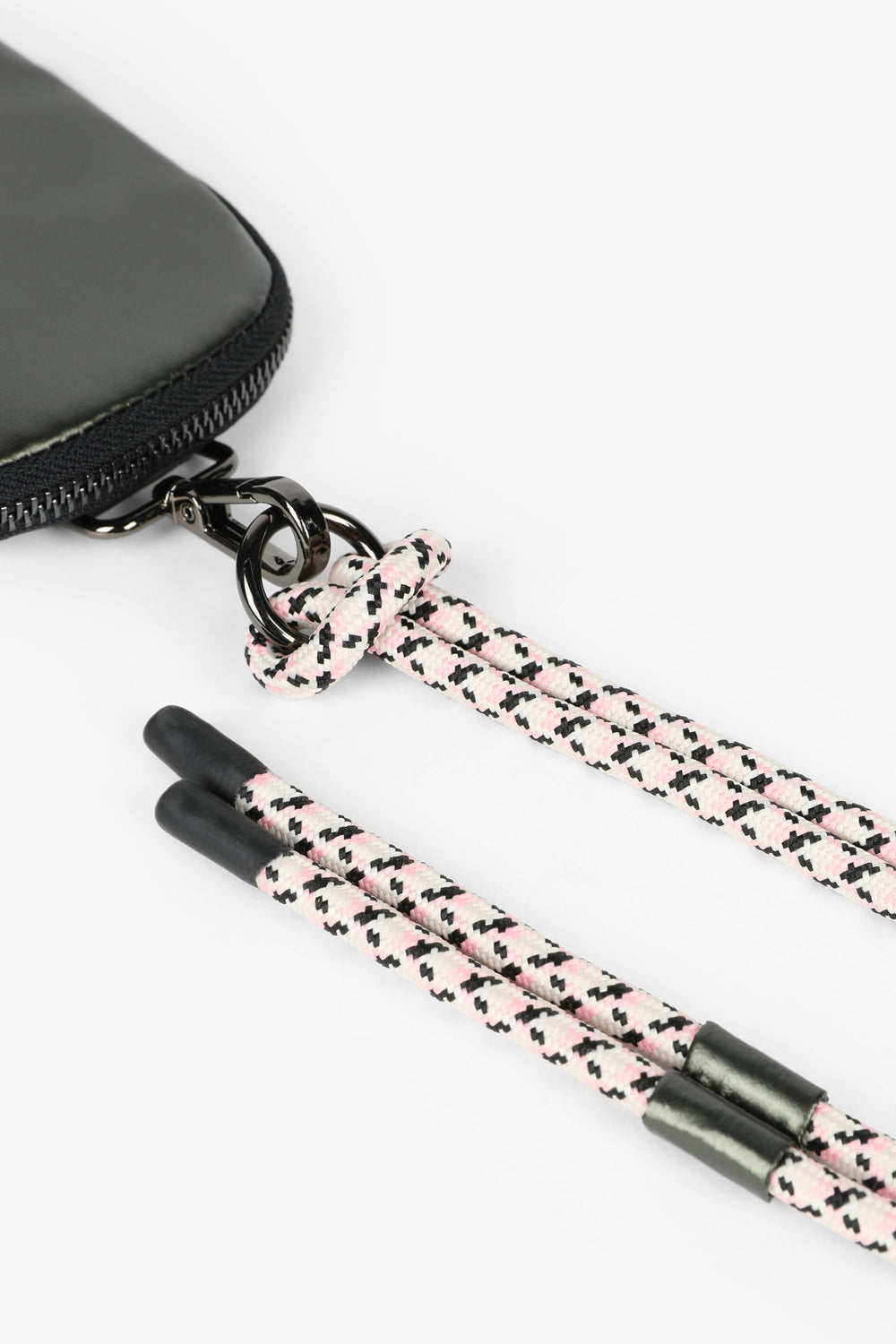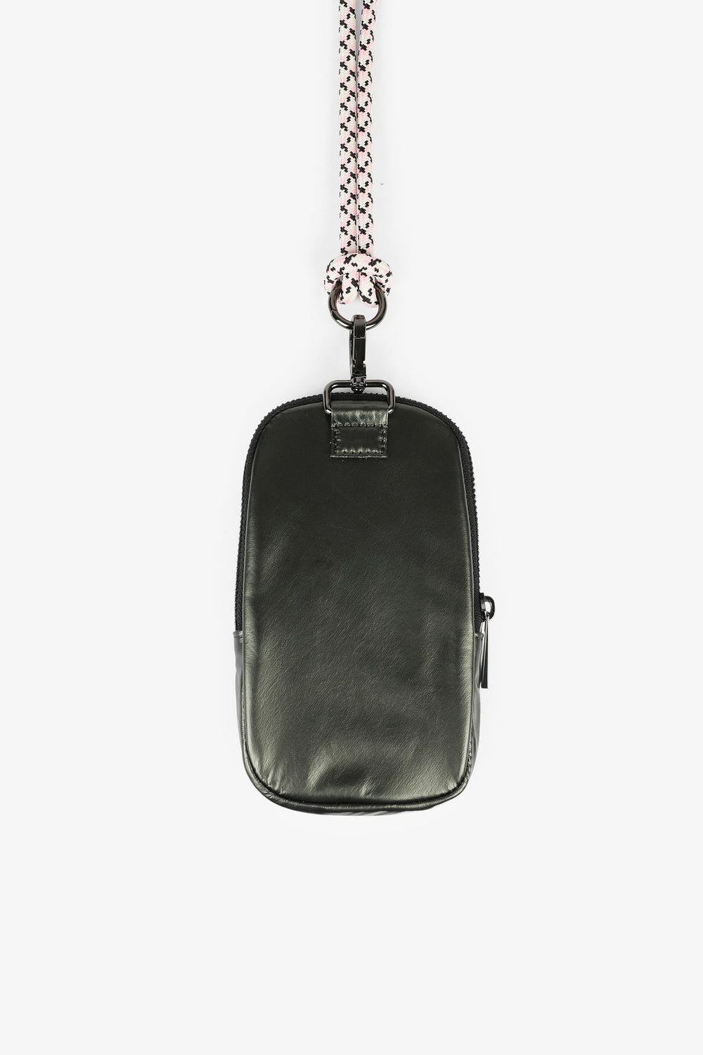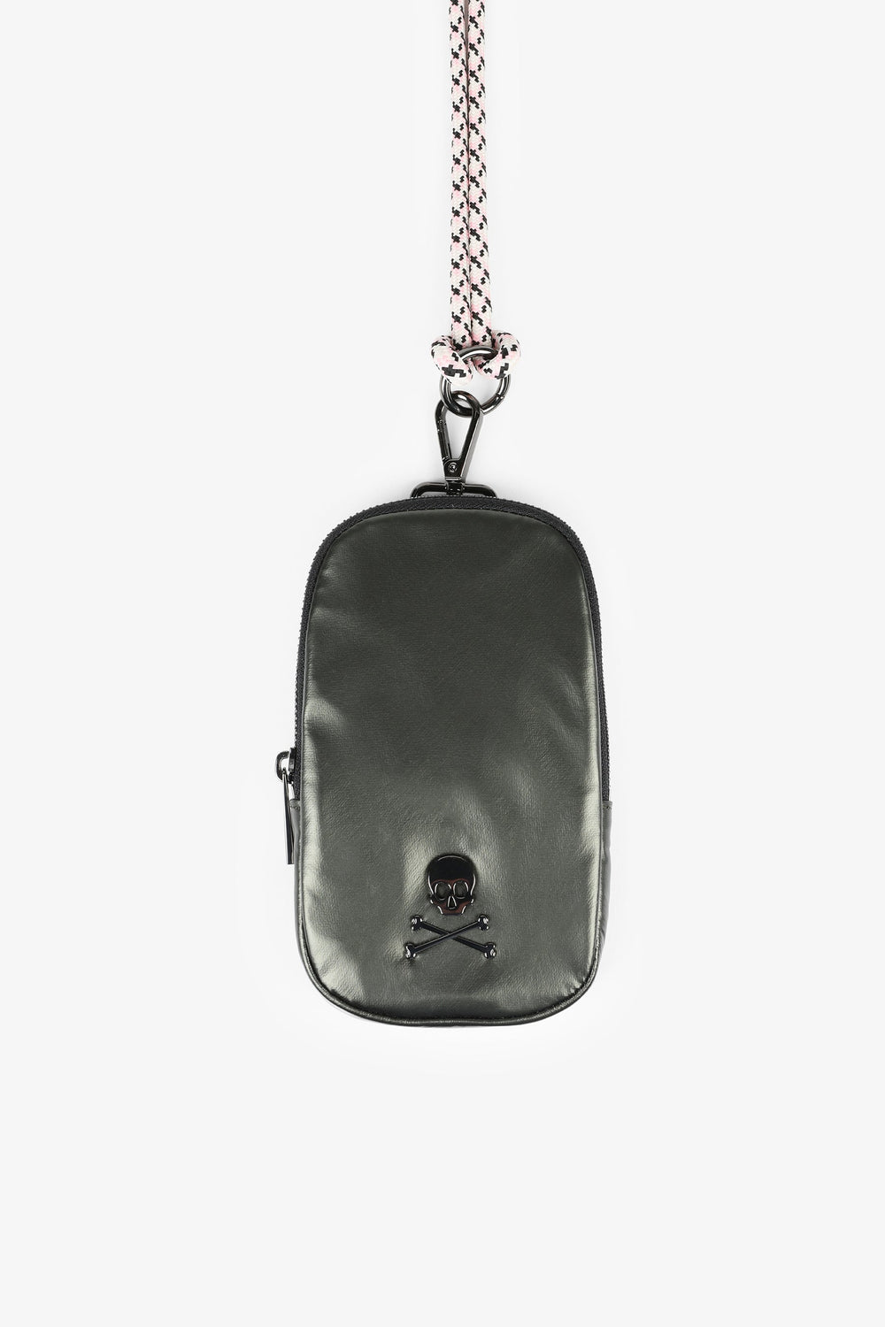 Mini mobile phone bag. Made from technical fabric, with a metallic effect, metal zip closure and metal skull on the front. Containing a carabiner with a cord. Height: 18.5 cm / Width: 12 cm / Depth: 2 cm