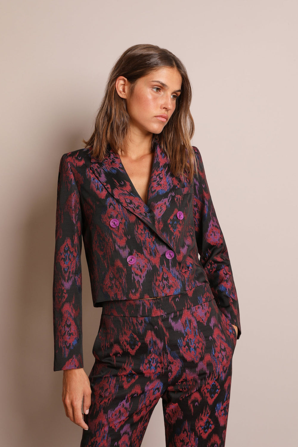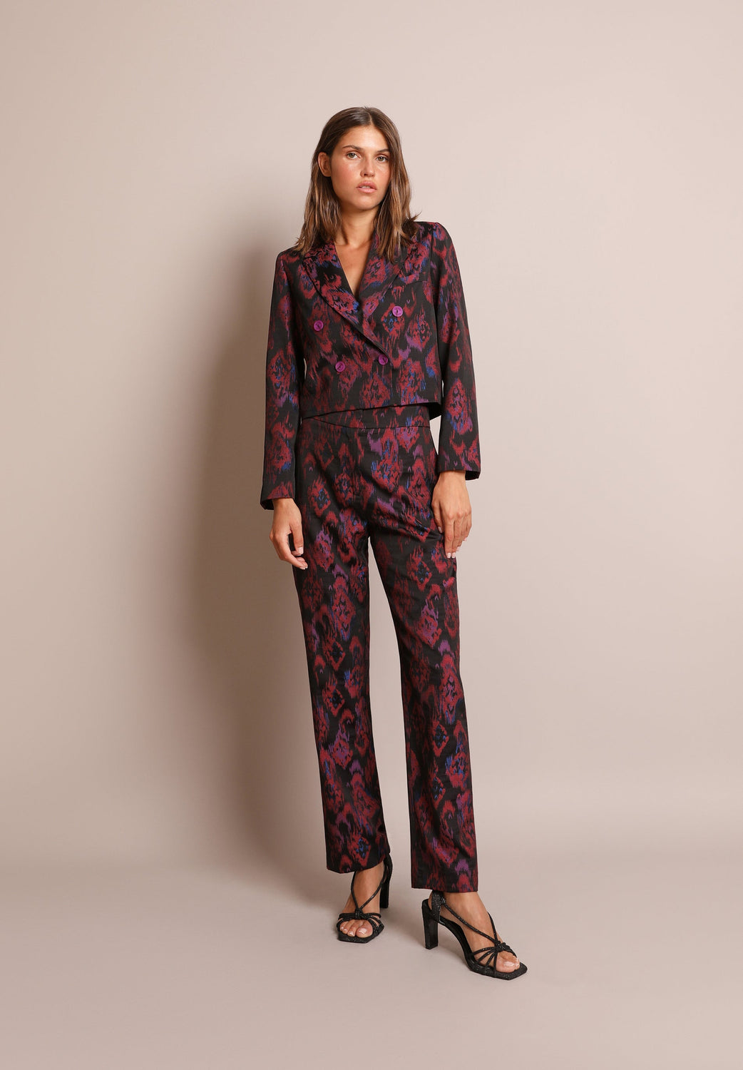 Straight printed trousers. Made of comfortable fabric, straight fit, high waist with two side pockets and one back pocket