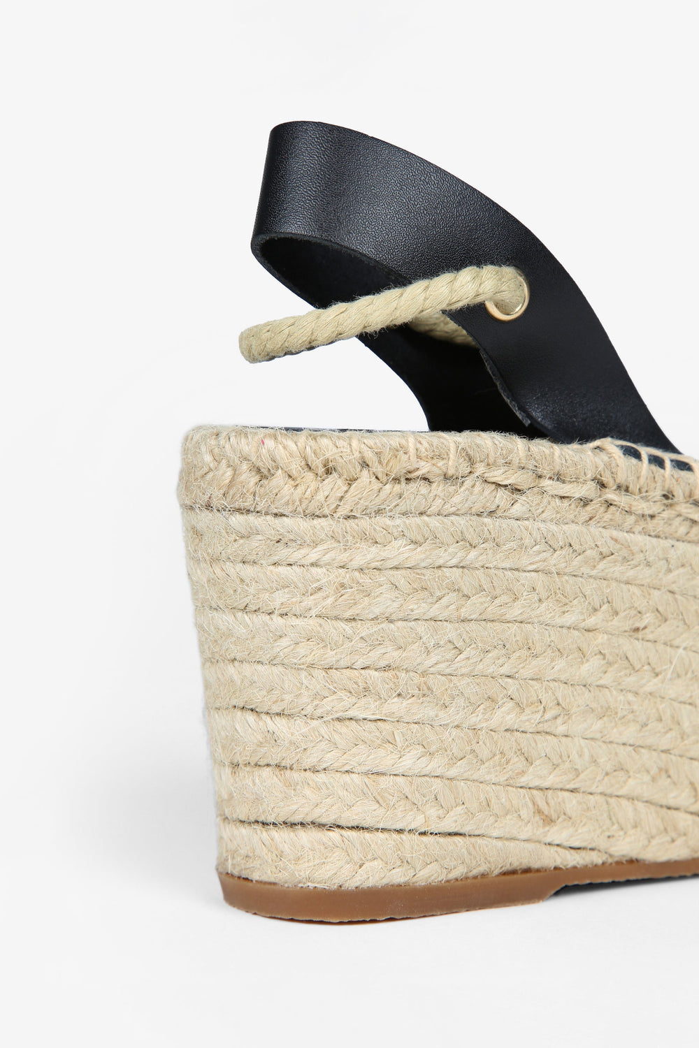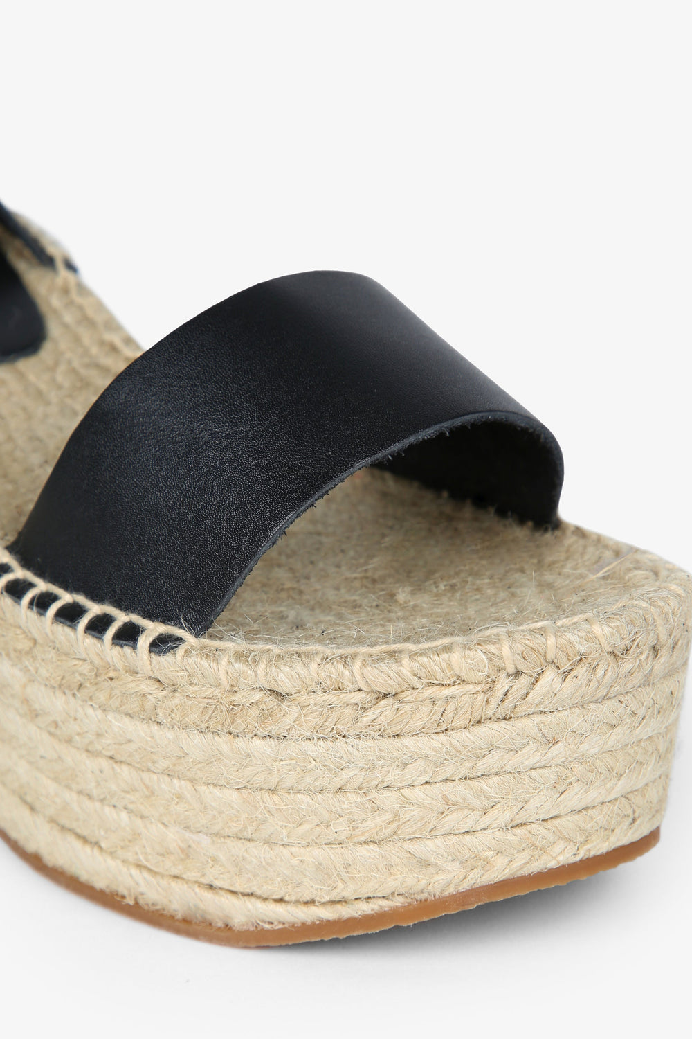 Wedge espadrilles made of jute and leather. Rubber sole and front platform.