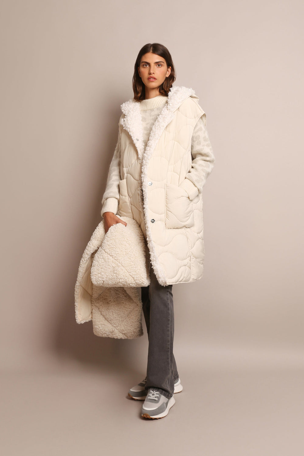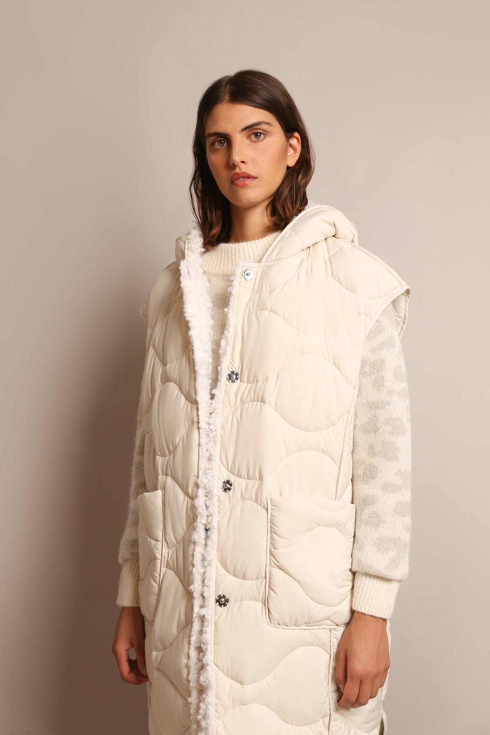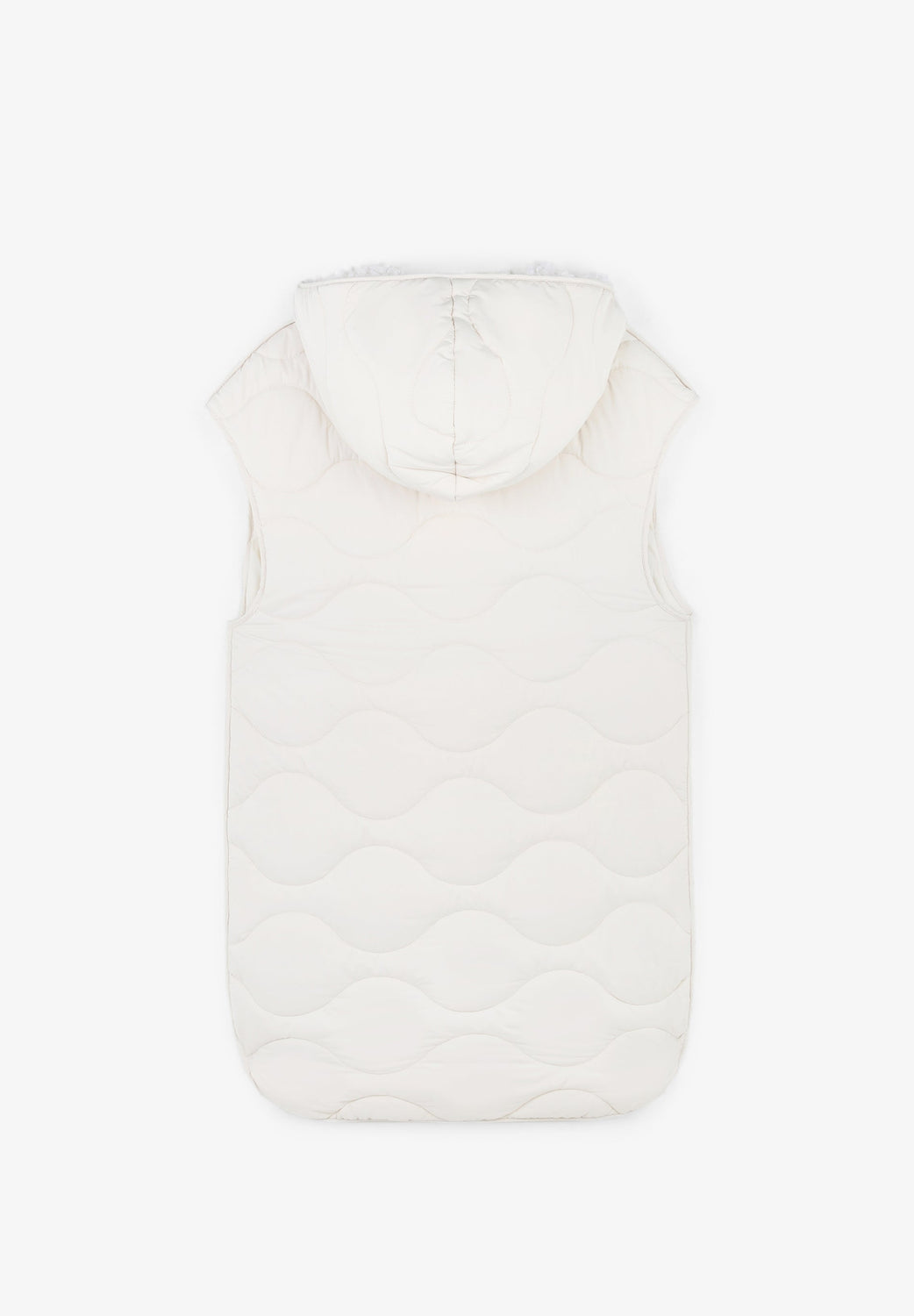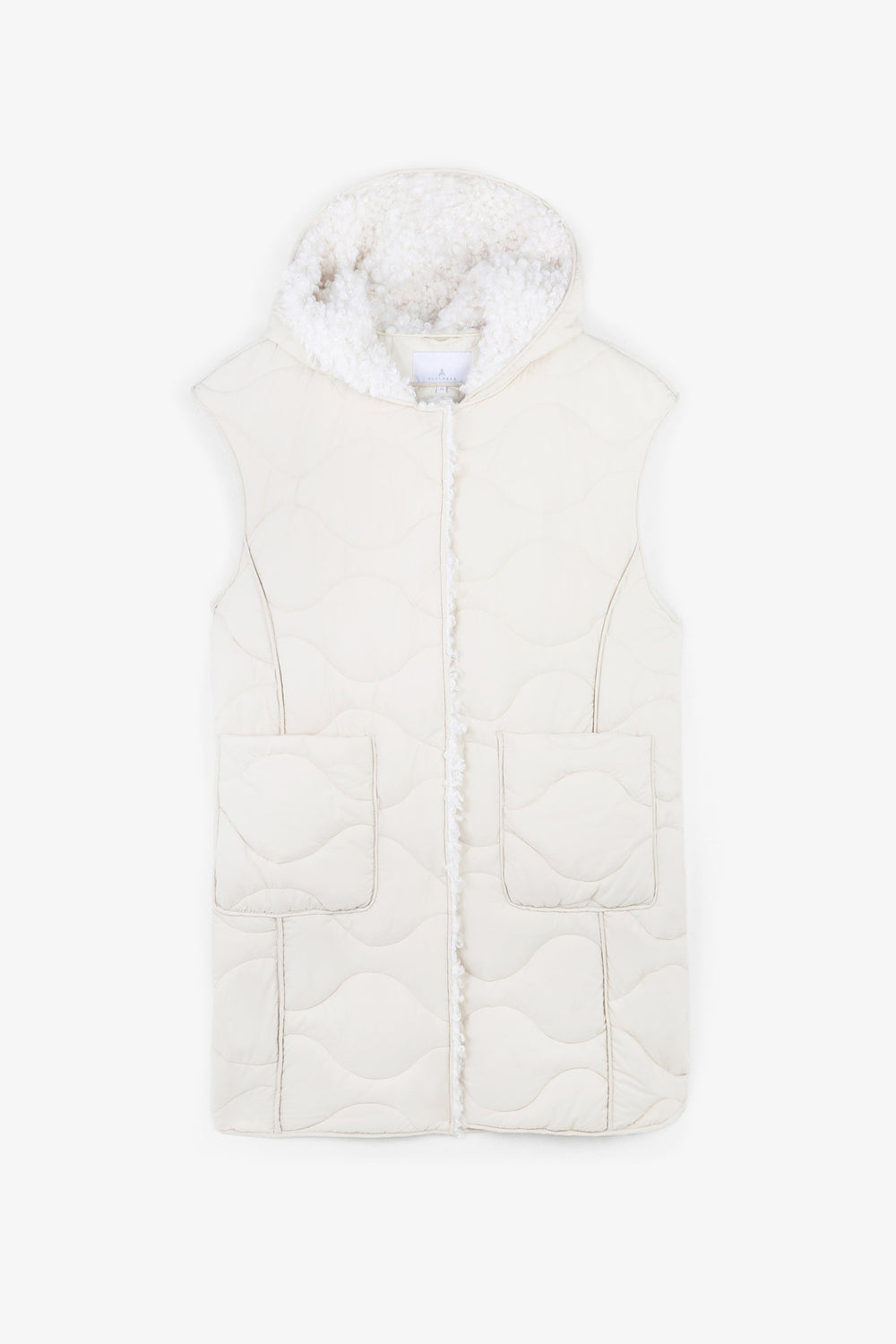 Long waistcoat with shearling lining made from technical fabric. Regular fit, snap fastening and hooded collar. Sleeveless and featuring patch pockets.