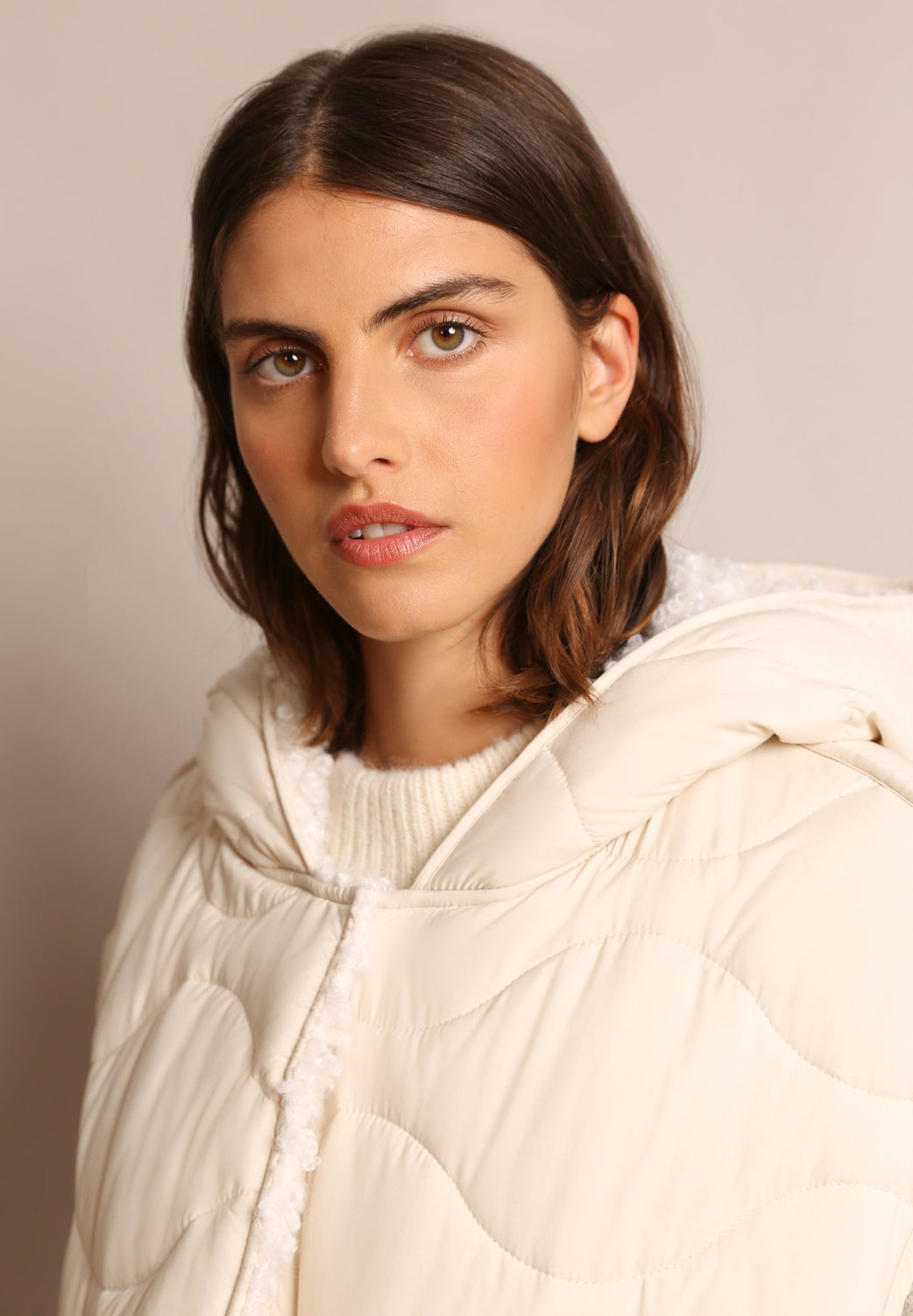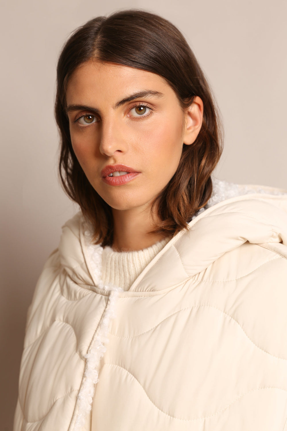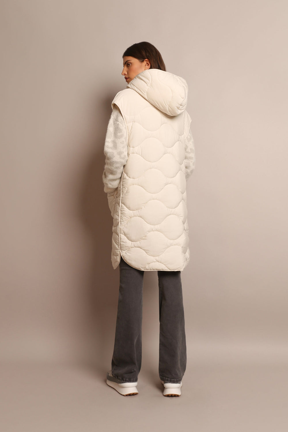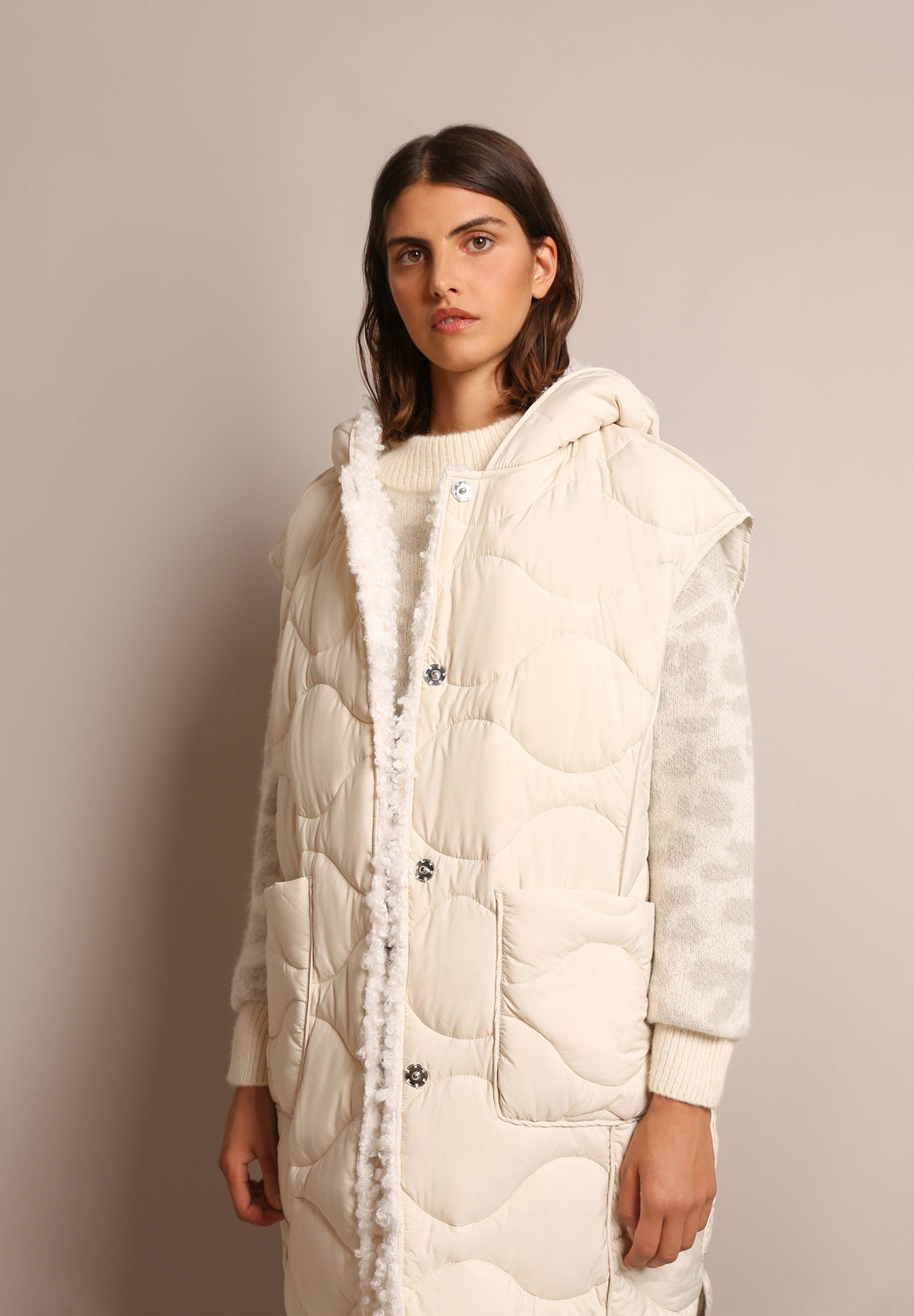 Long waistcoat with shearling lining made from technical fabric. Regular fit, snap fastening and hooded collar. Sleeveless and featuring patch pockets.