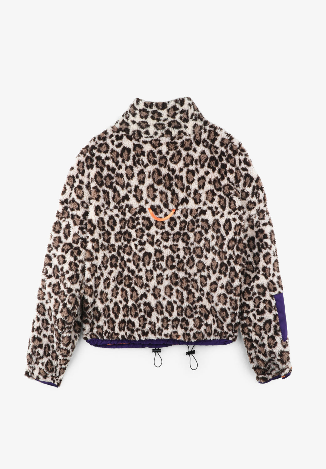 Fleece jacket with animal print, made from shearling fabric. Regular fit, high collar and contrast zip fastening. Long sleeves and contrast front zip pocket. Contrast lining.