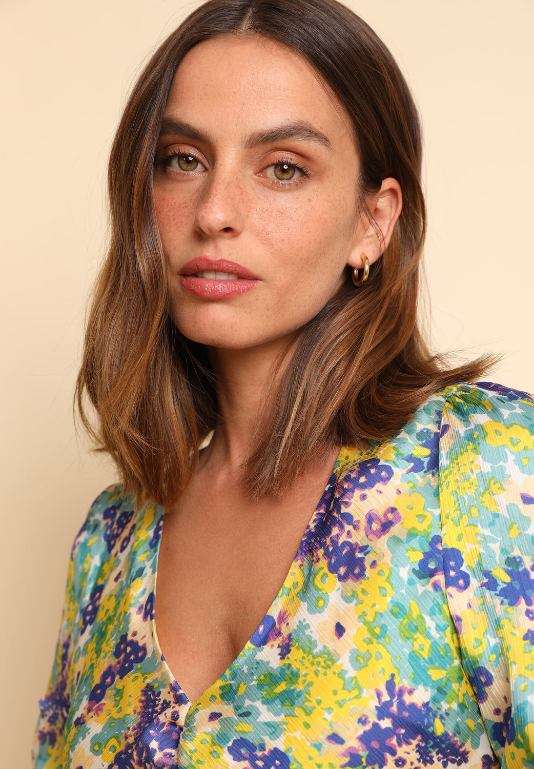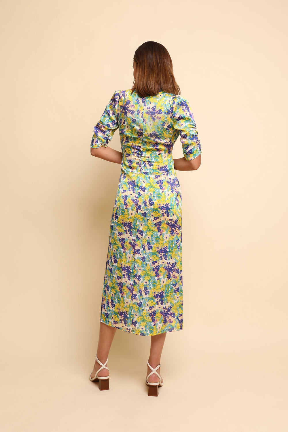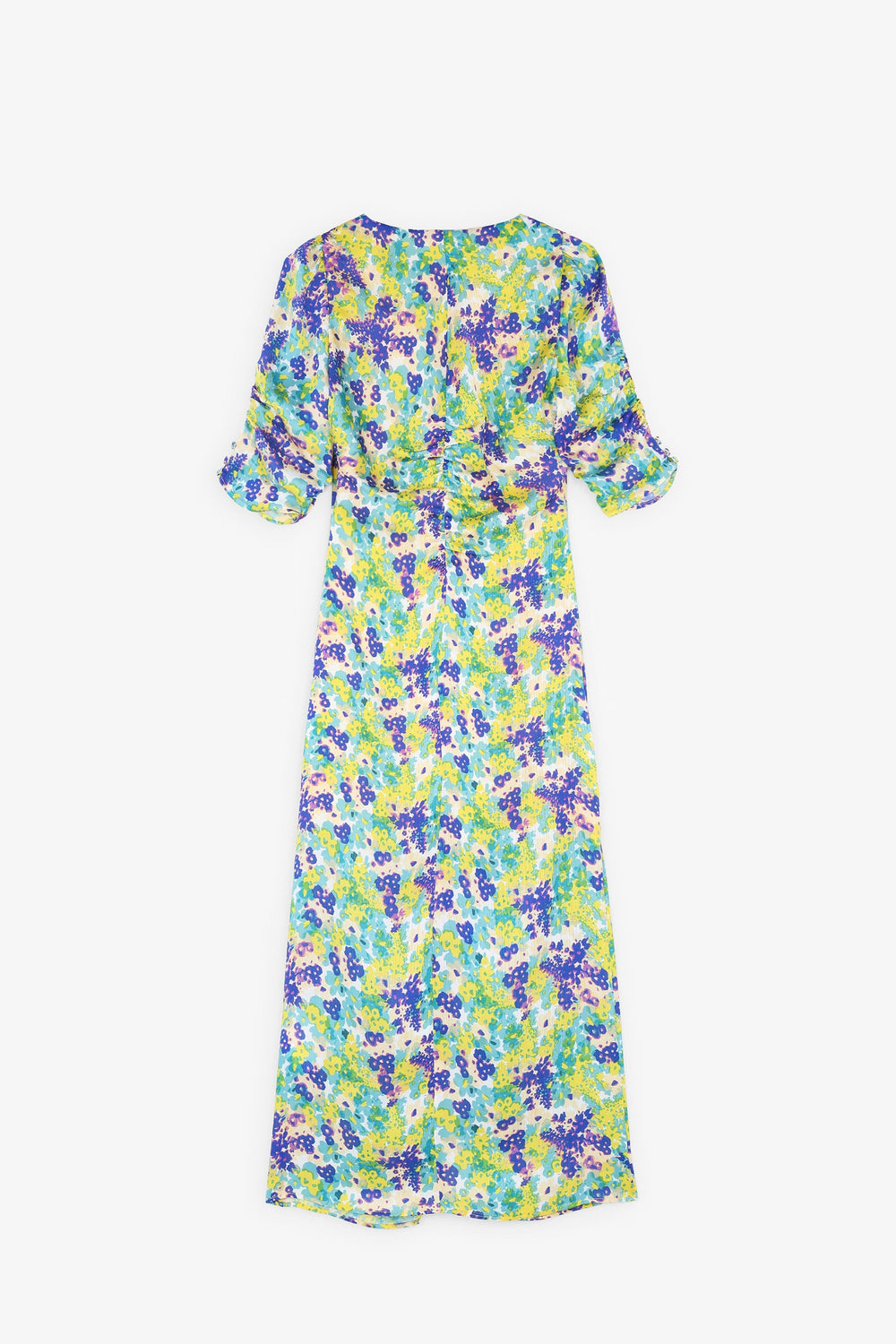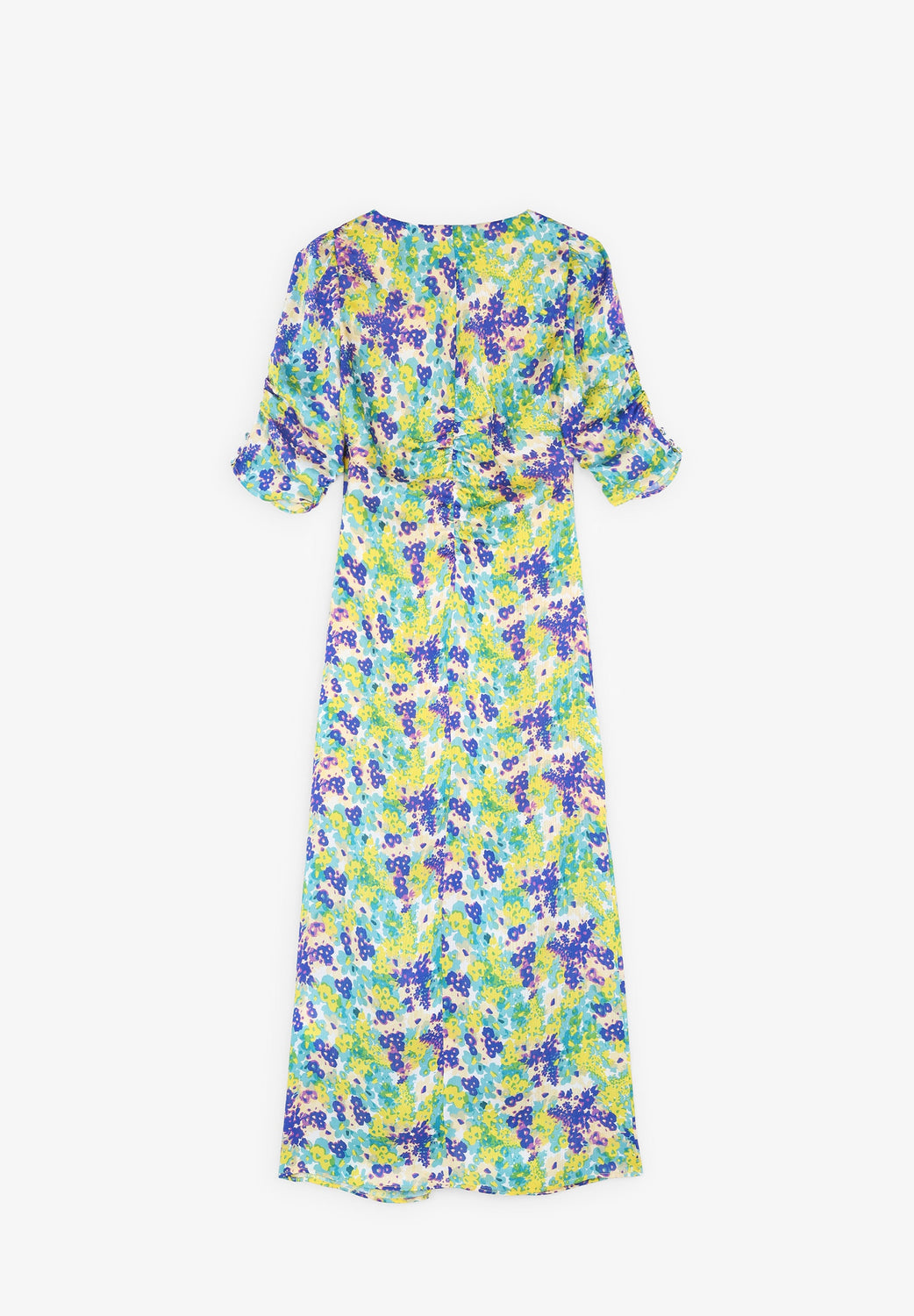 Midi dress with floral print. Made of flowing fabric. Slim fit. Zip fastening. V-neck. Front slit. 3/4 length sleeves with gathered detail.