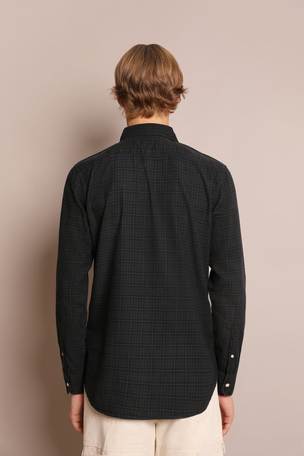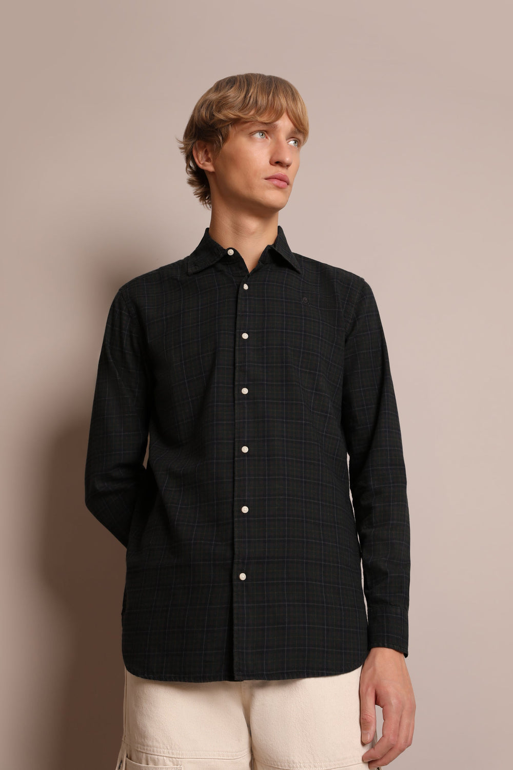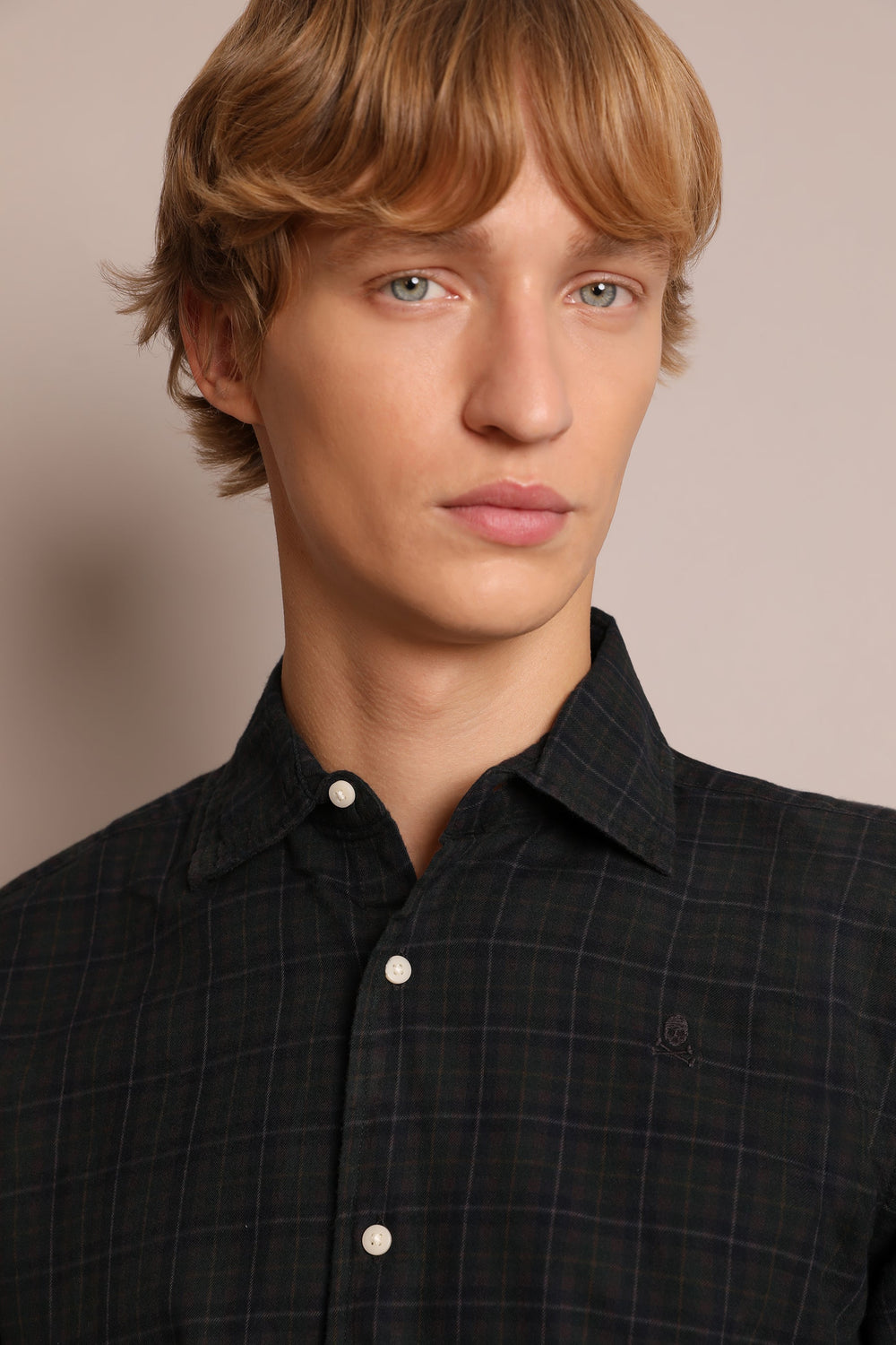 100% cotton shirt with mini check. Regular fit, cutaway collar and button fastening. Long sleeves with buttoned cuffs.