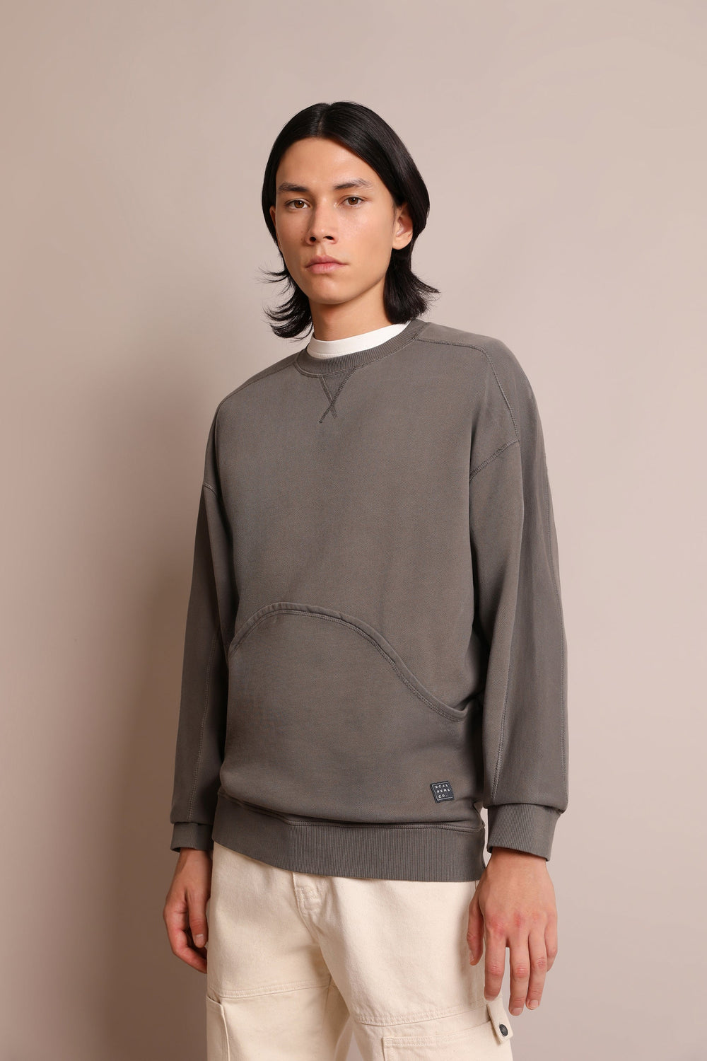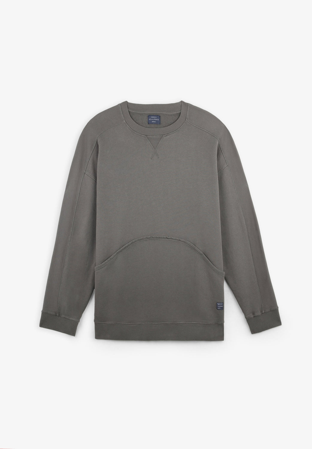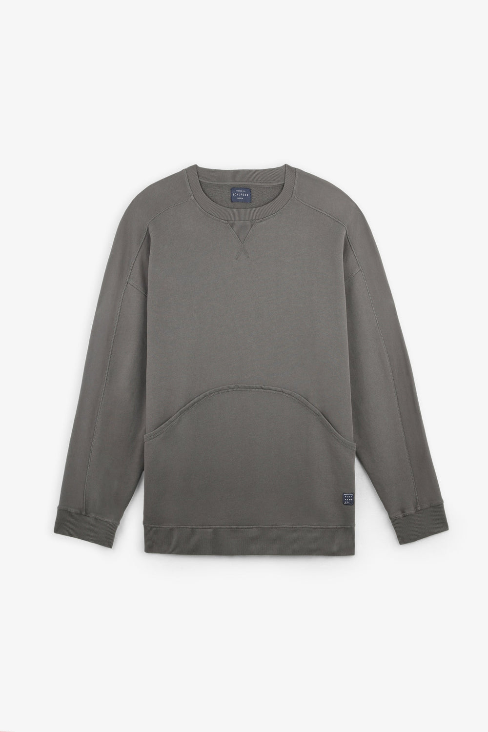 Sweatshirt with a pouch pocket. Made from 100% organic cotton, oversized cut, high pouch, round neck with crossover stitching and side embroidery