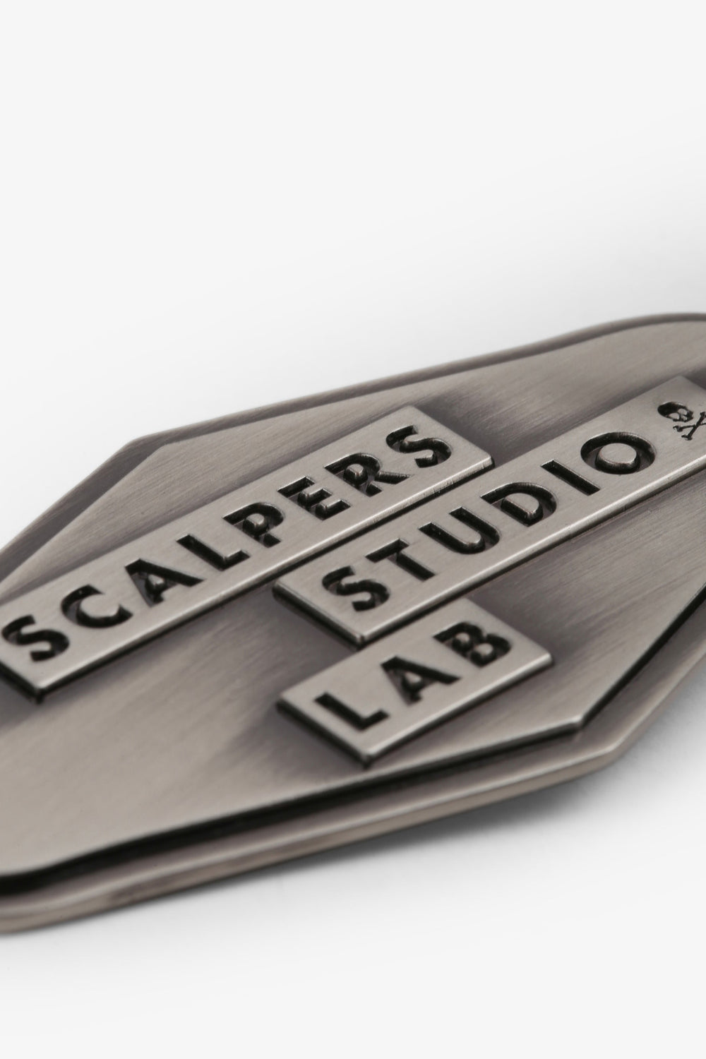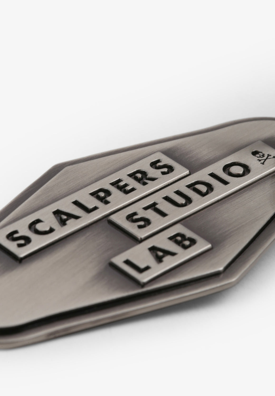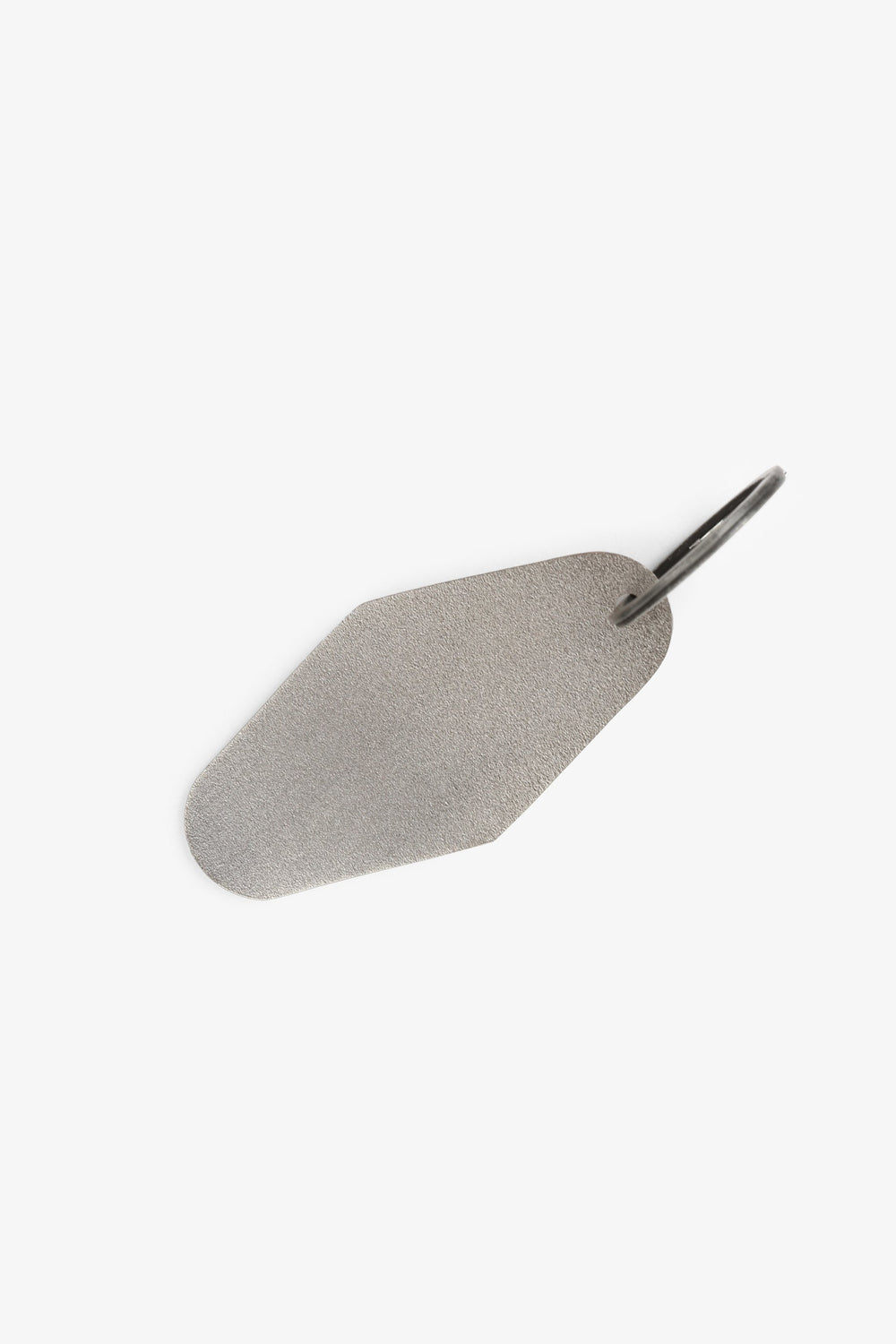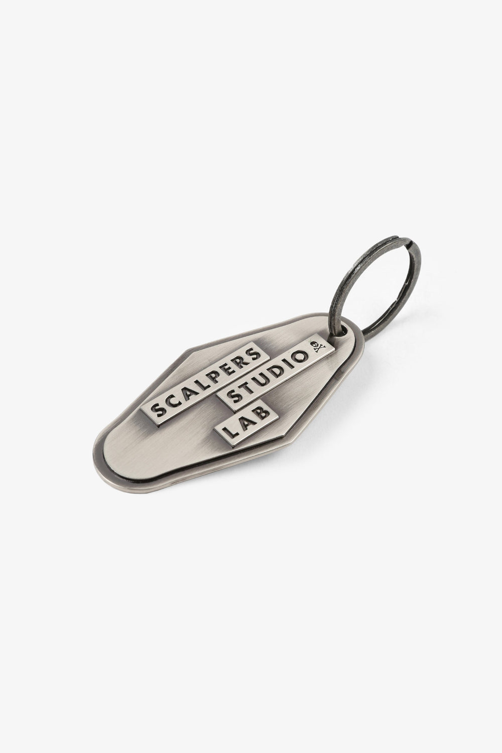 Metallic keychain. Made of metal, with metallic hoop and text and skull details