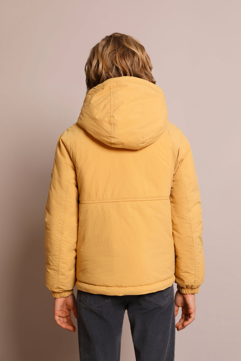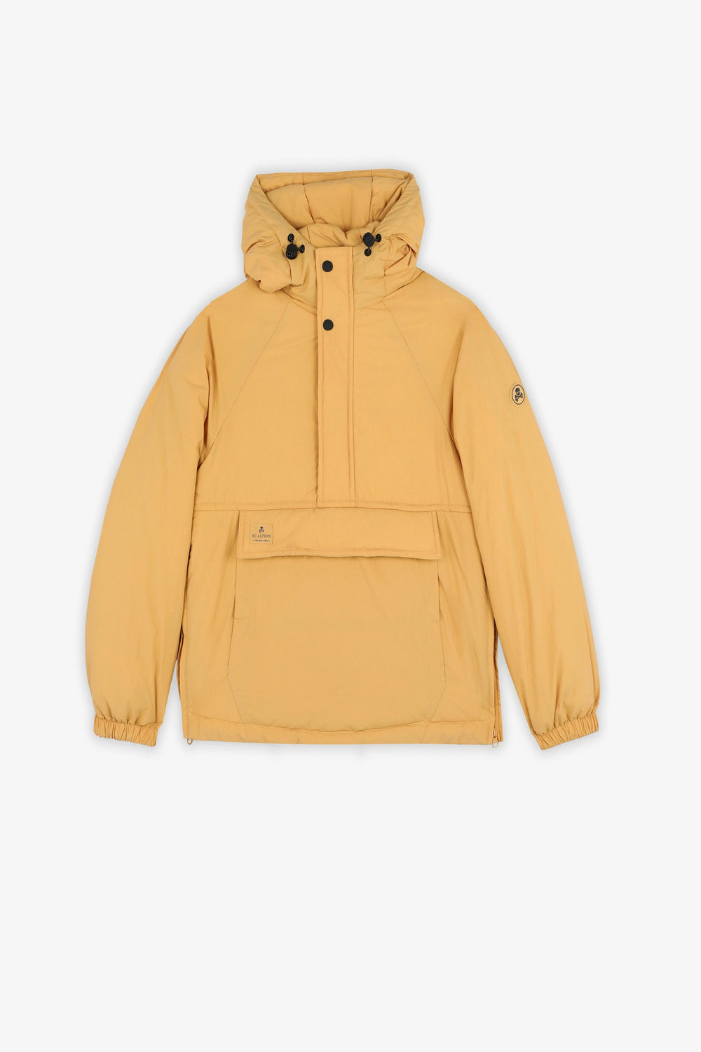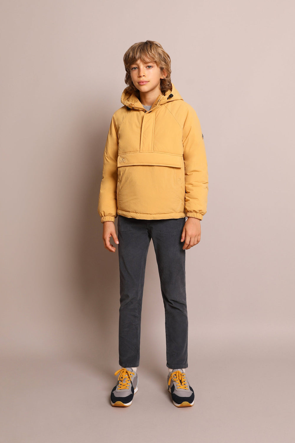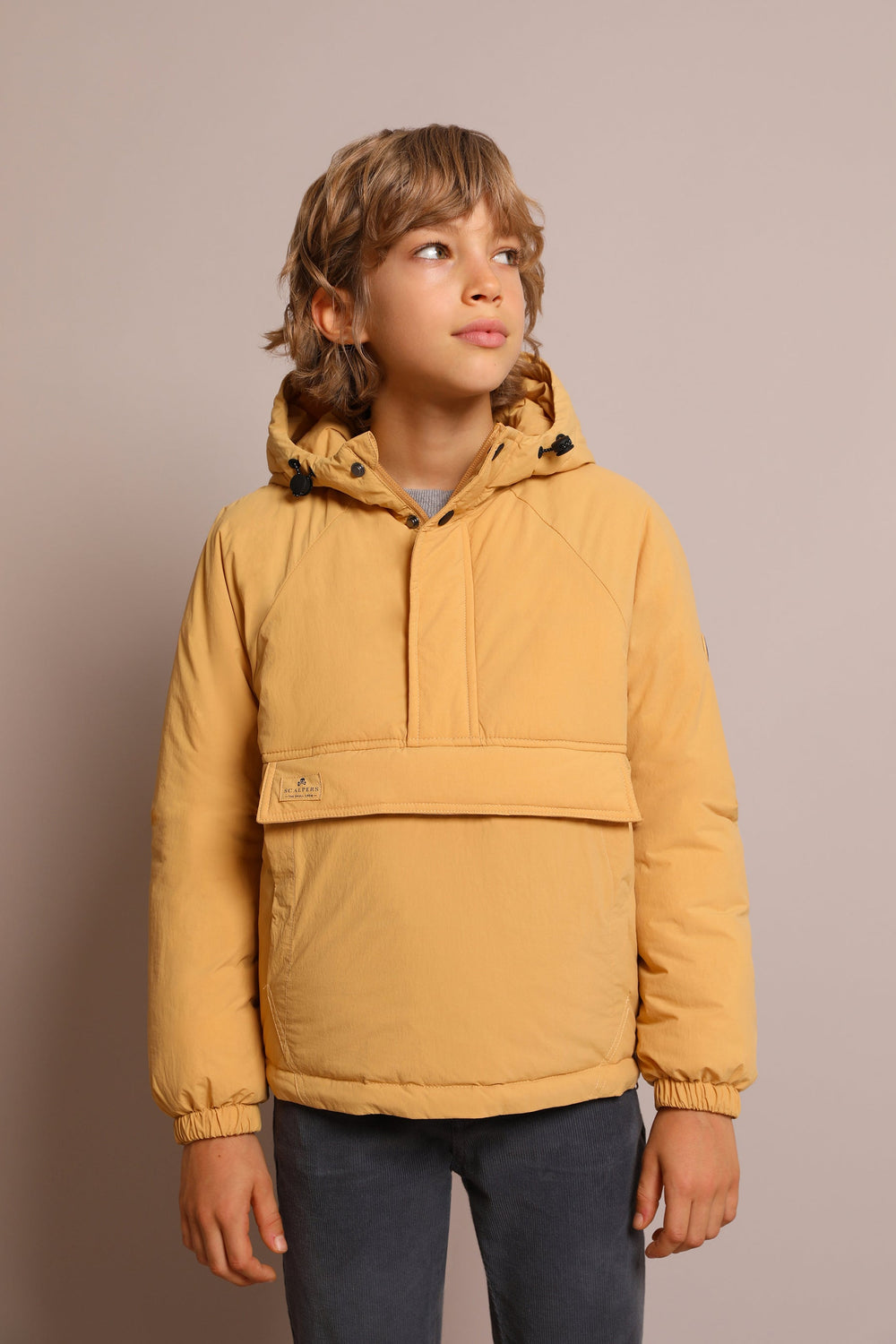 Jacket with a pouch pocket. Made from technical fabric, regular fit, snap button fastening, hooded collar and central pouch pocket