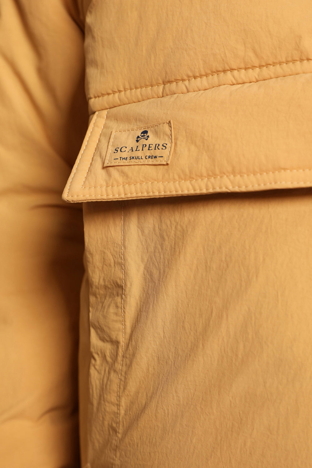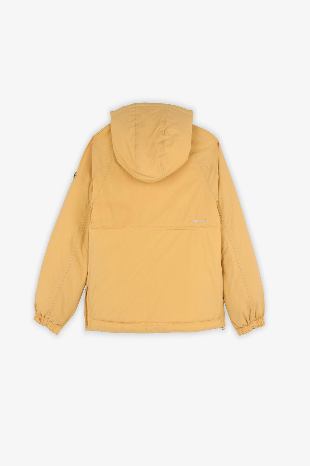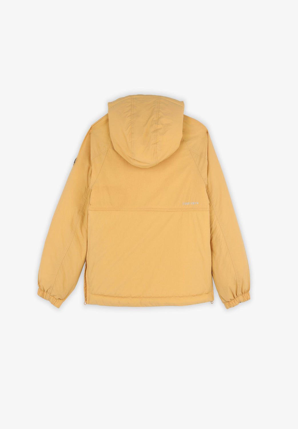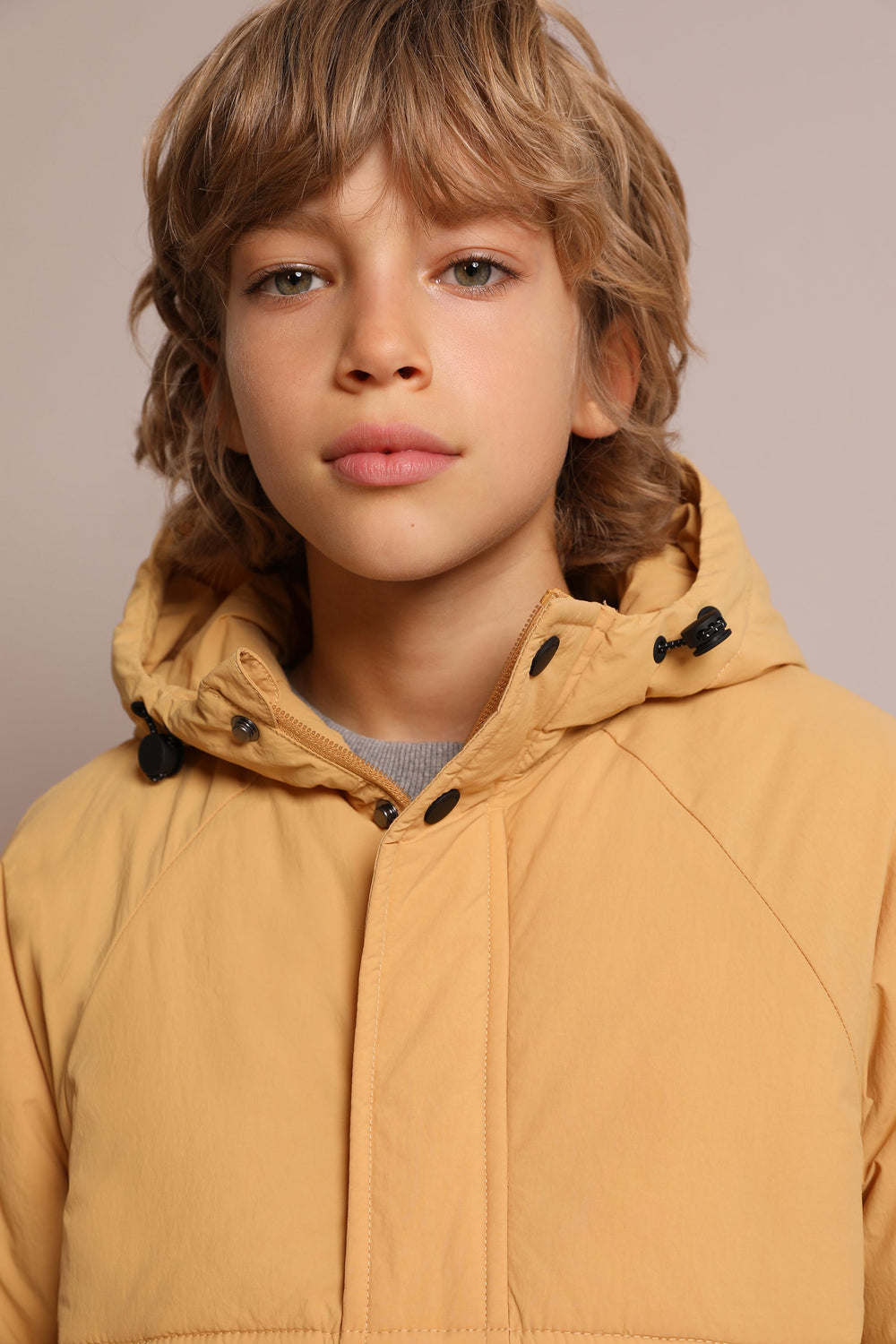 Jacket with a pouch pocket. Made from technical fabric, regular fit, snap button fastening, hooded collar and central pouch pocket