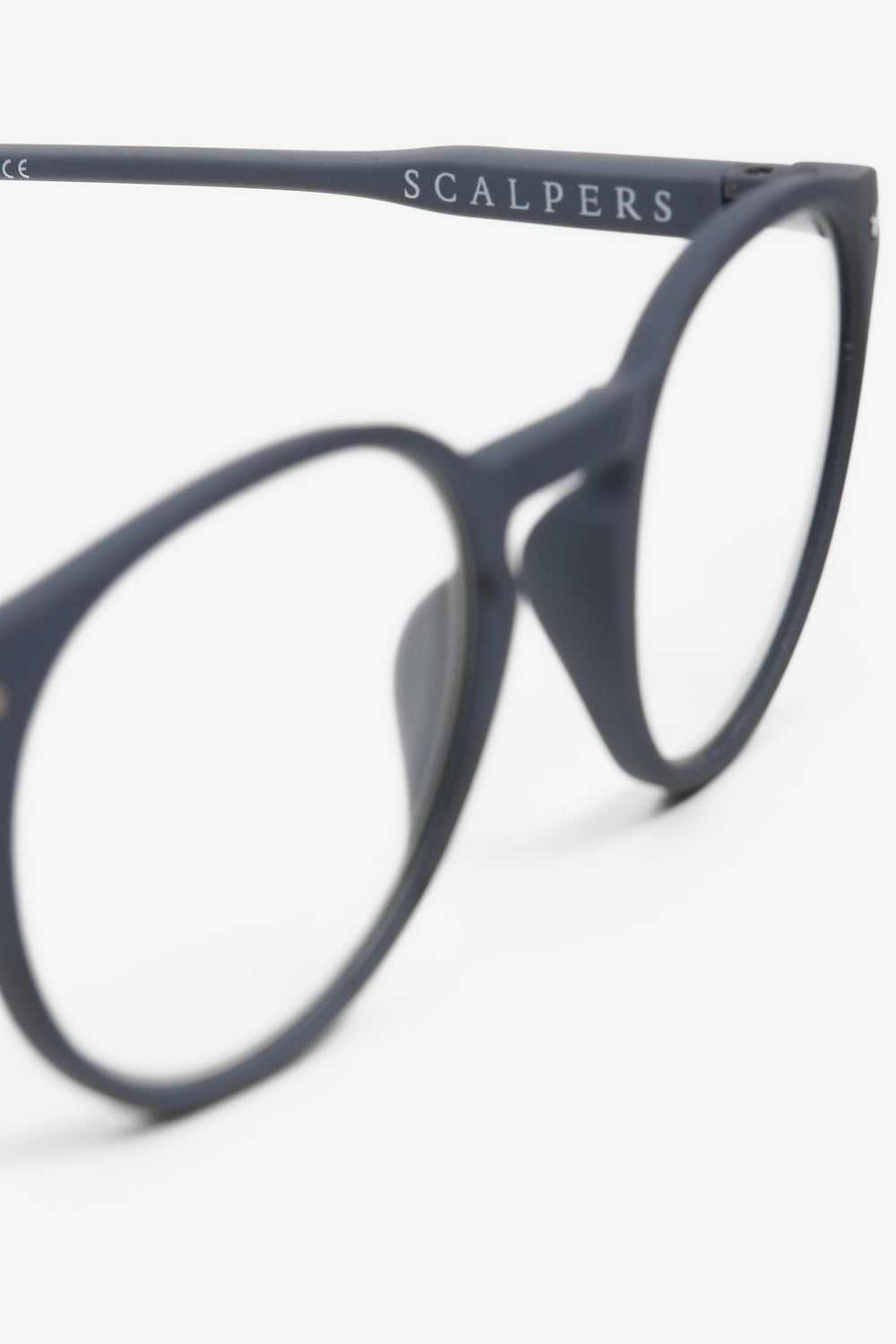 Round resin sunglasses made of polycarbonate. Prescription lenses and skull detail on the side.