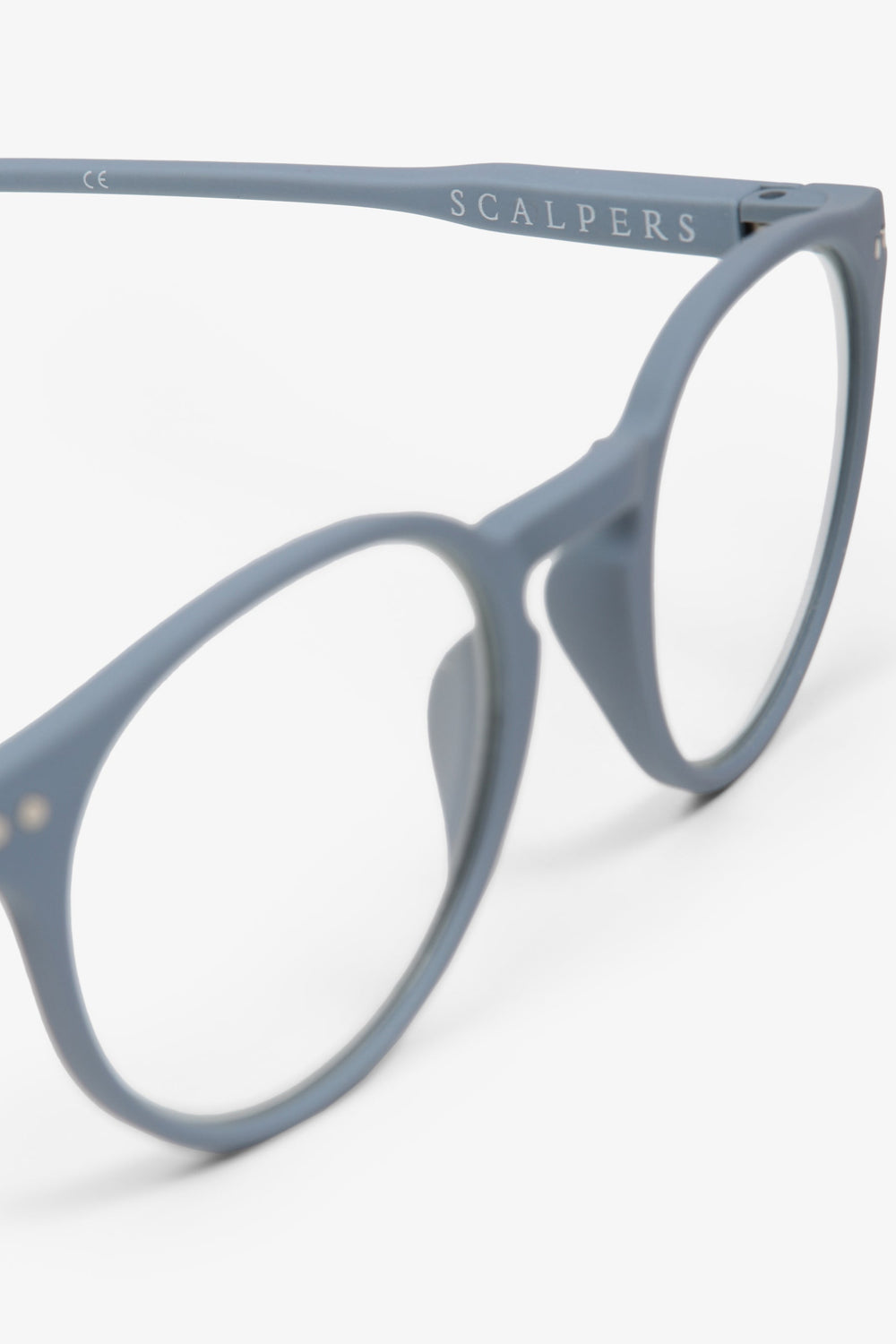 Round resin sunglasses made of polycarbonate. Prescription lenses and skull detail on the side.