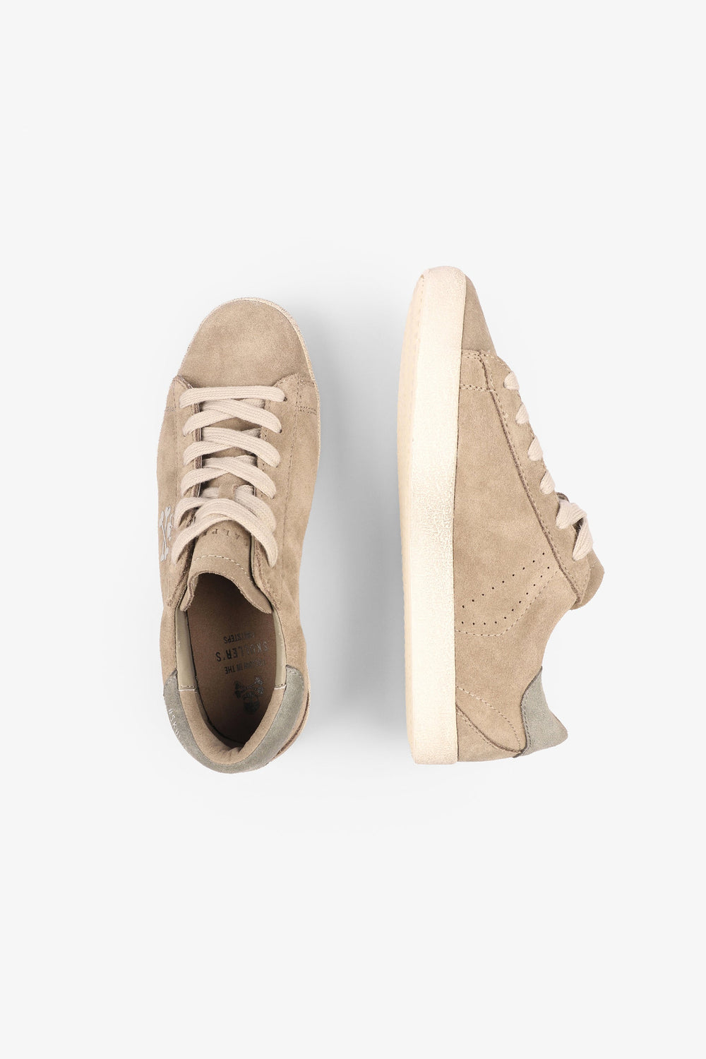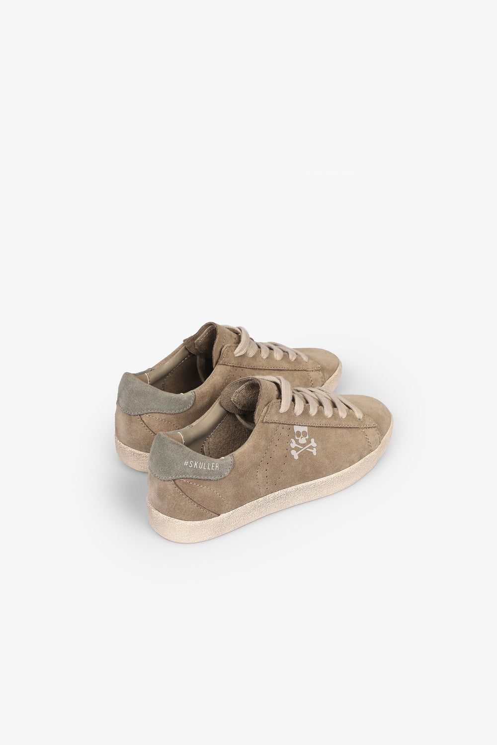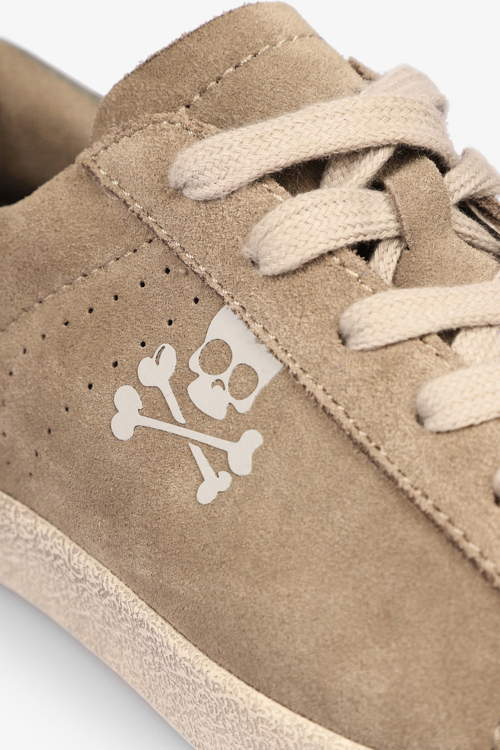 Low top sneakers made from leather and finished in suede. Matching lace-up fastening, rubber soles and perforated skull details on the sides.