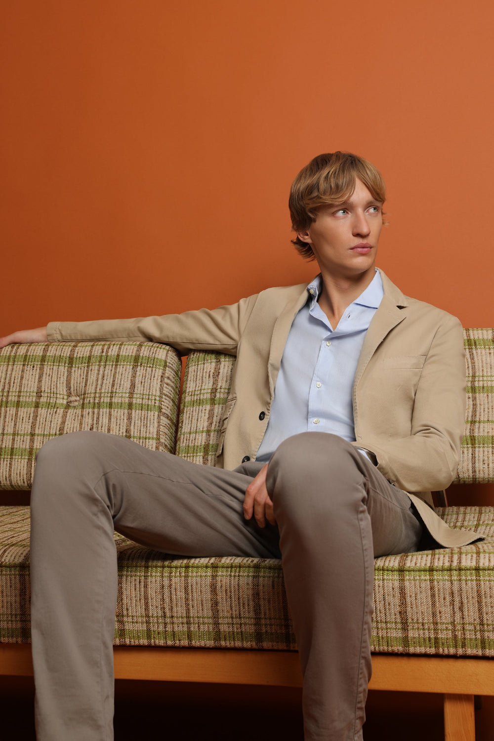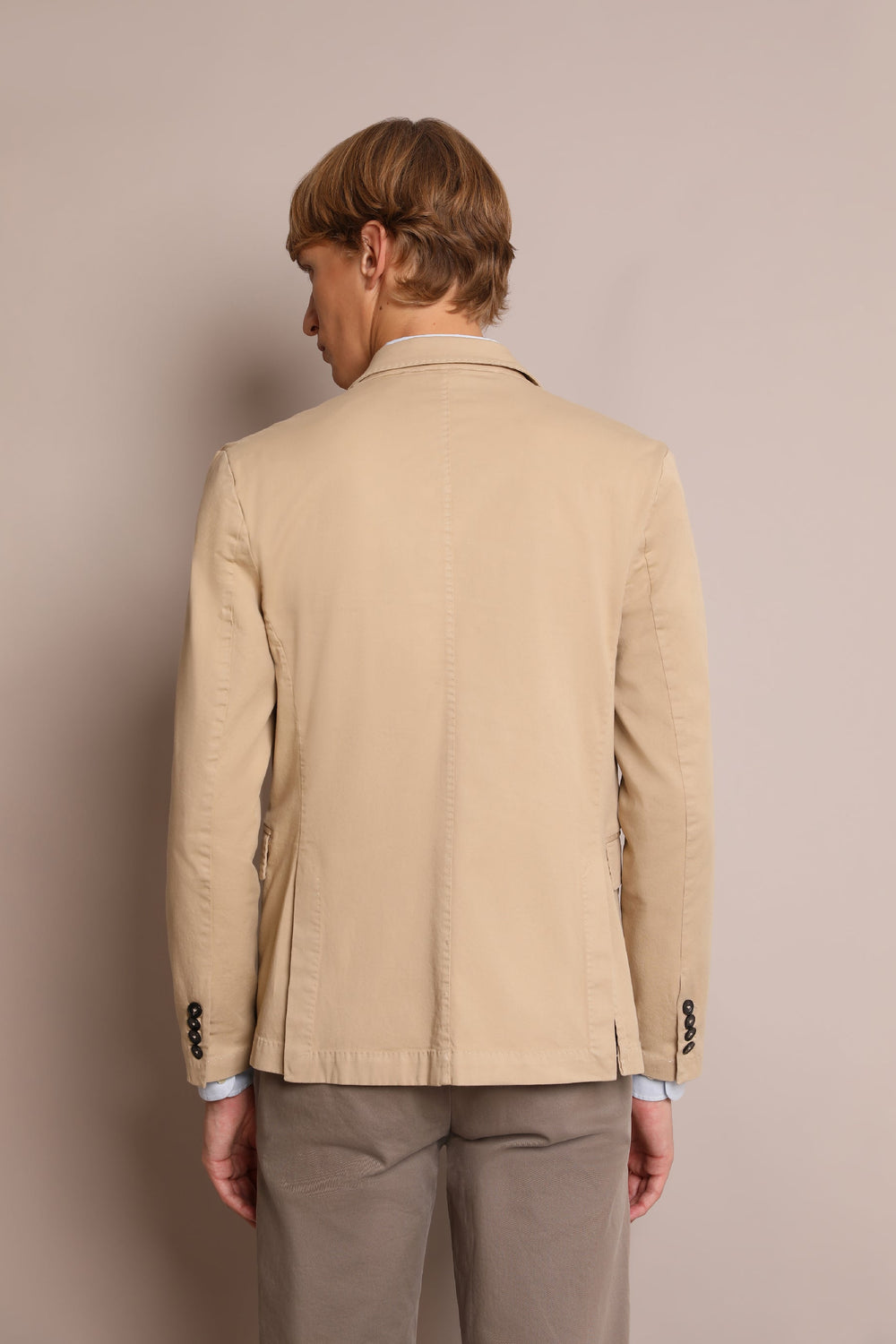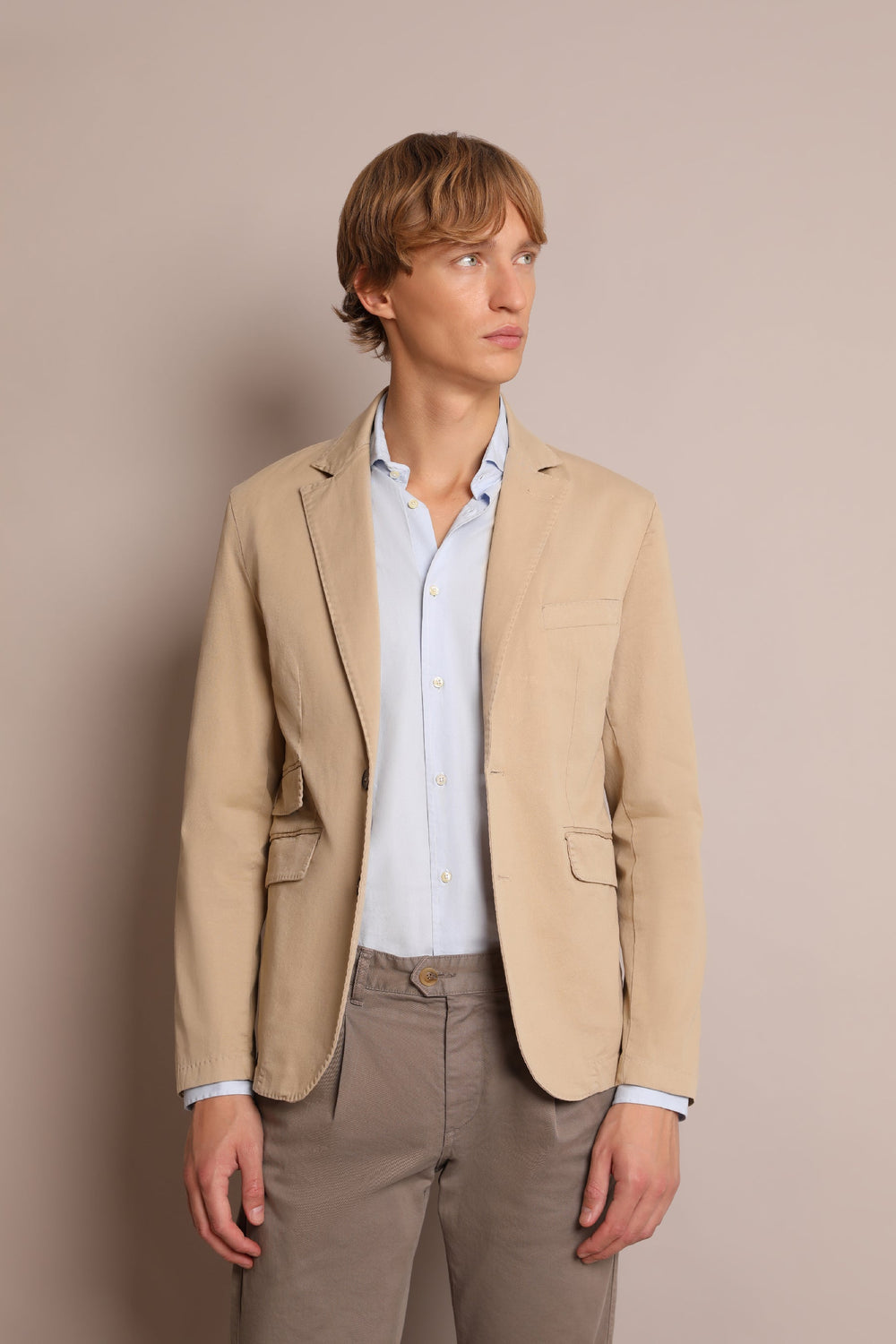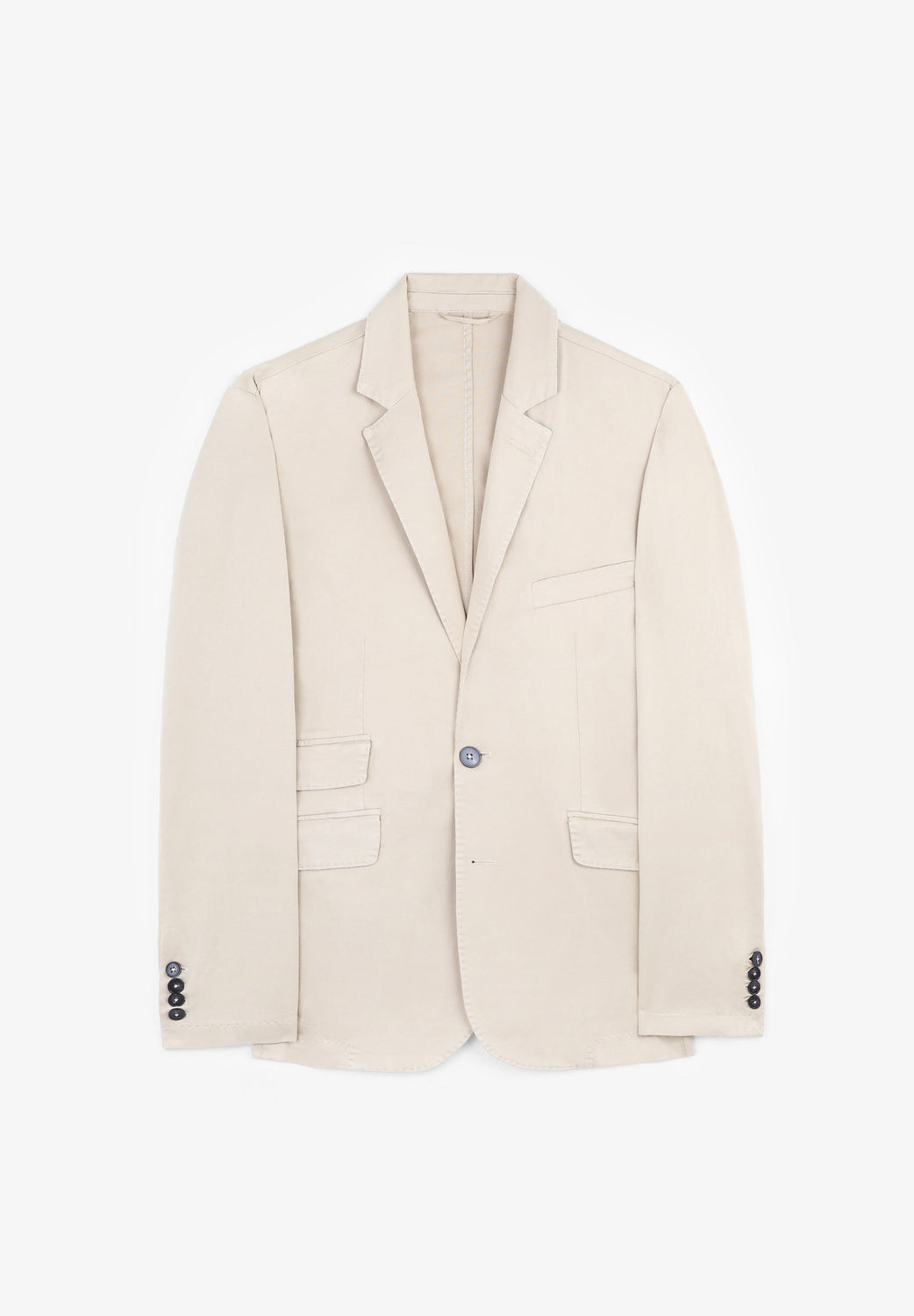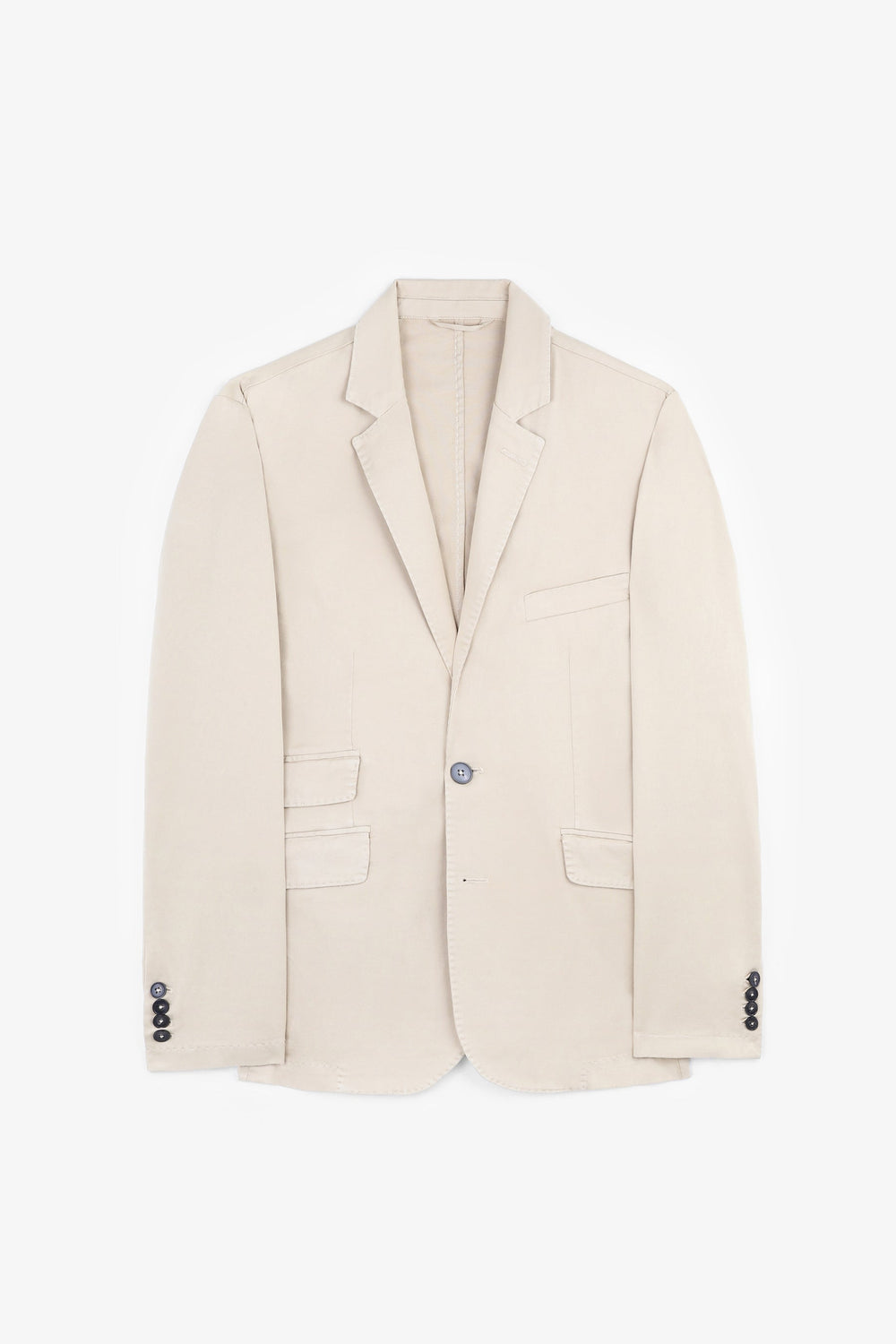 Plain casual blazer made from 100% cotton fabric. Regular fit, lapel collar and button fastening. Long sleeves with buttoned cuffs and jetted pockets with flaps. Jetted pocket on the chest.