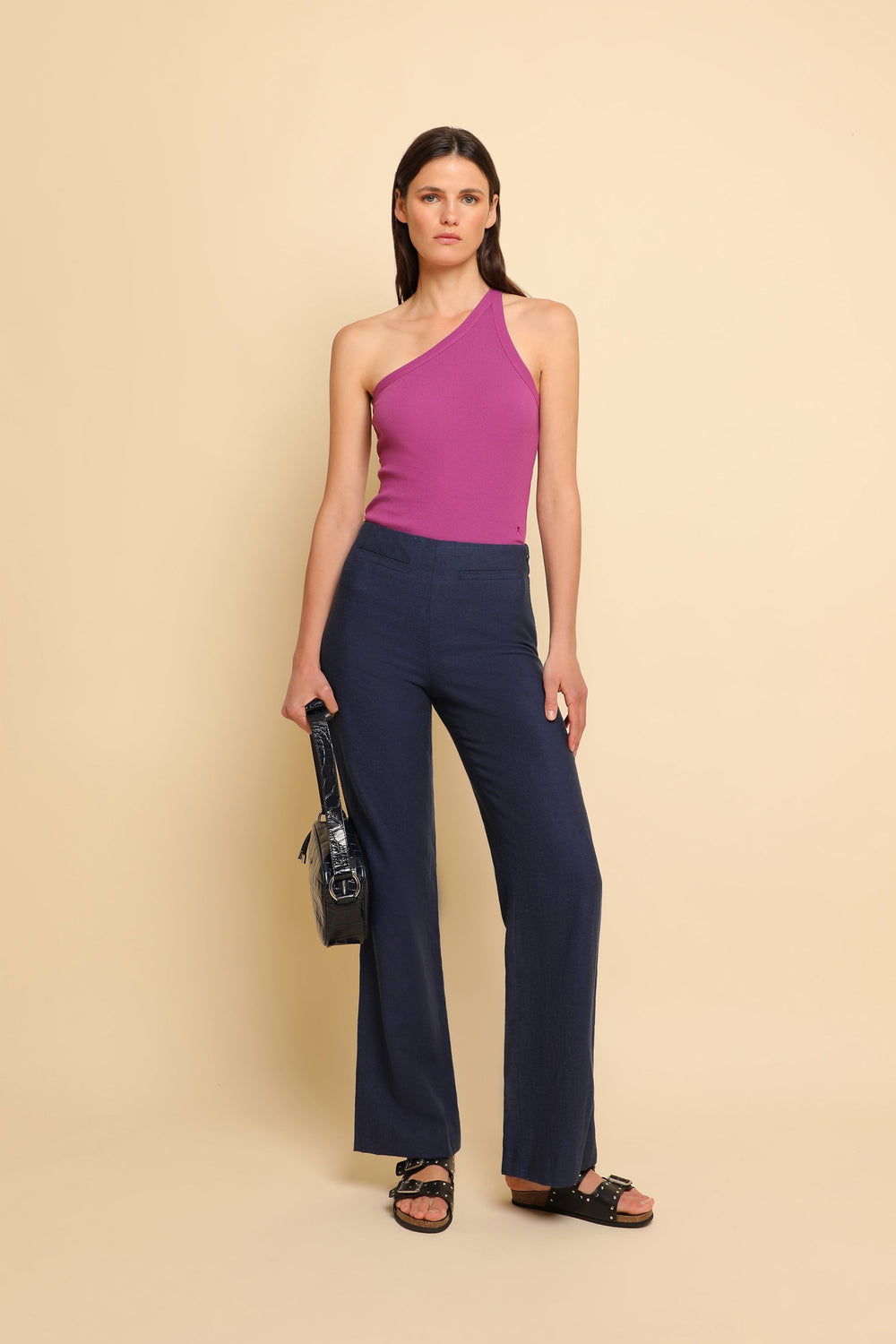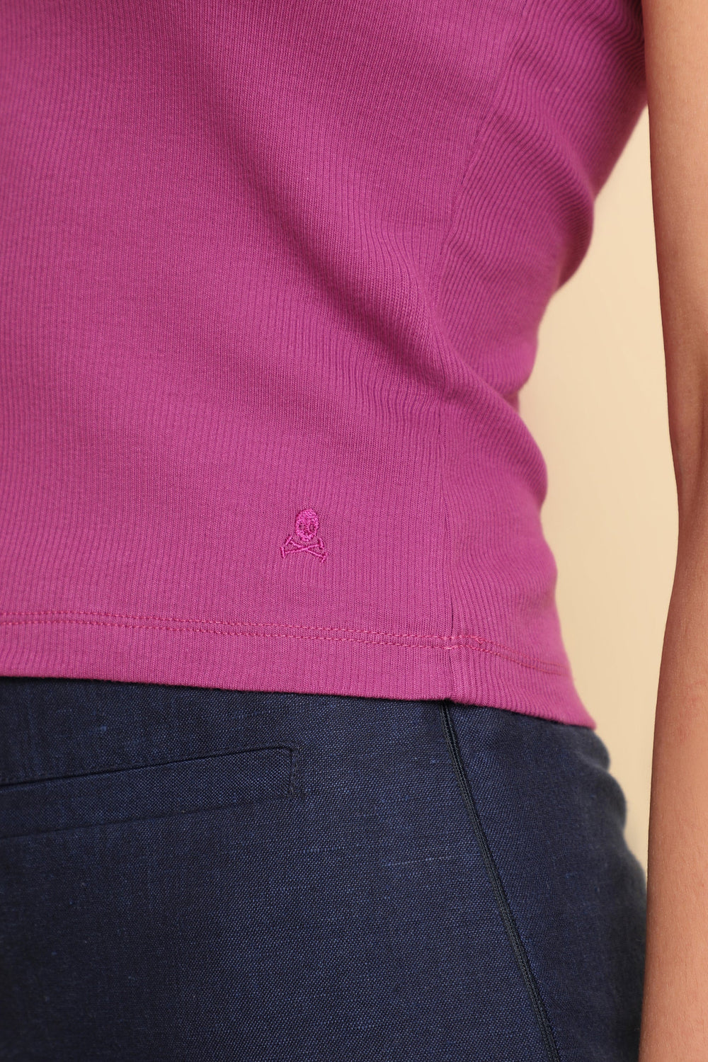 Asymmetric ribbed T-shirt made of 100% cotton. Slim fit, asymmetric sleeve and crossed strap detail at the back.