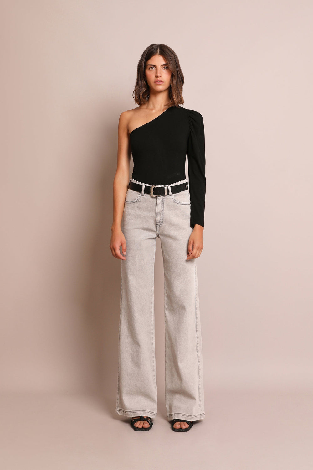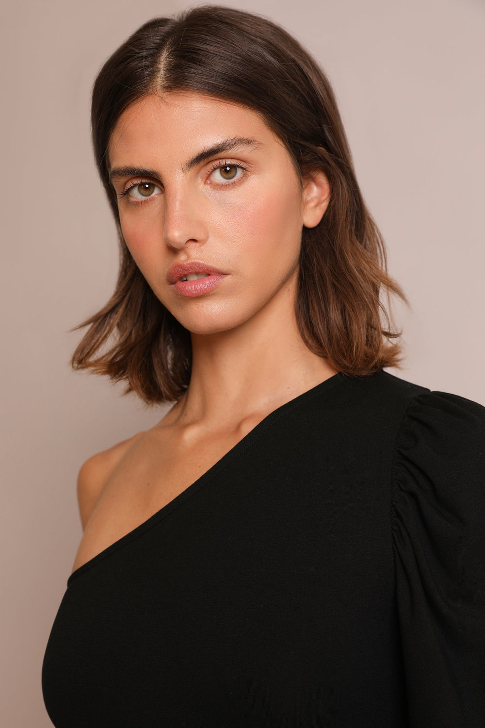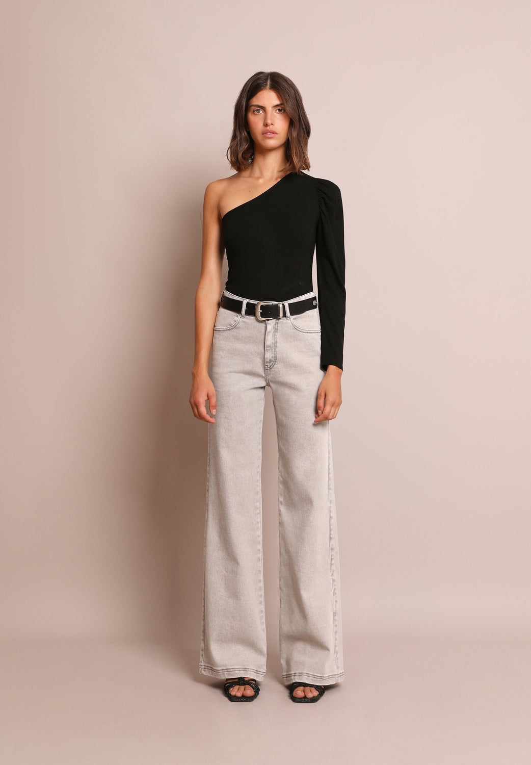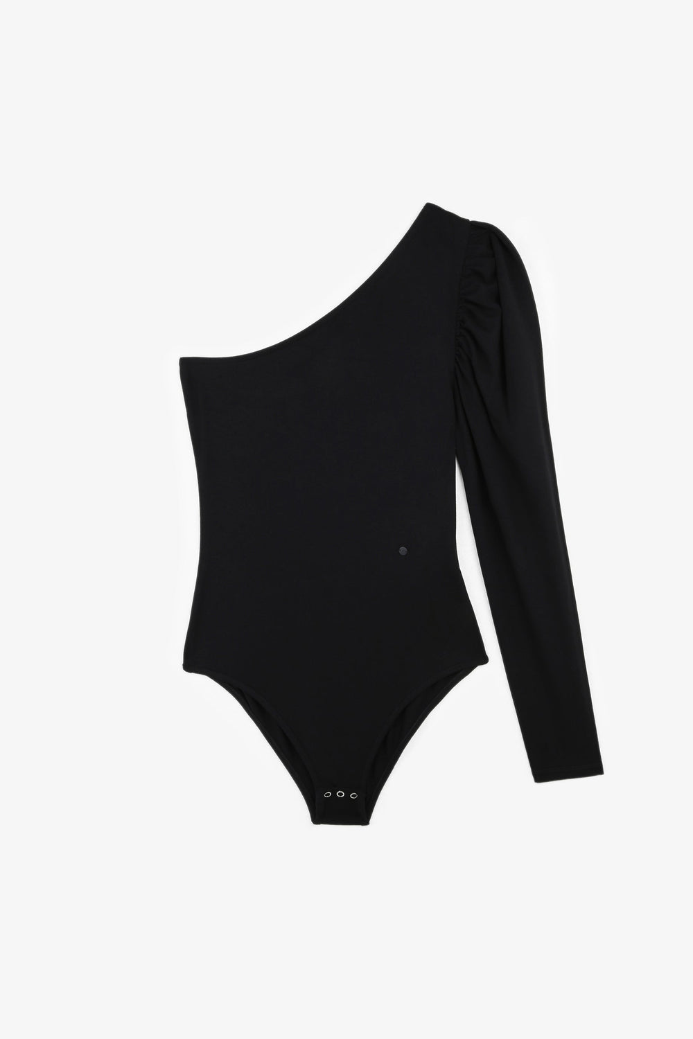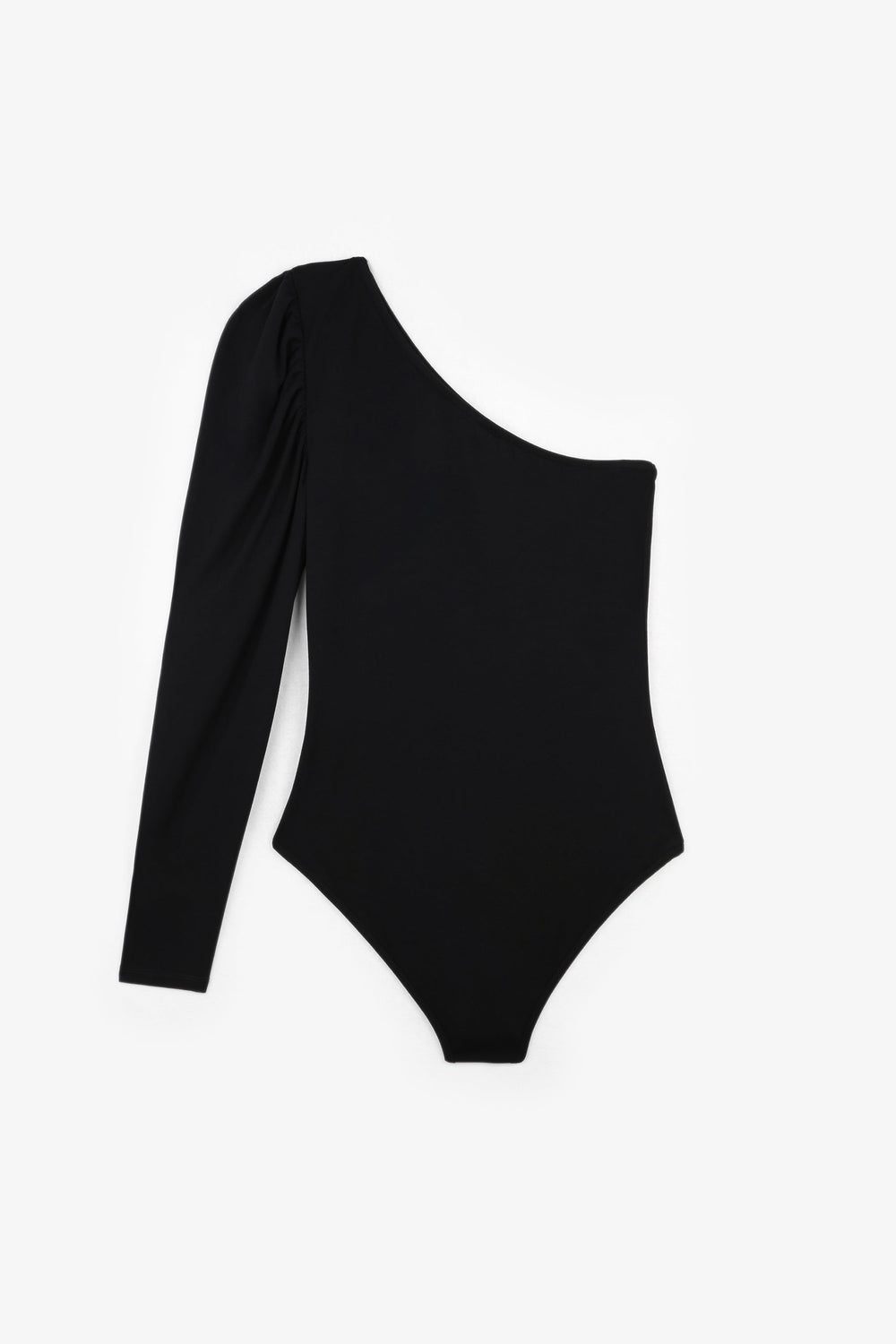 Asymmetric bodysuit made of elasticated fabric. Slim fit, asymmetric neckline and slightly puff sleeves. Fastens at the bottom.