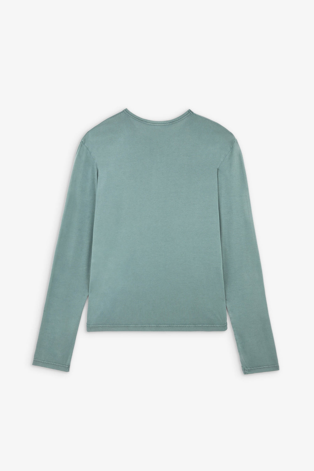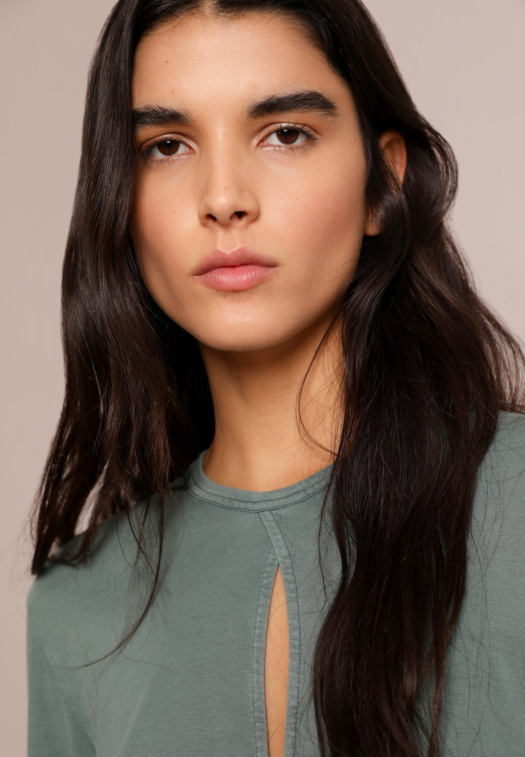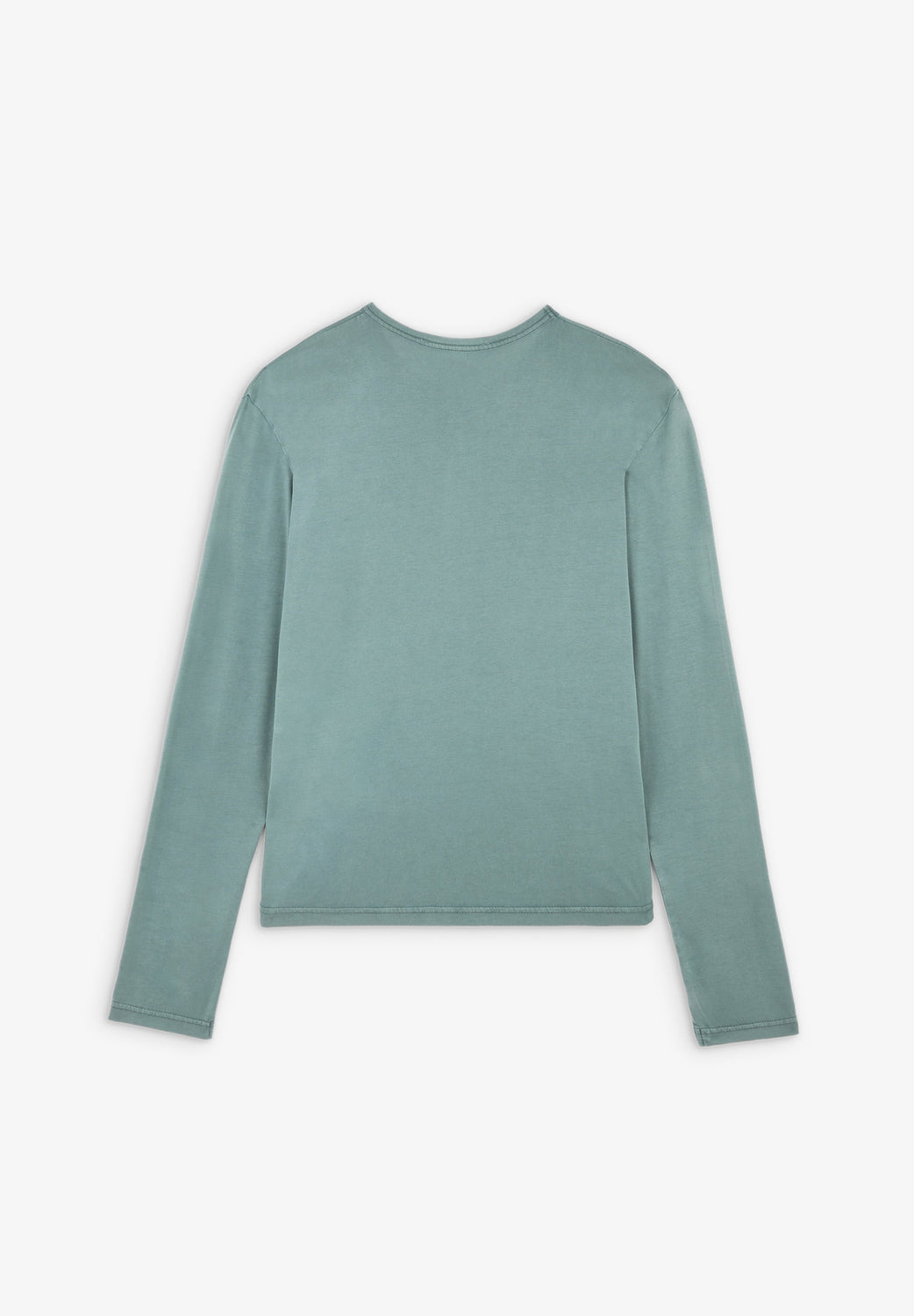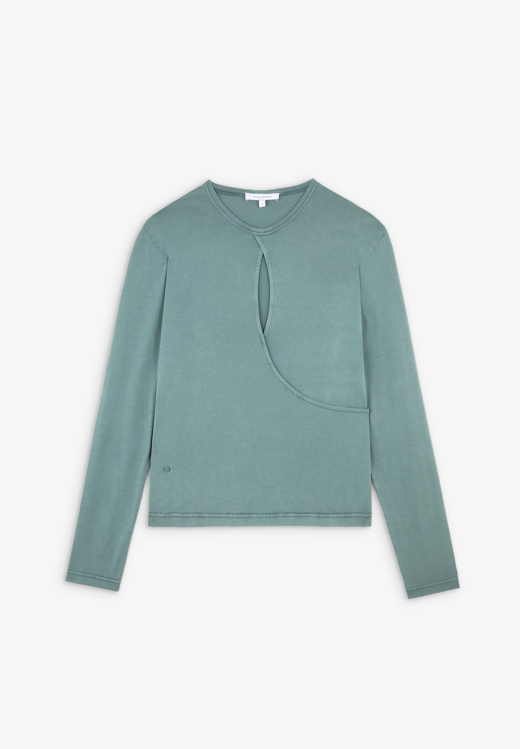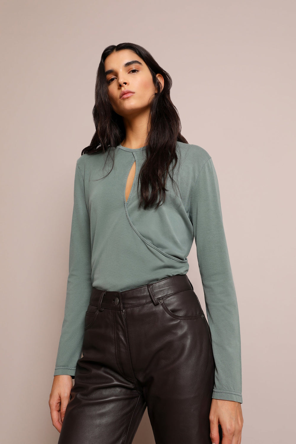 Faded T-shirt with a crossover detail on the front in an organic cotton blend. Regular fit, round neck and long sleeves. Cut-out at the neckline.