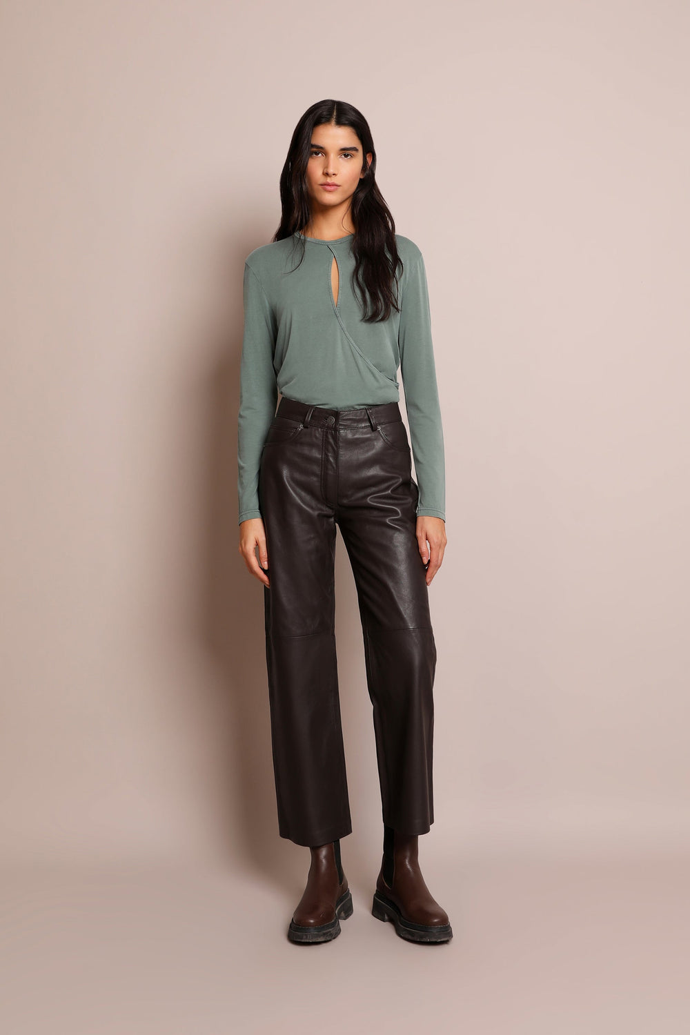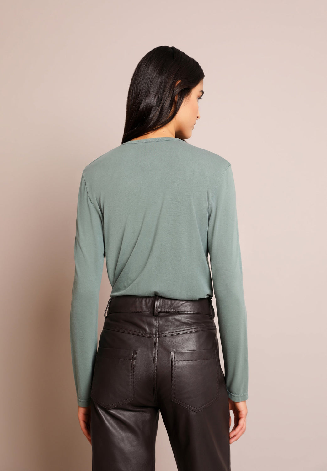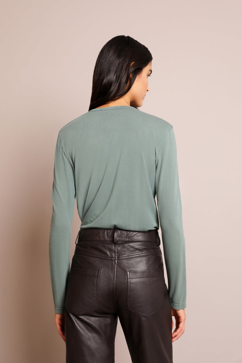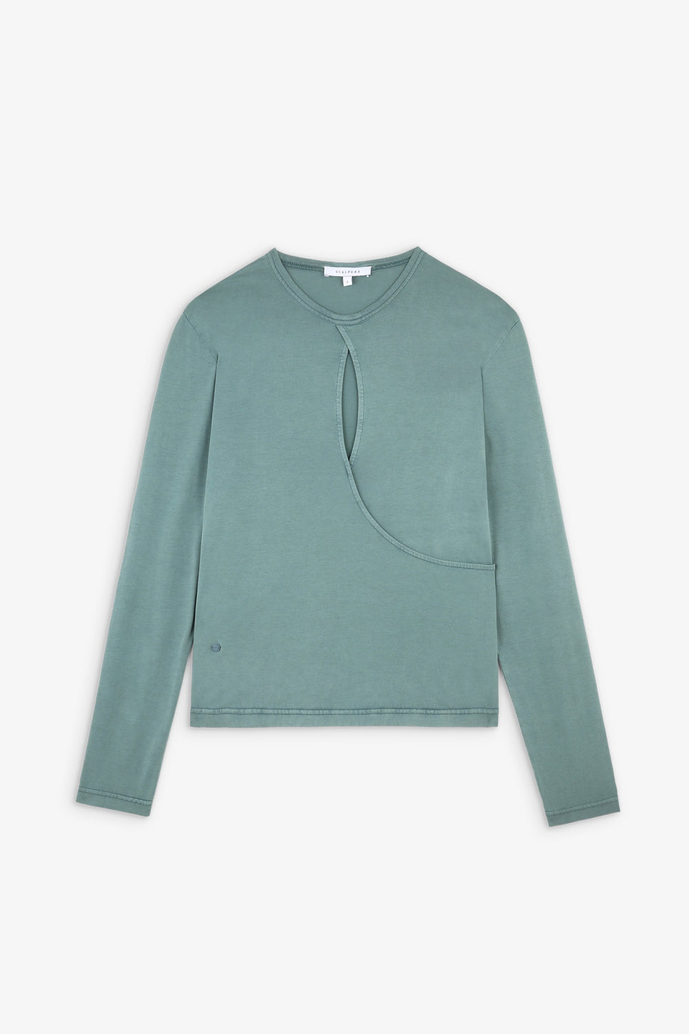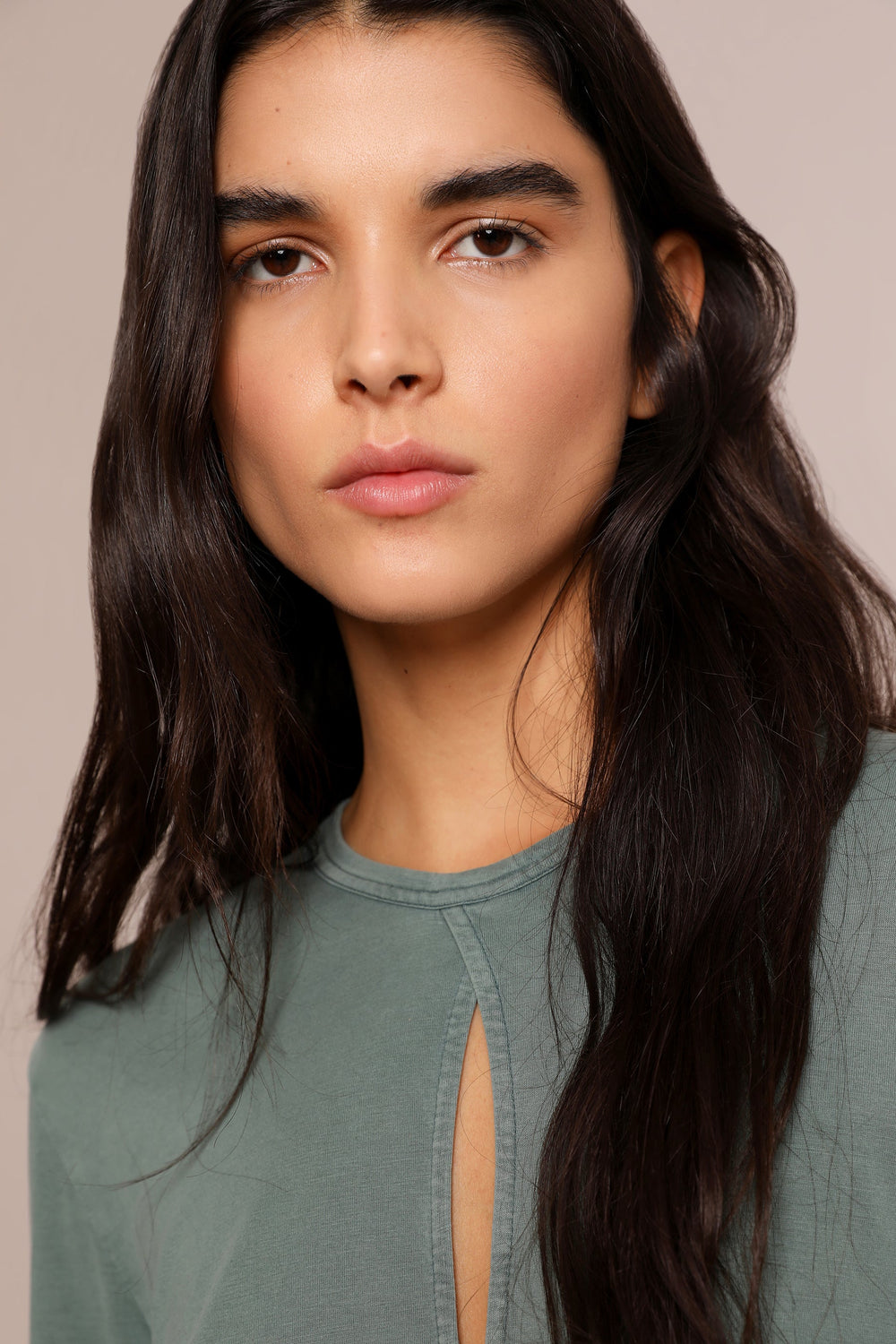 Faded T-shirt with a crossover detail on the front in an organic cotton blend. Regular fit, round neck and long sleeves. Cut-out at the neckline.