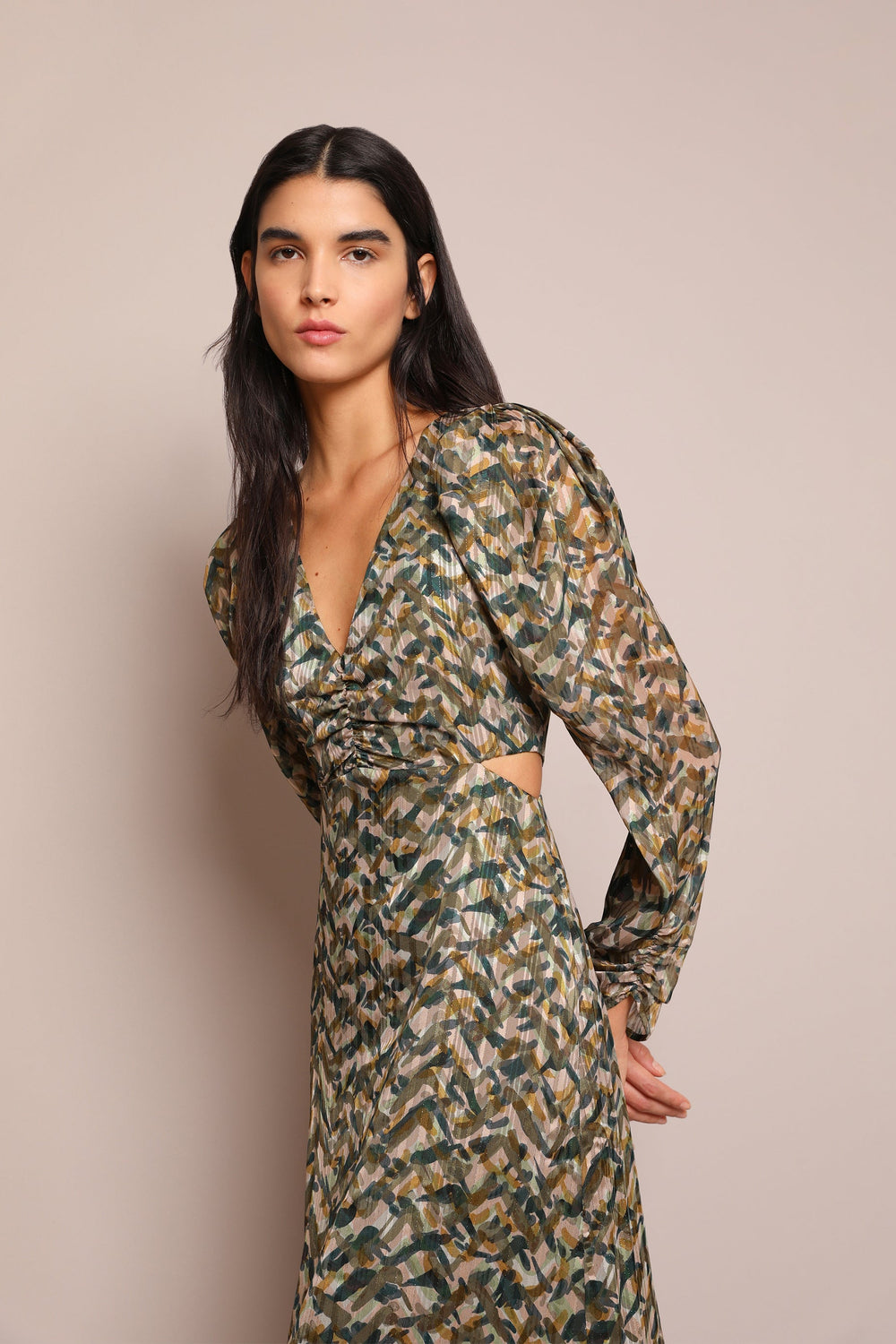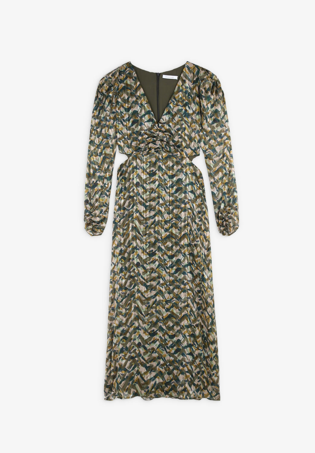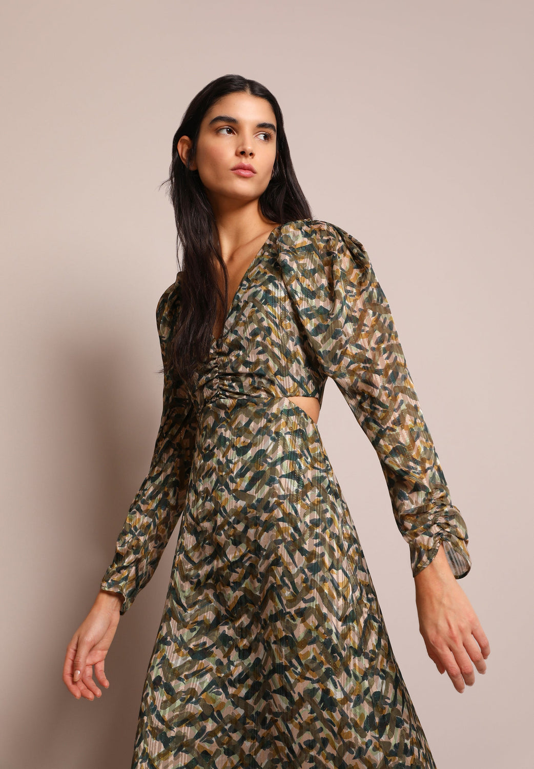 Midi cut out dress made of flowing fabric, back zip fastening, V-neck, long sleeves, cut out waist and metallic thread detail.