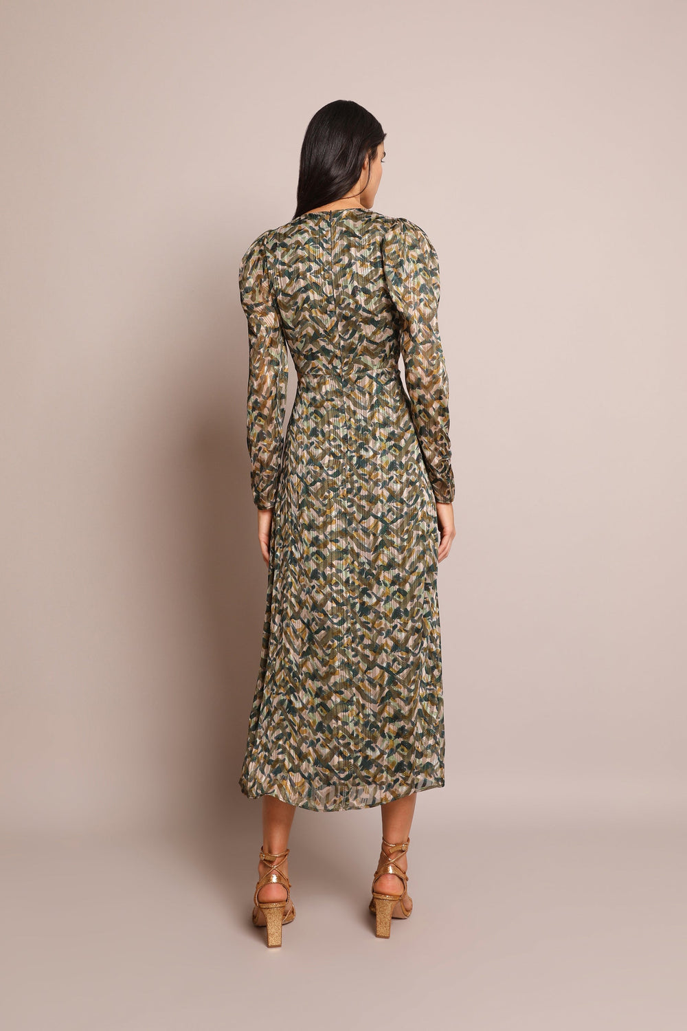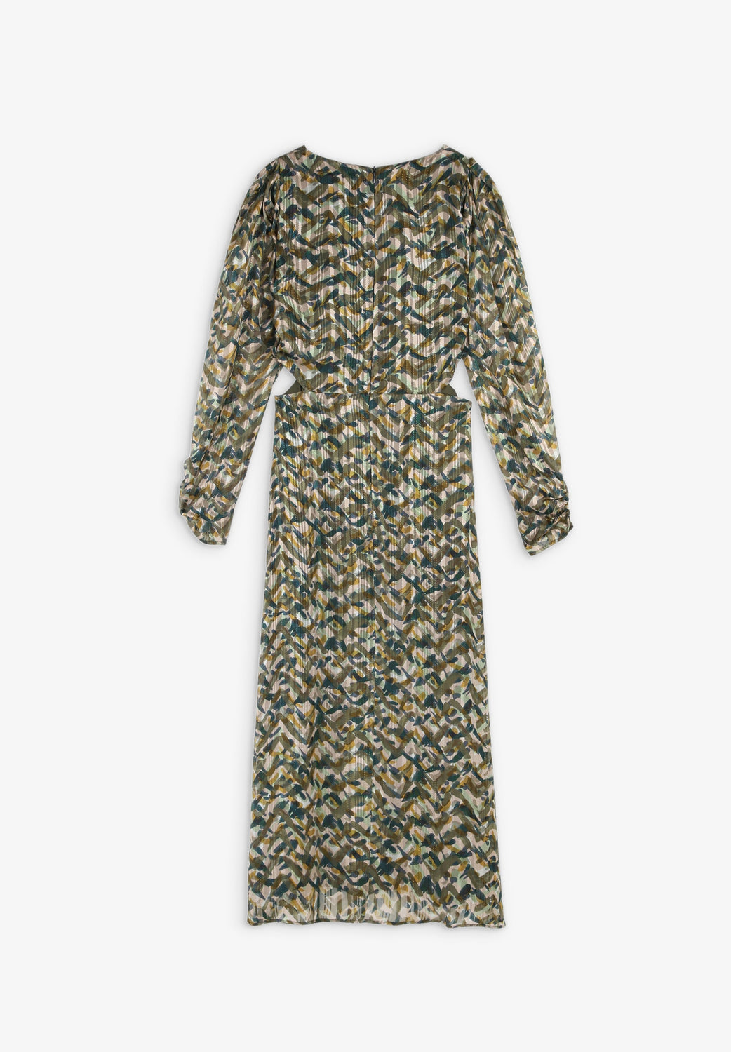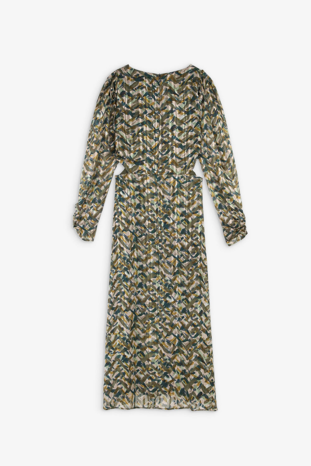 Midi cut out dress made of flowing fabric, back zip fastening, V-neck, long sleeves, cut out waist and metallic thread detail.