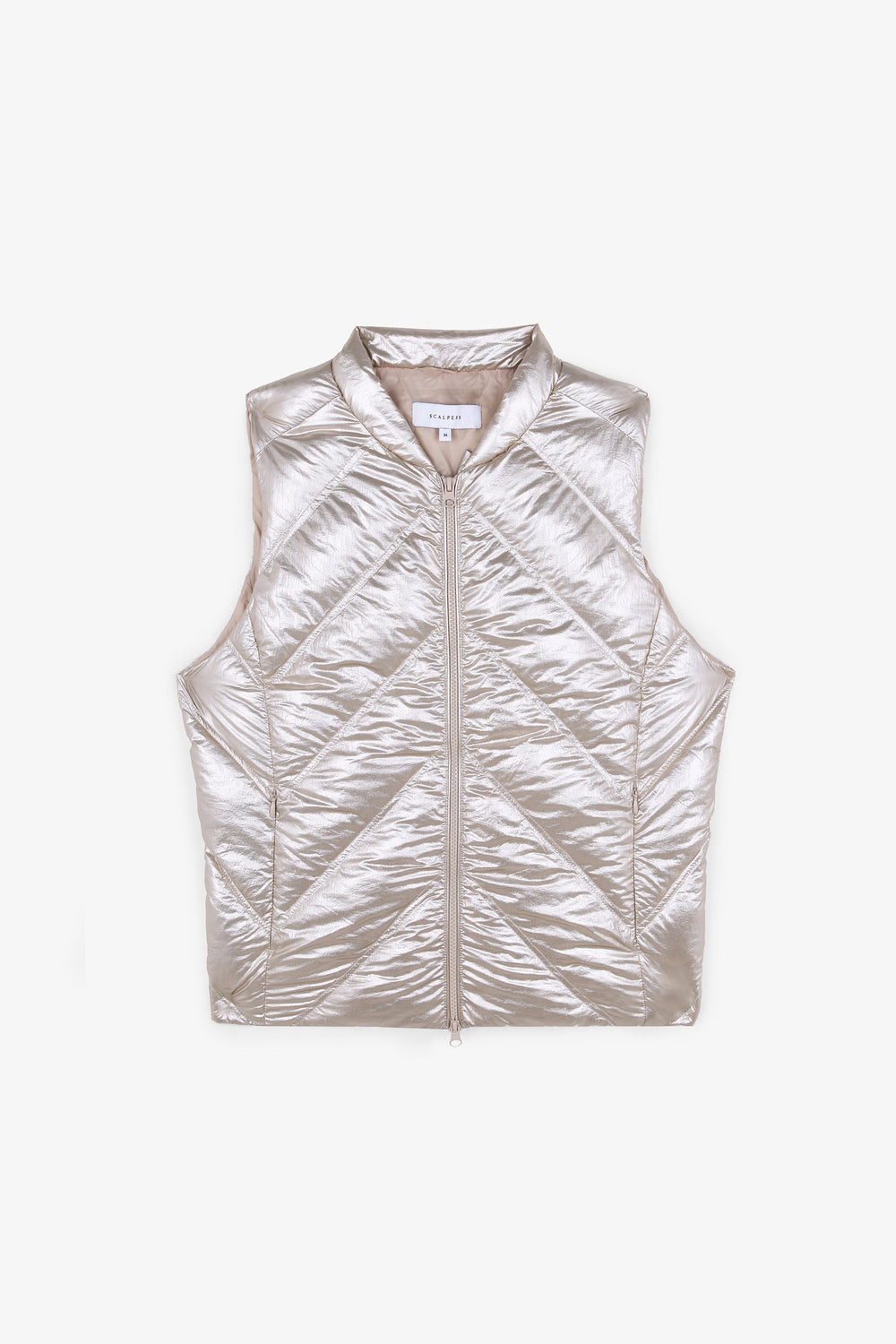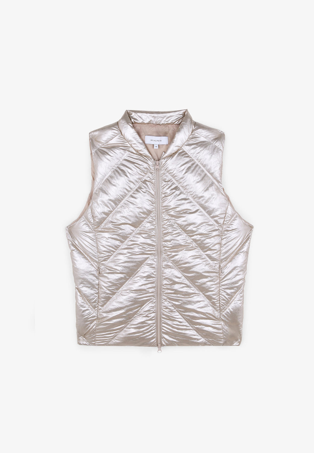 Puffer vest with diagonal padding.